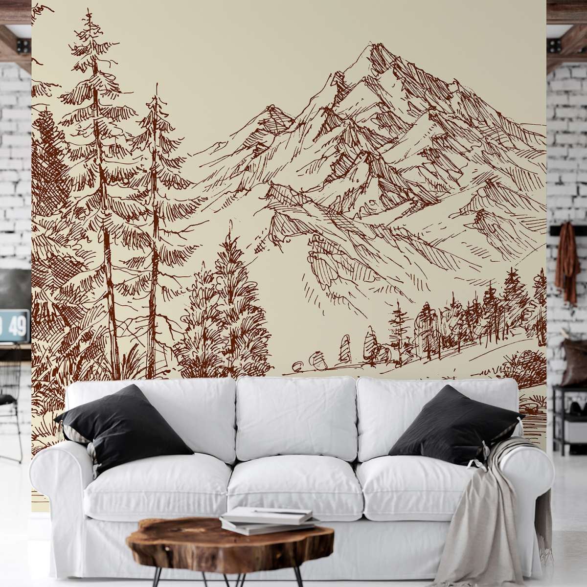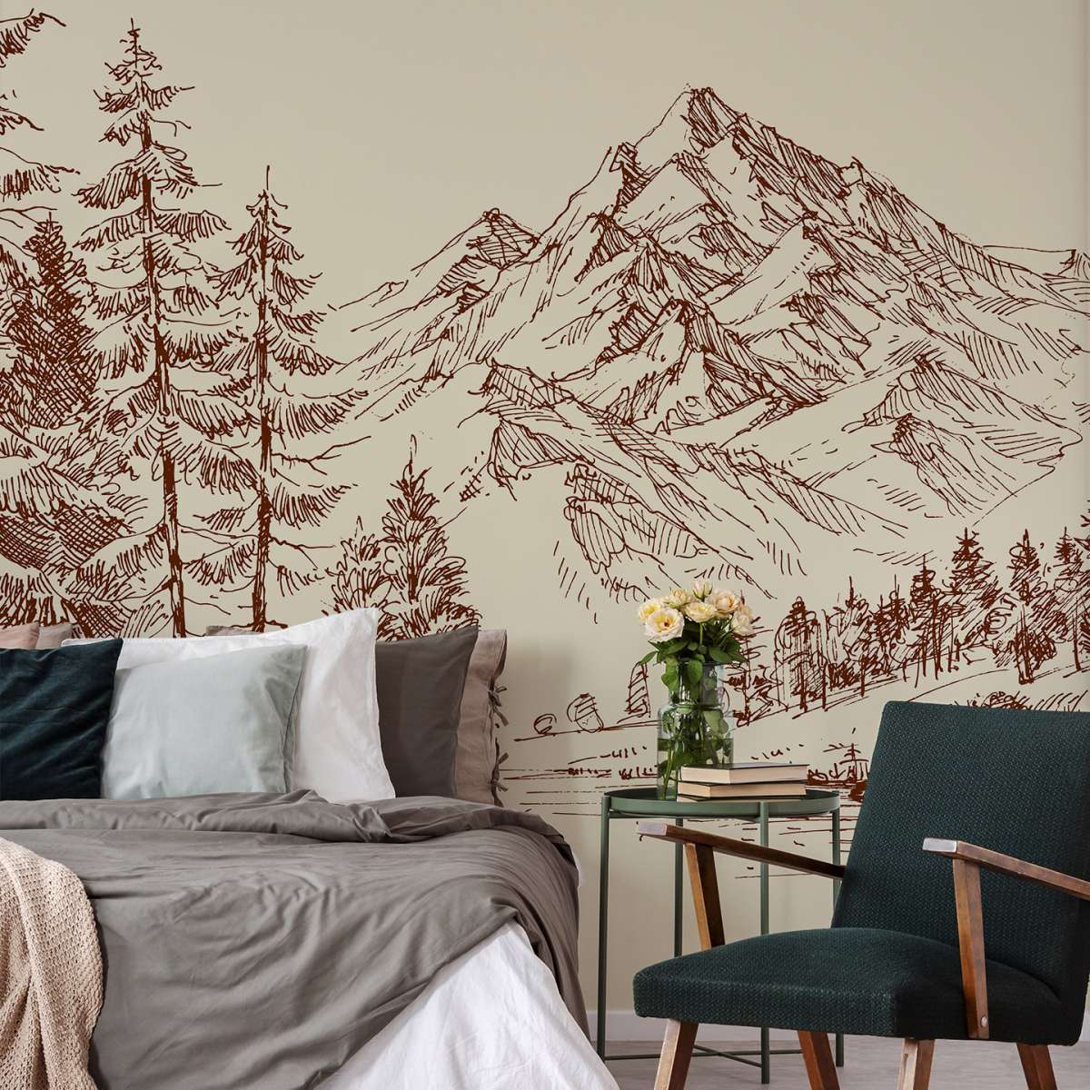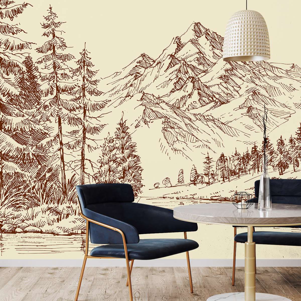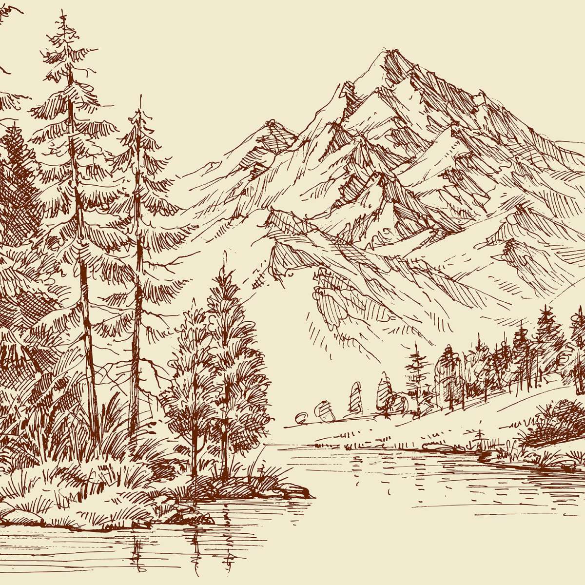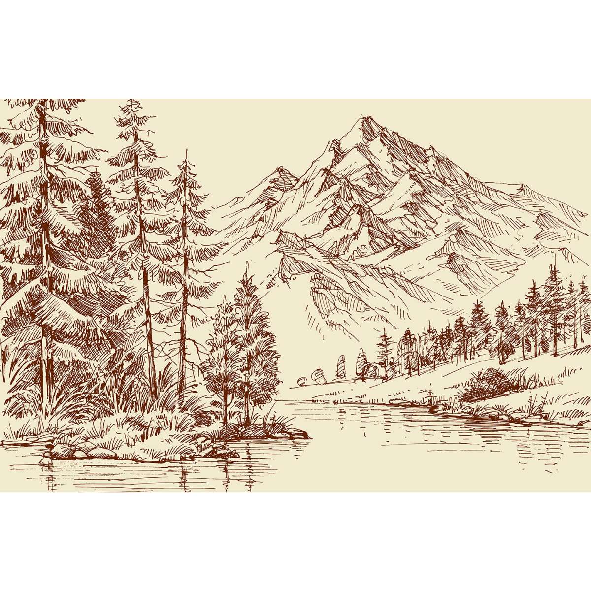 Alpská krajina a borový les - skica