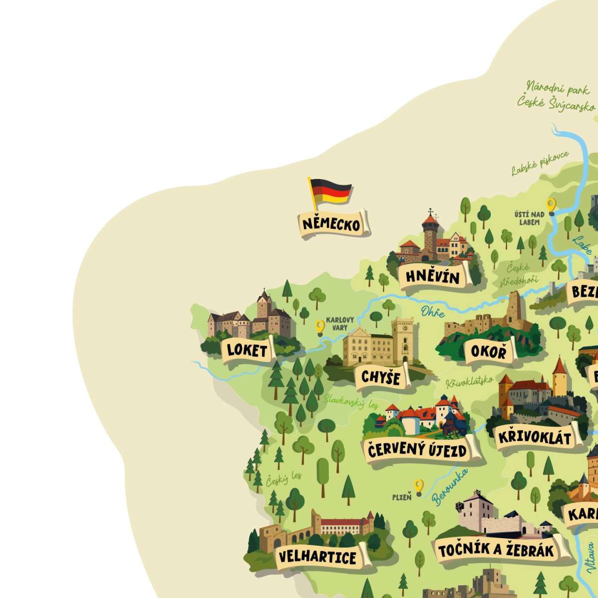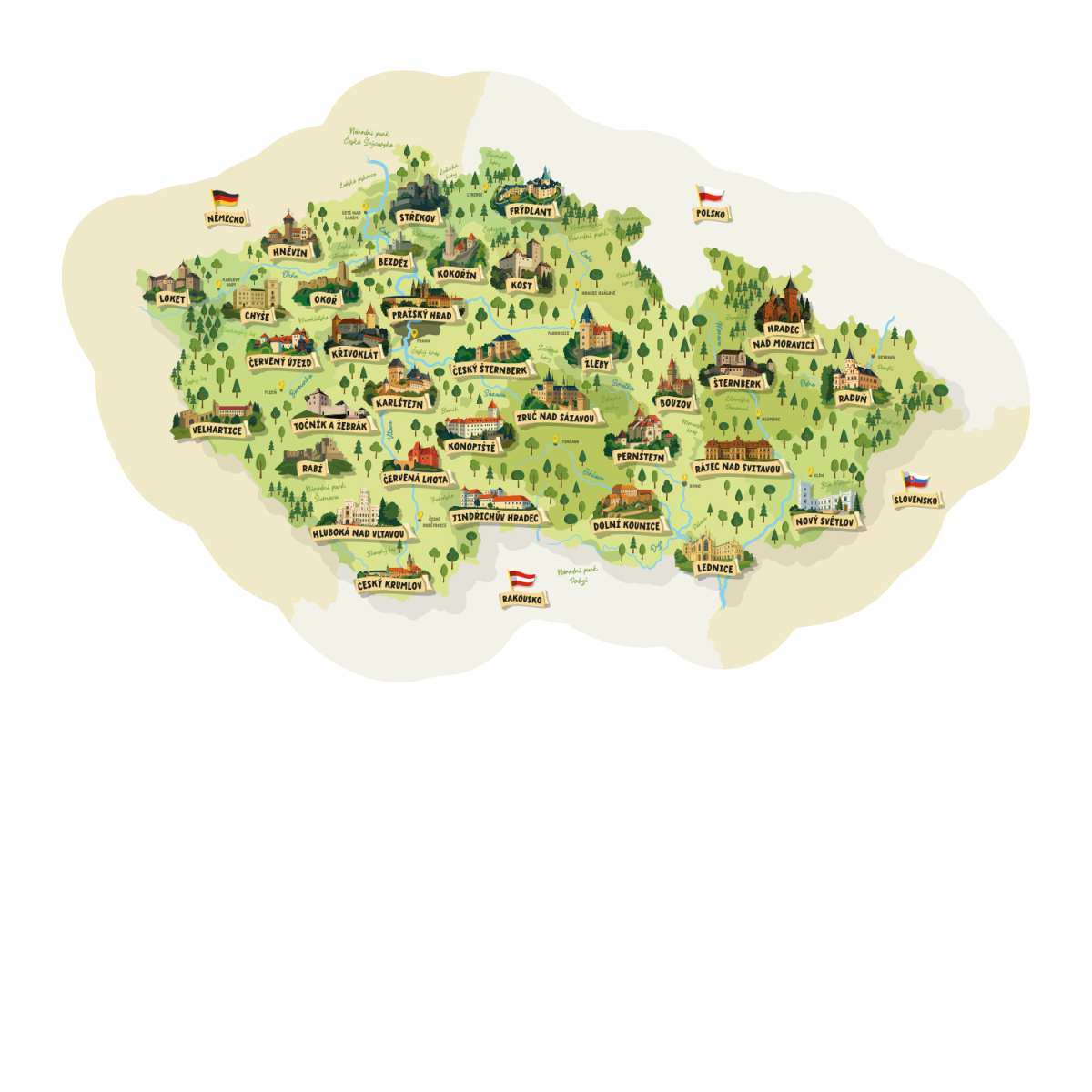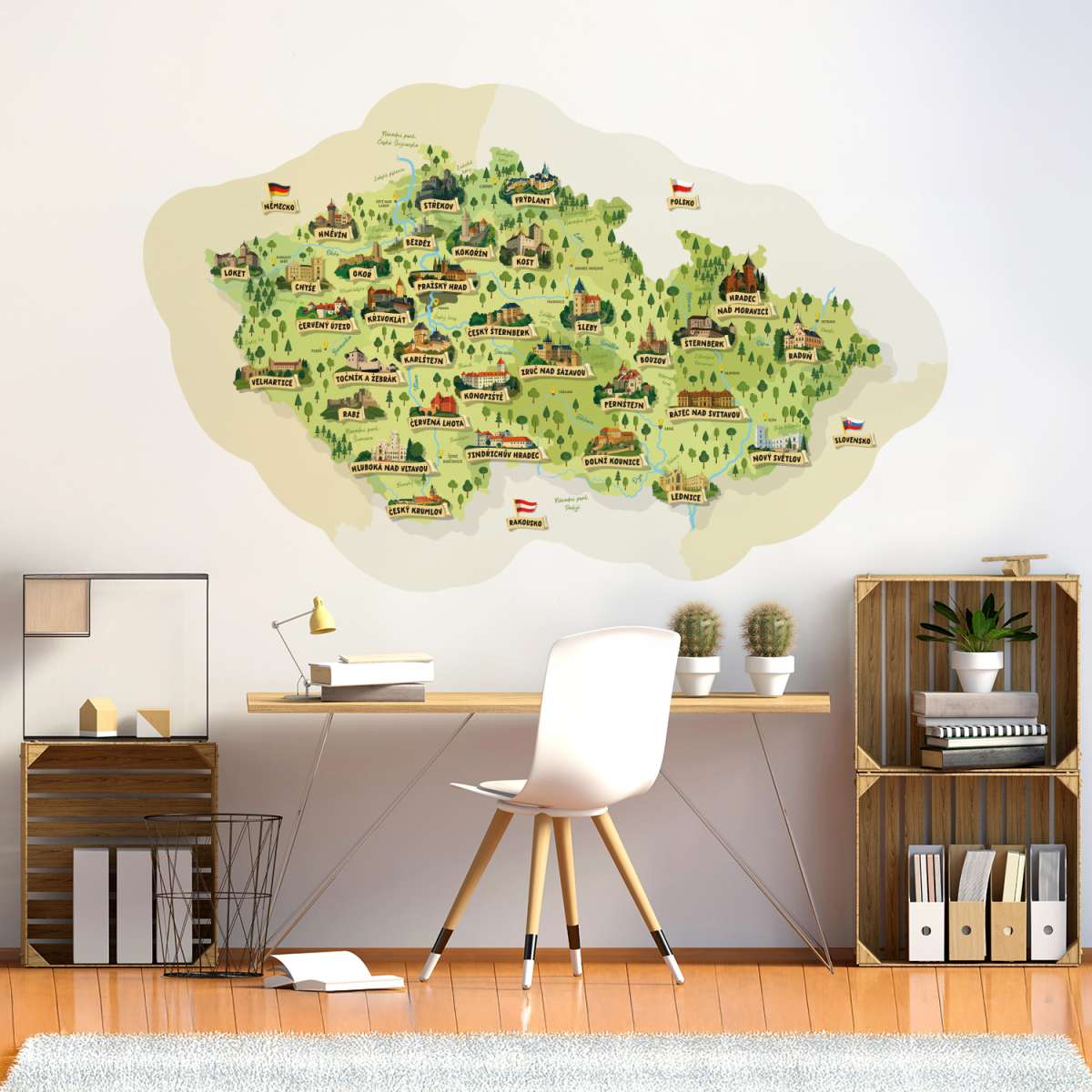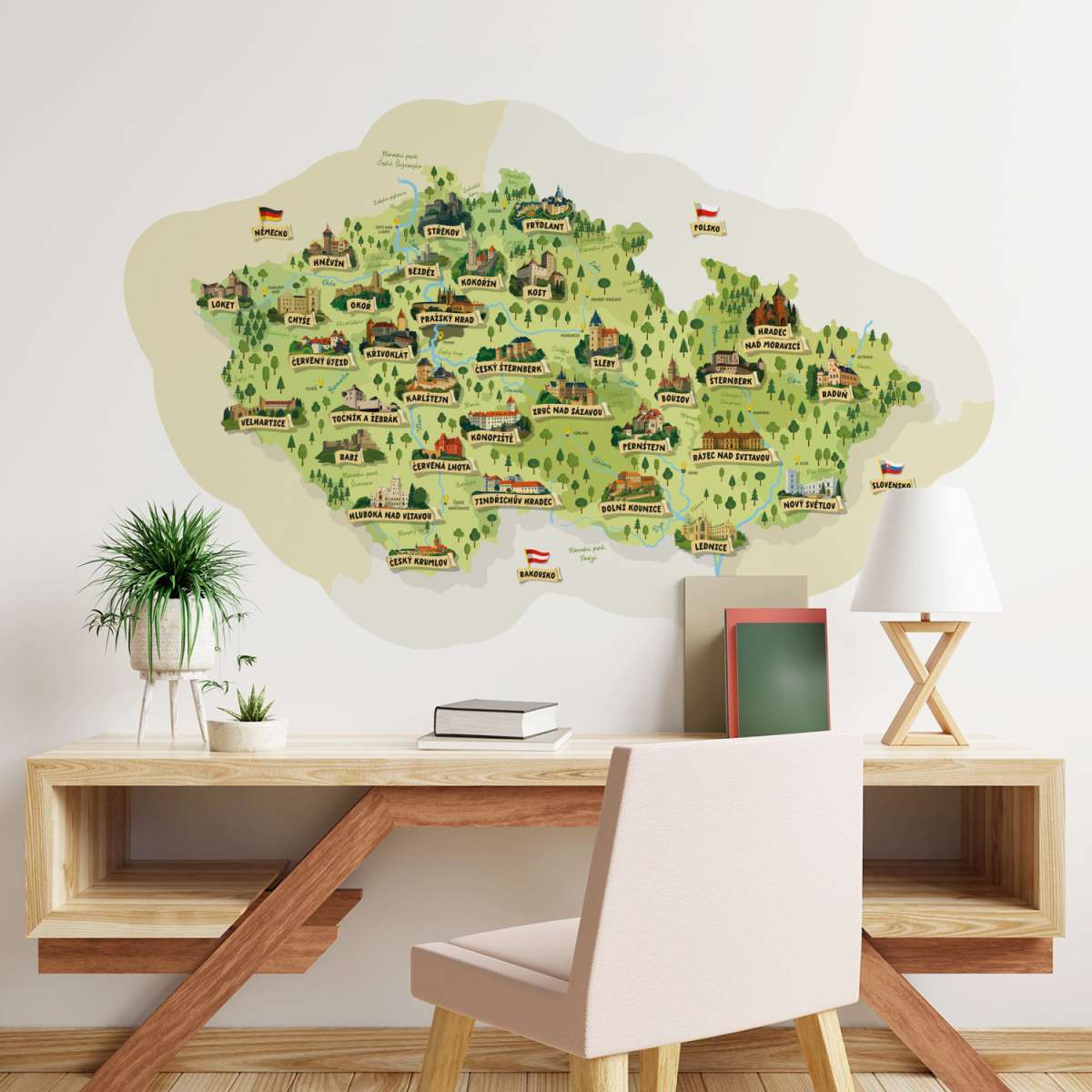 Objevujte krásy Česka hravě! Samolepka na stěnu s mapou hradů a zámků, kterou si děti mohou snadno nalepit a označit místa, která navštívily.