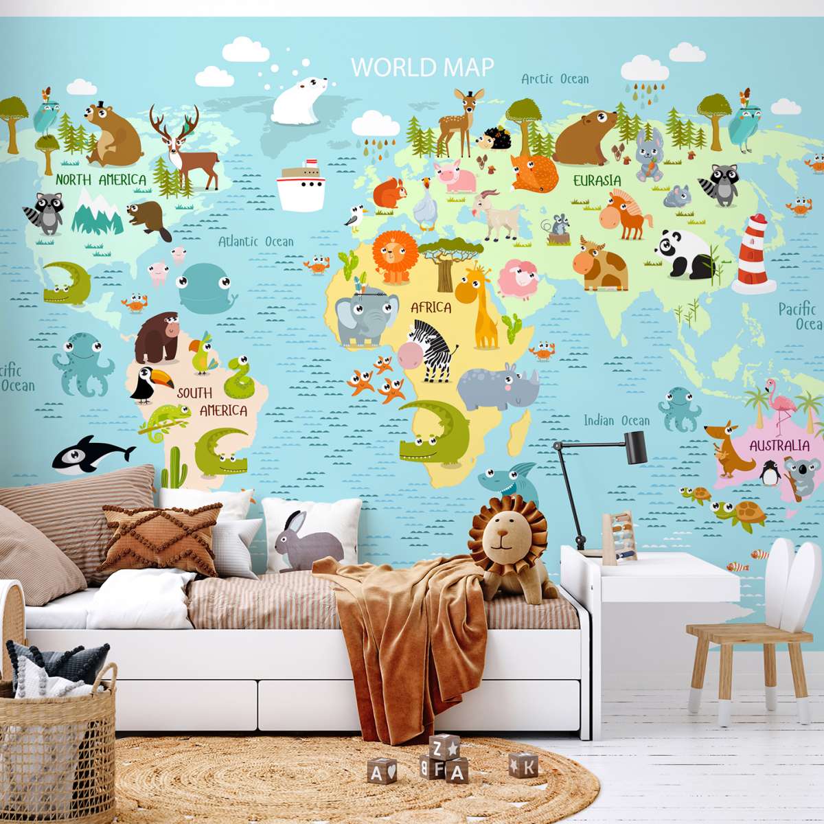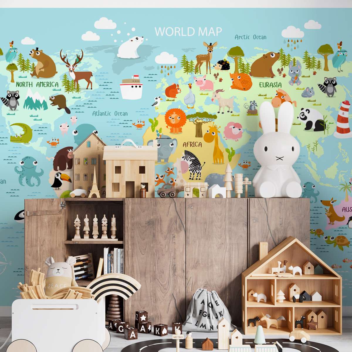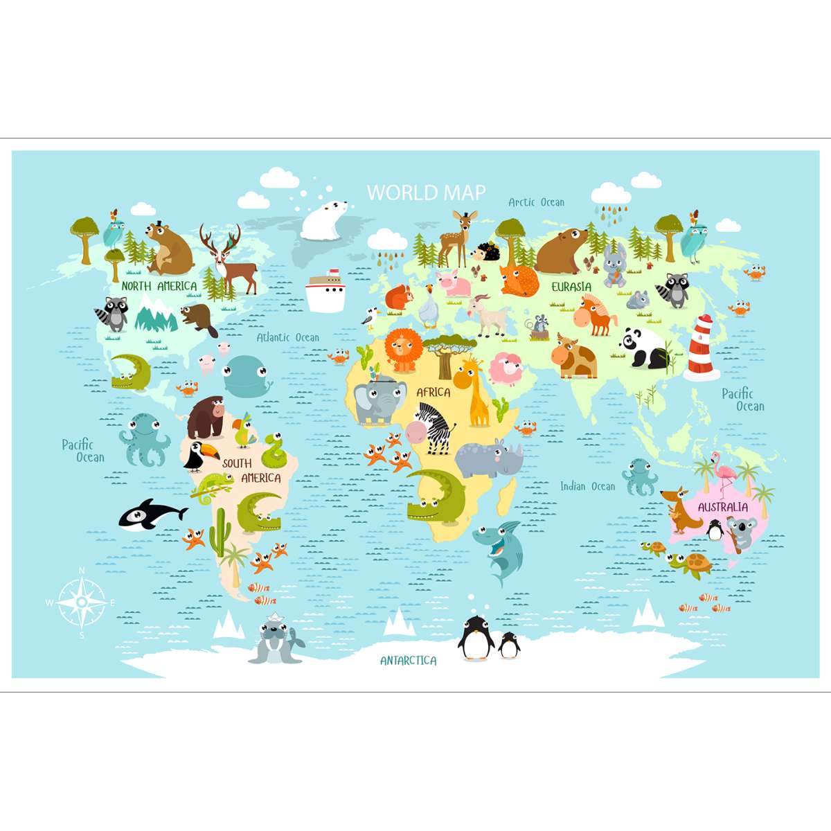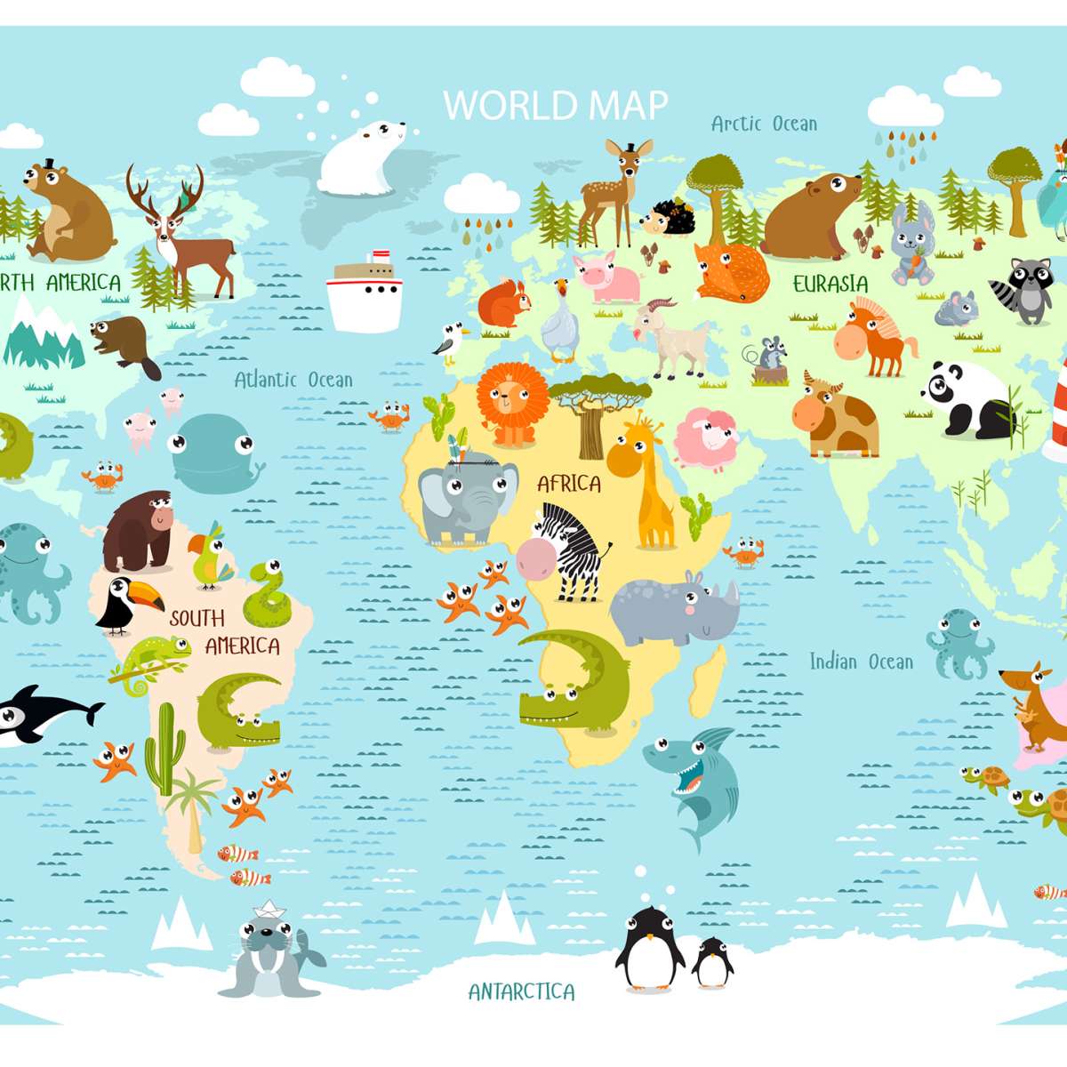 Dětská mapa světa s kreslenými zvířátky - ilustrace