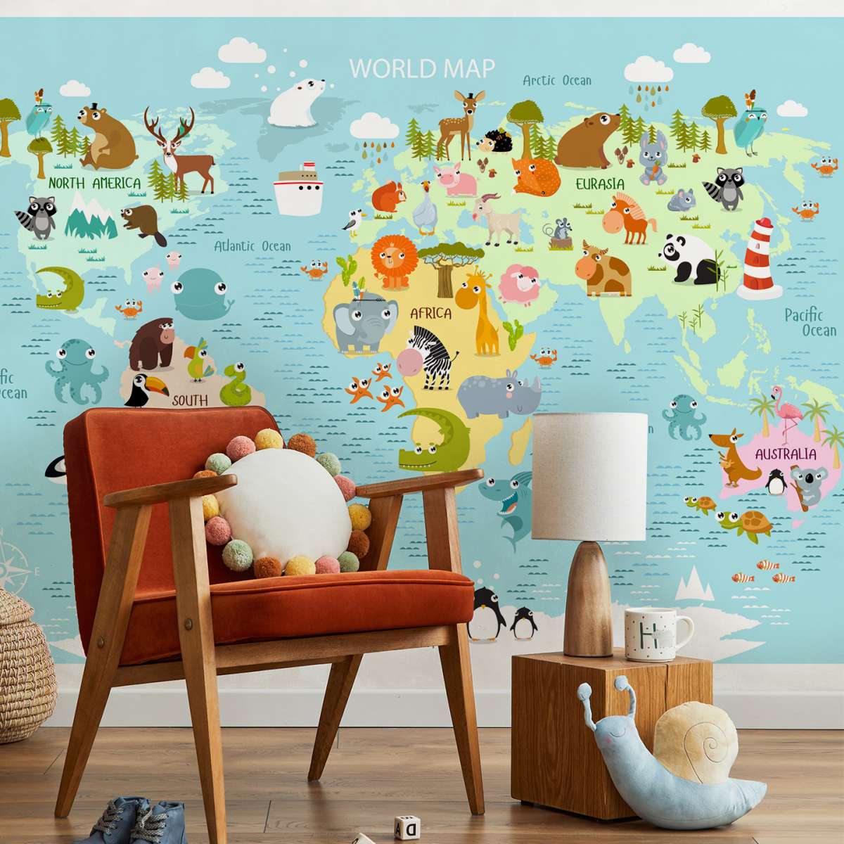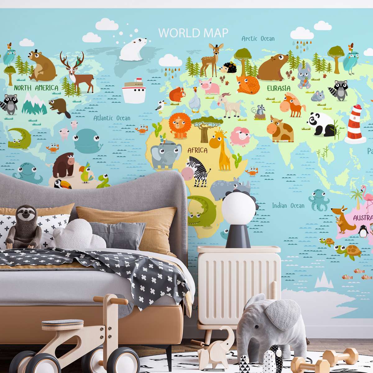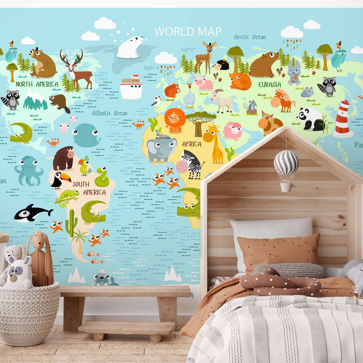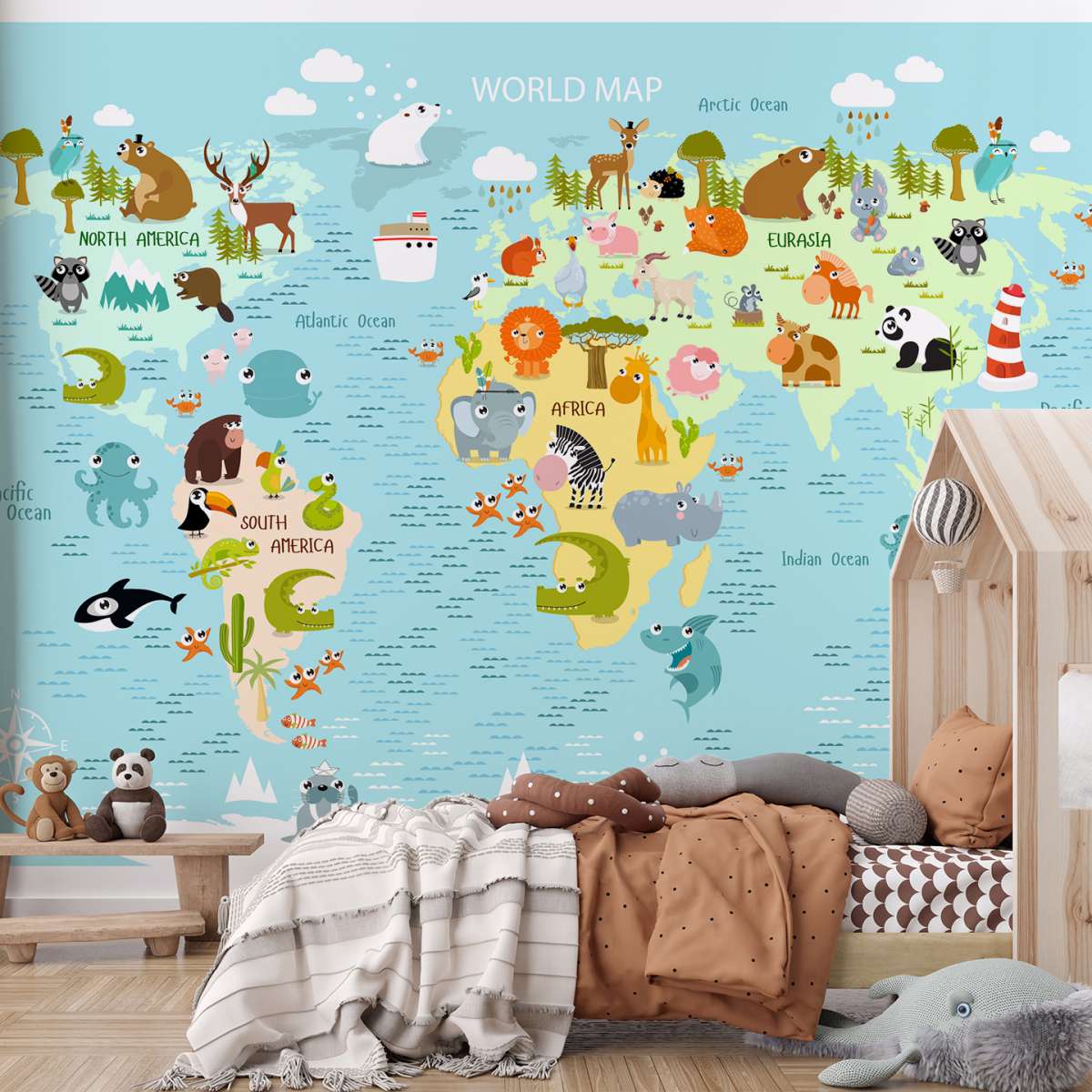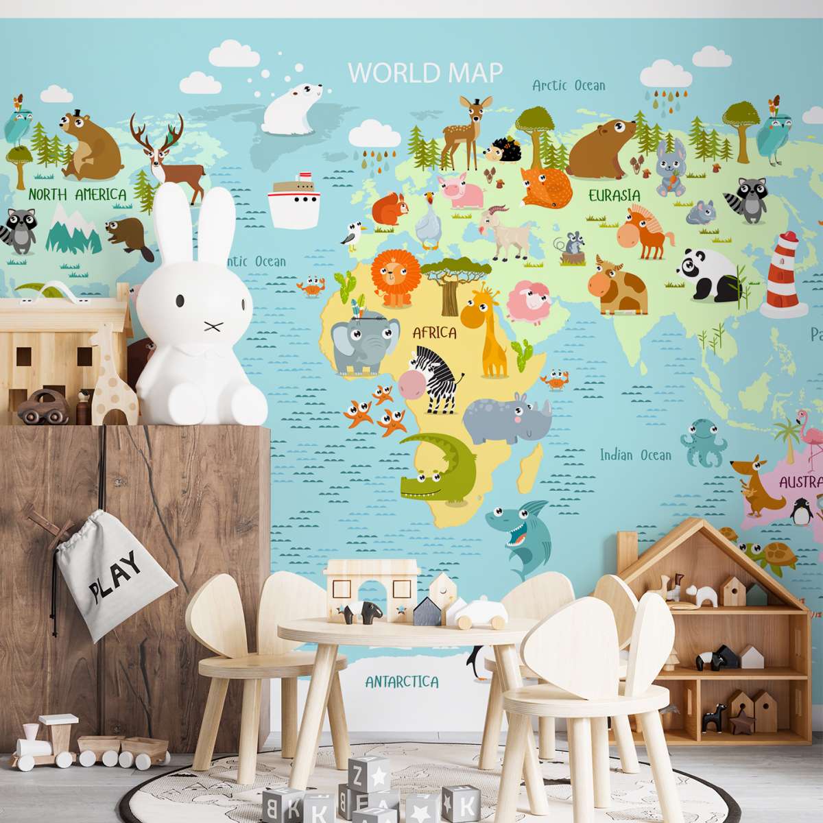 Dětská mapa světa s kreslenými zvířátky - ilustrace