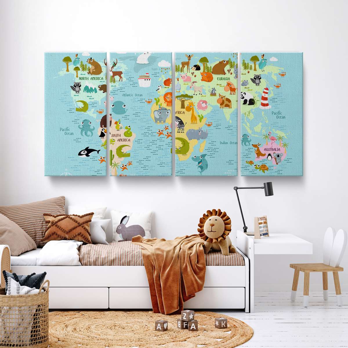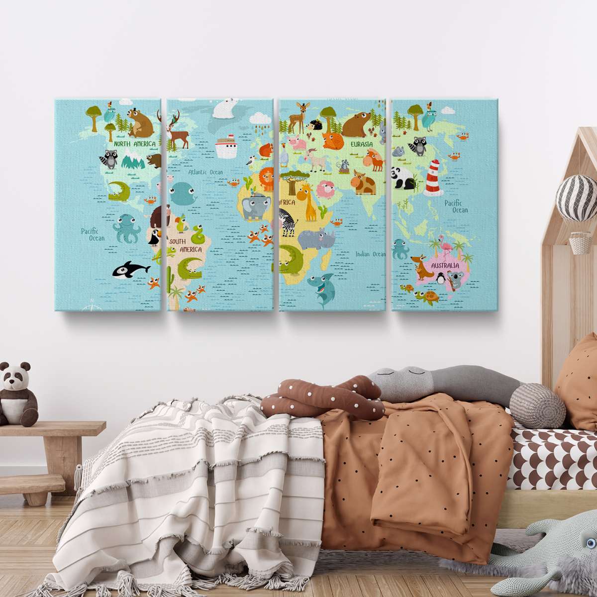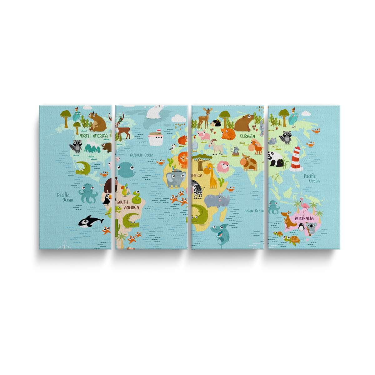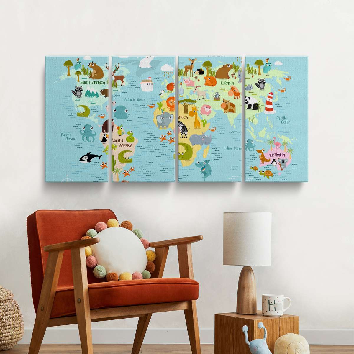 Dětská mapa světa s kreslenými zvířátky - ilustrace