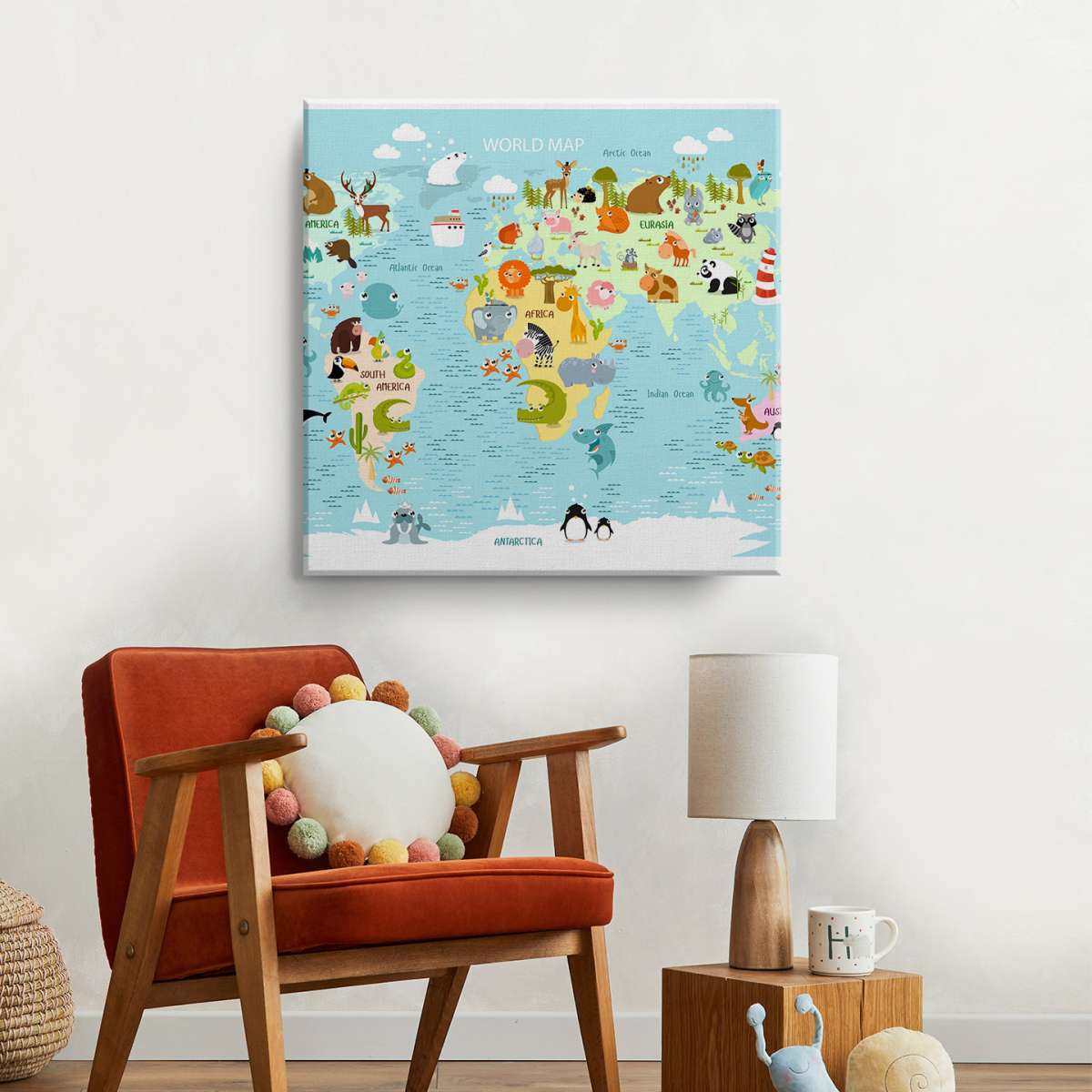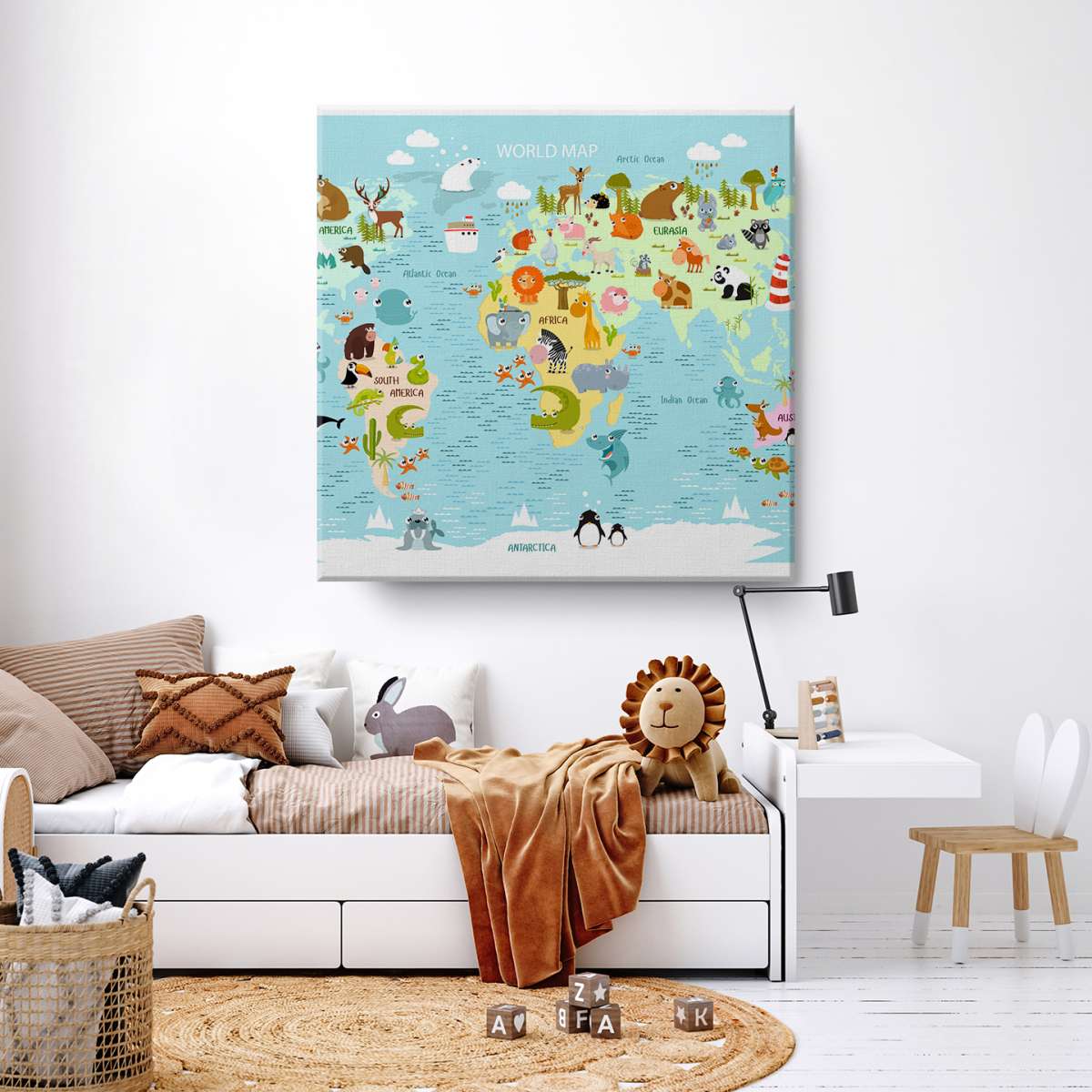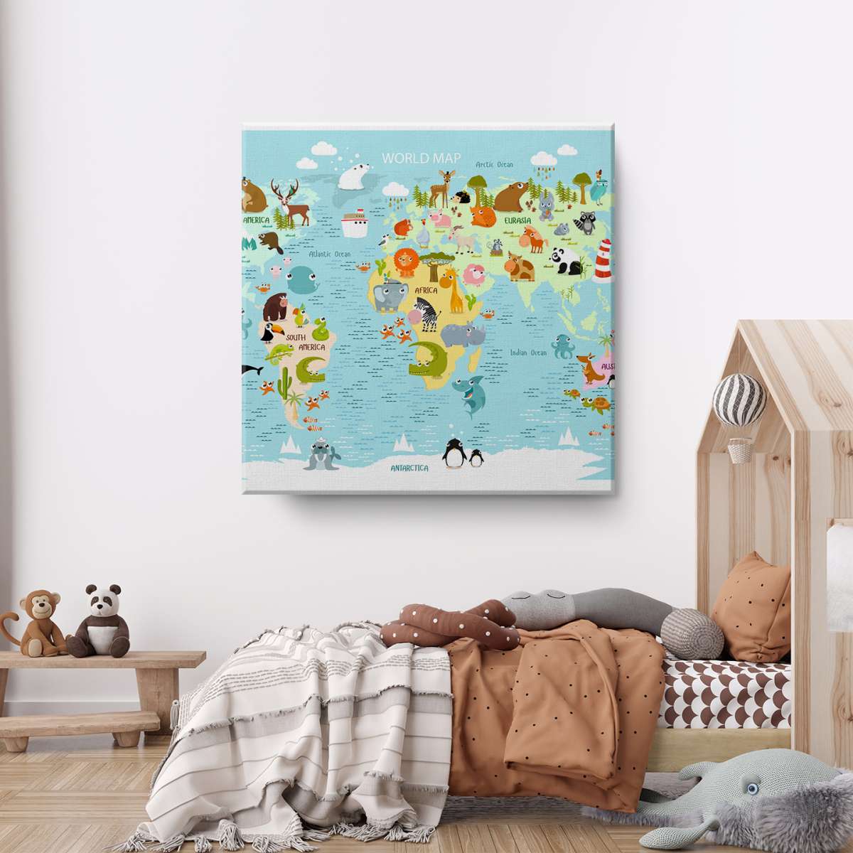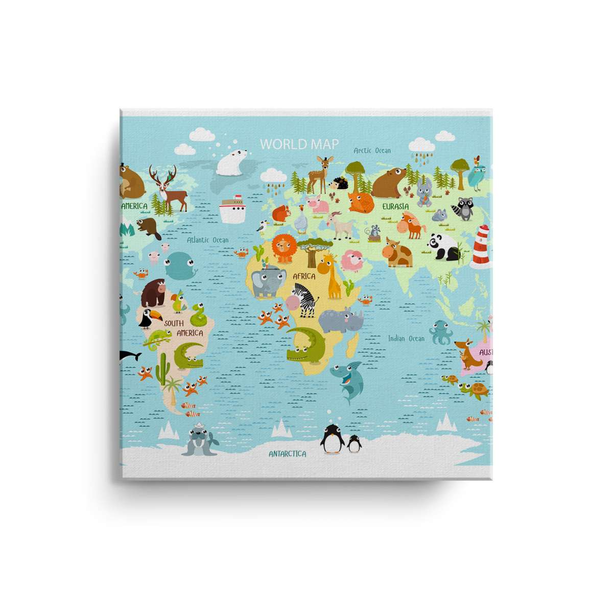 Dětská mapa světa s kreslenými zvířátky - ilustrace