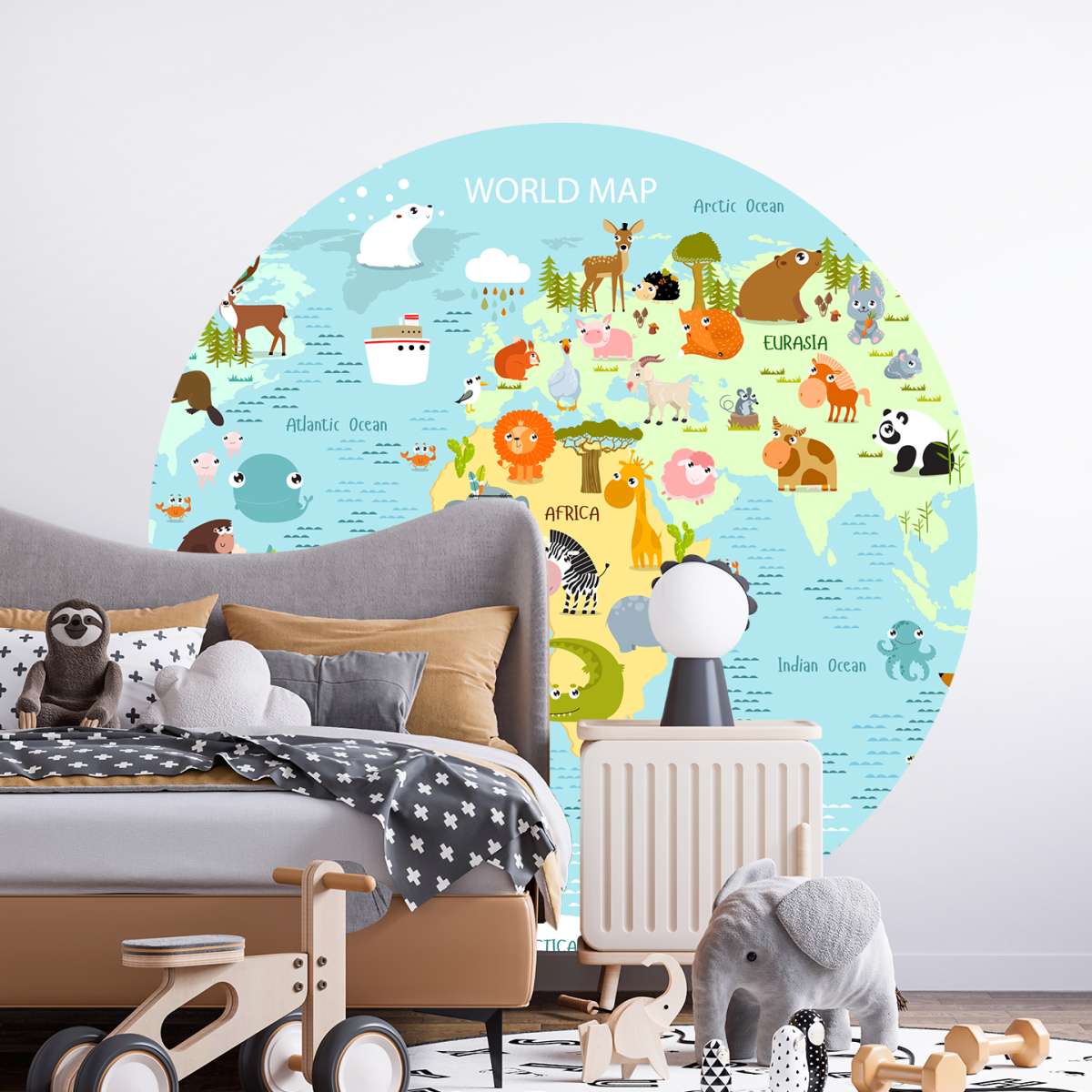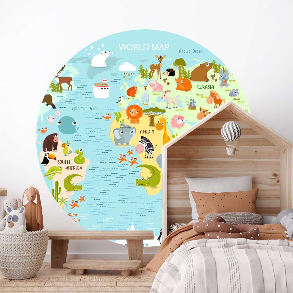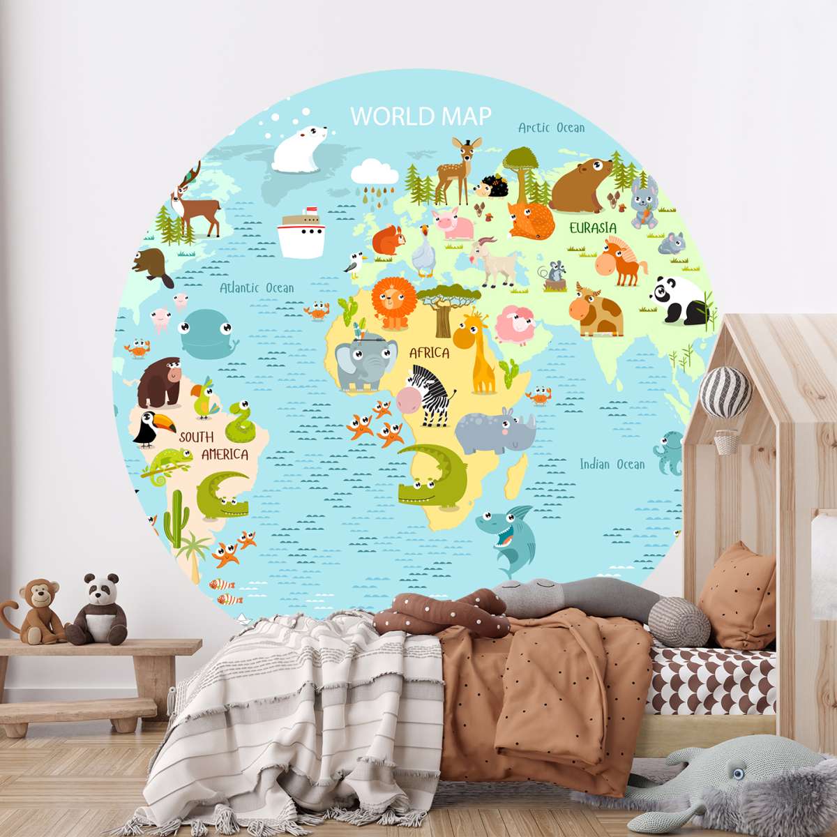 Dětská mapa světa s kreslenými zvířátky - ilustrace