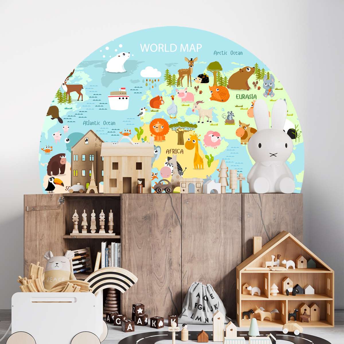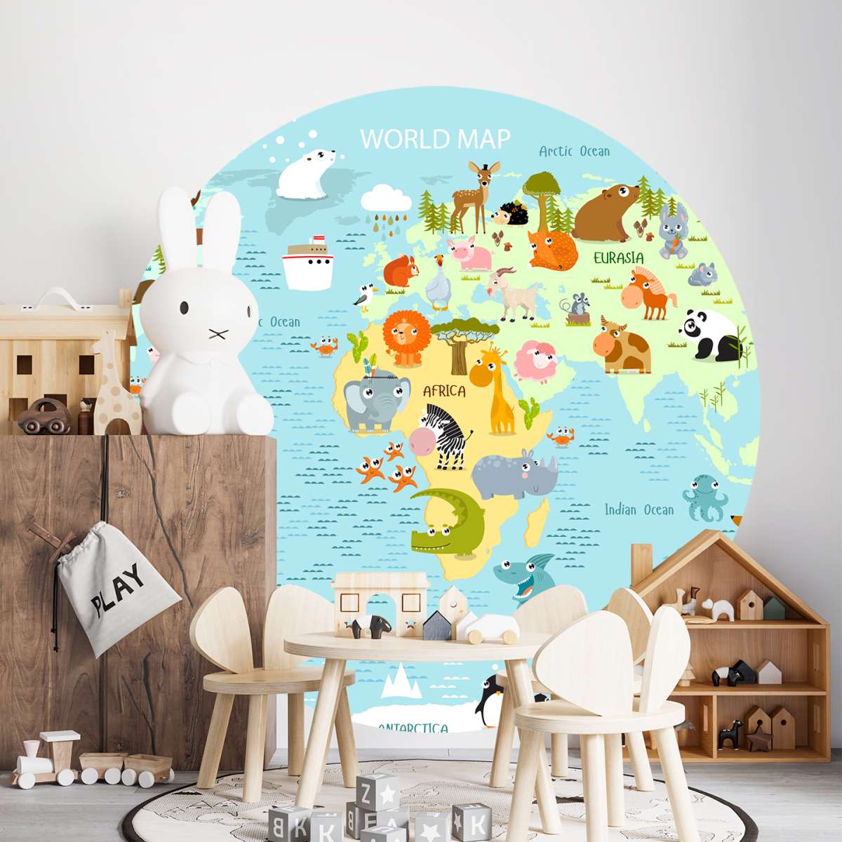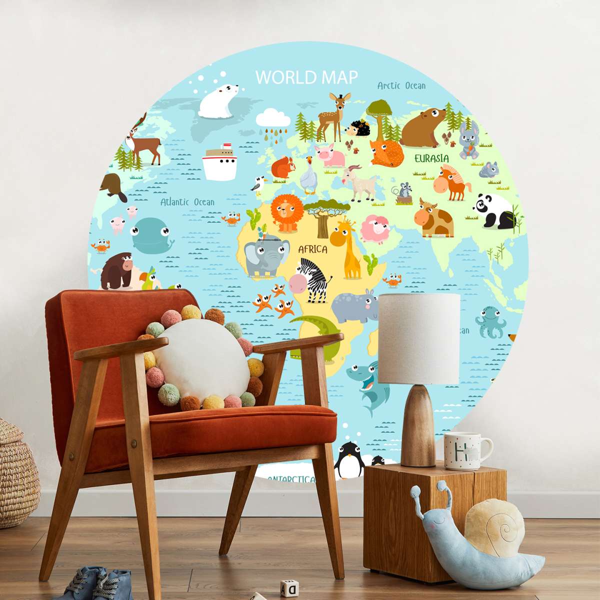 Dětská mapa světa s kreslenými zvířátky - ilustrace
