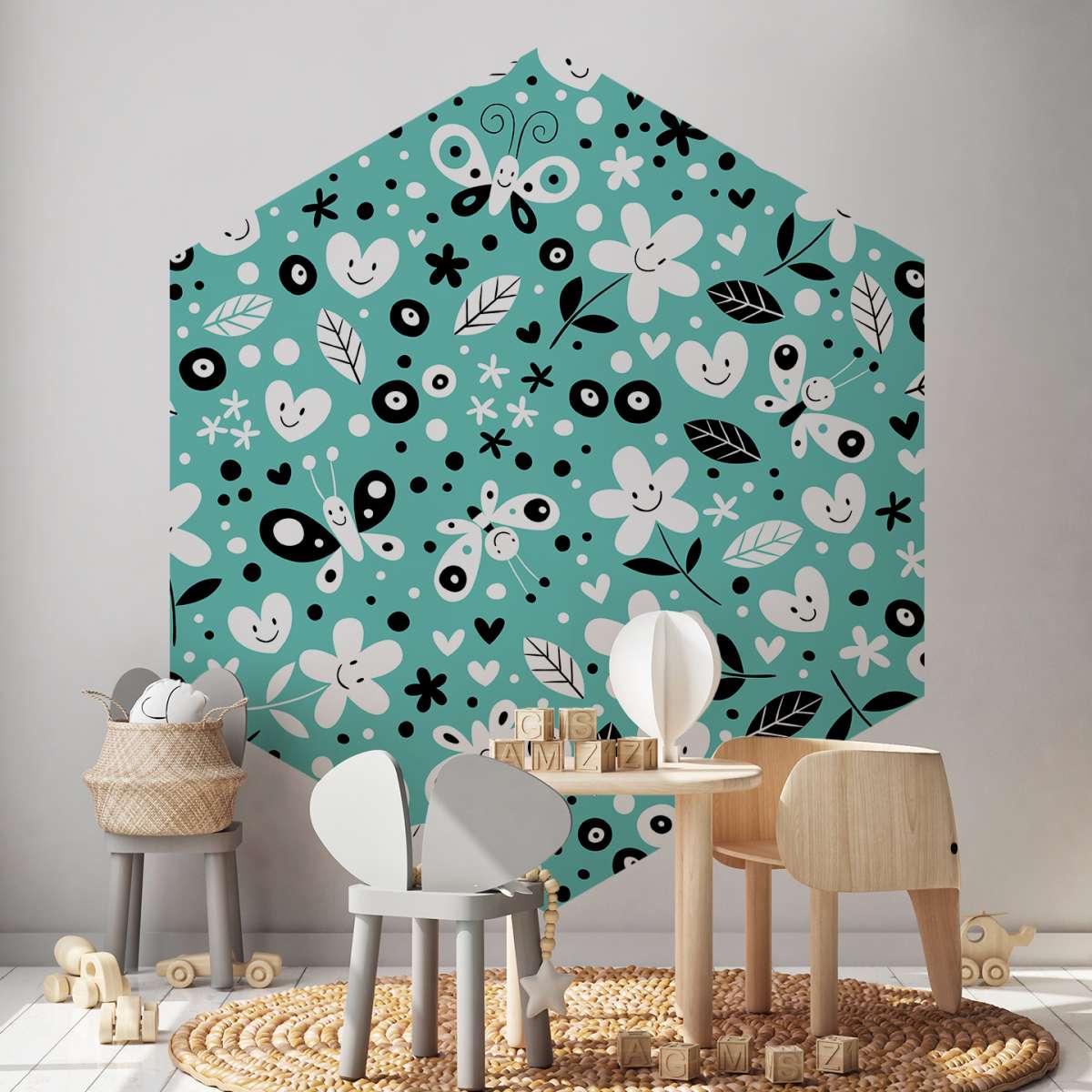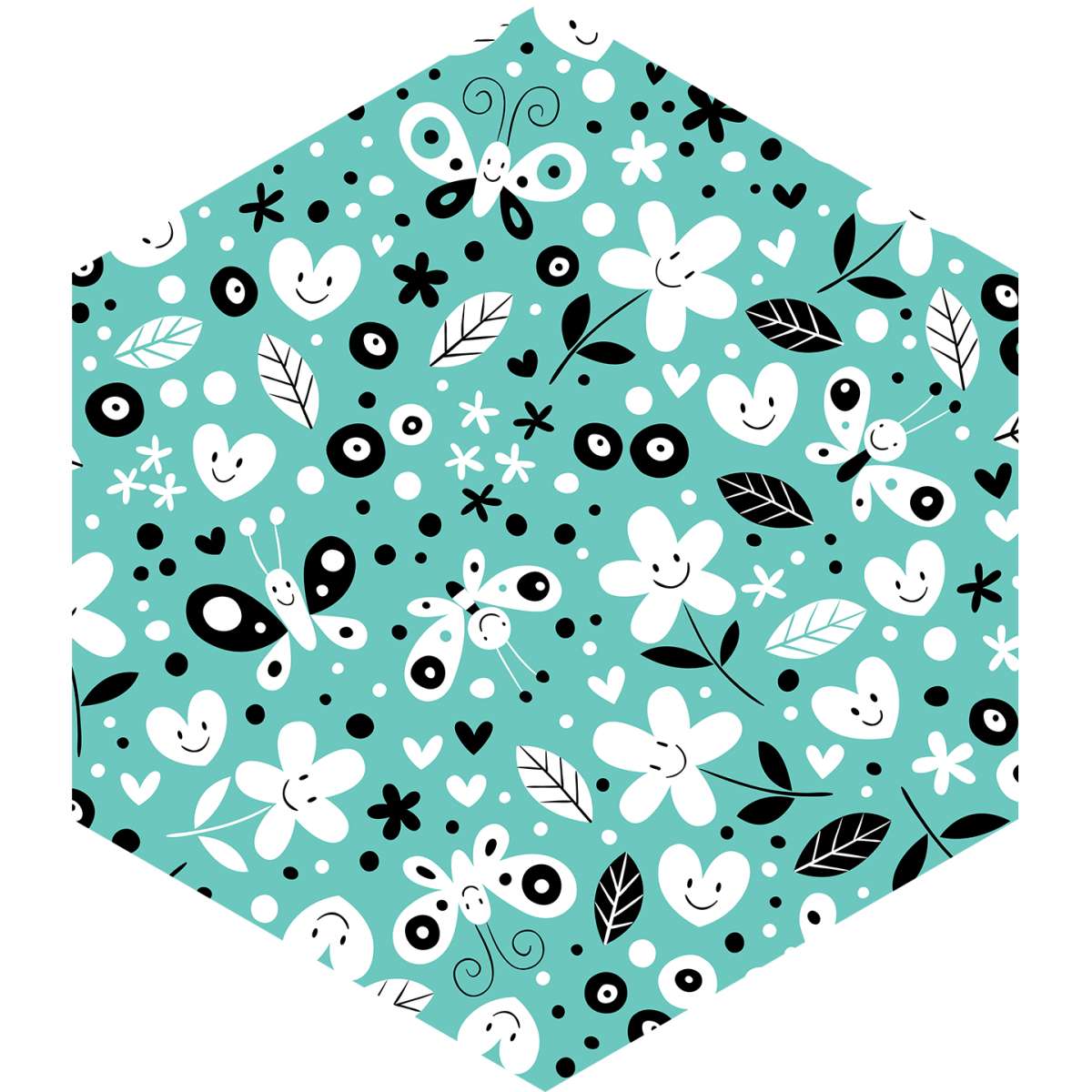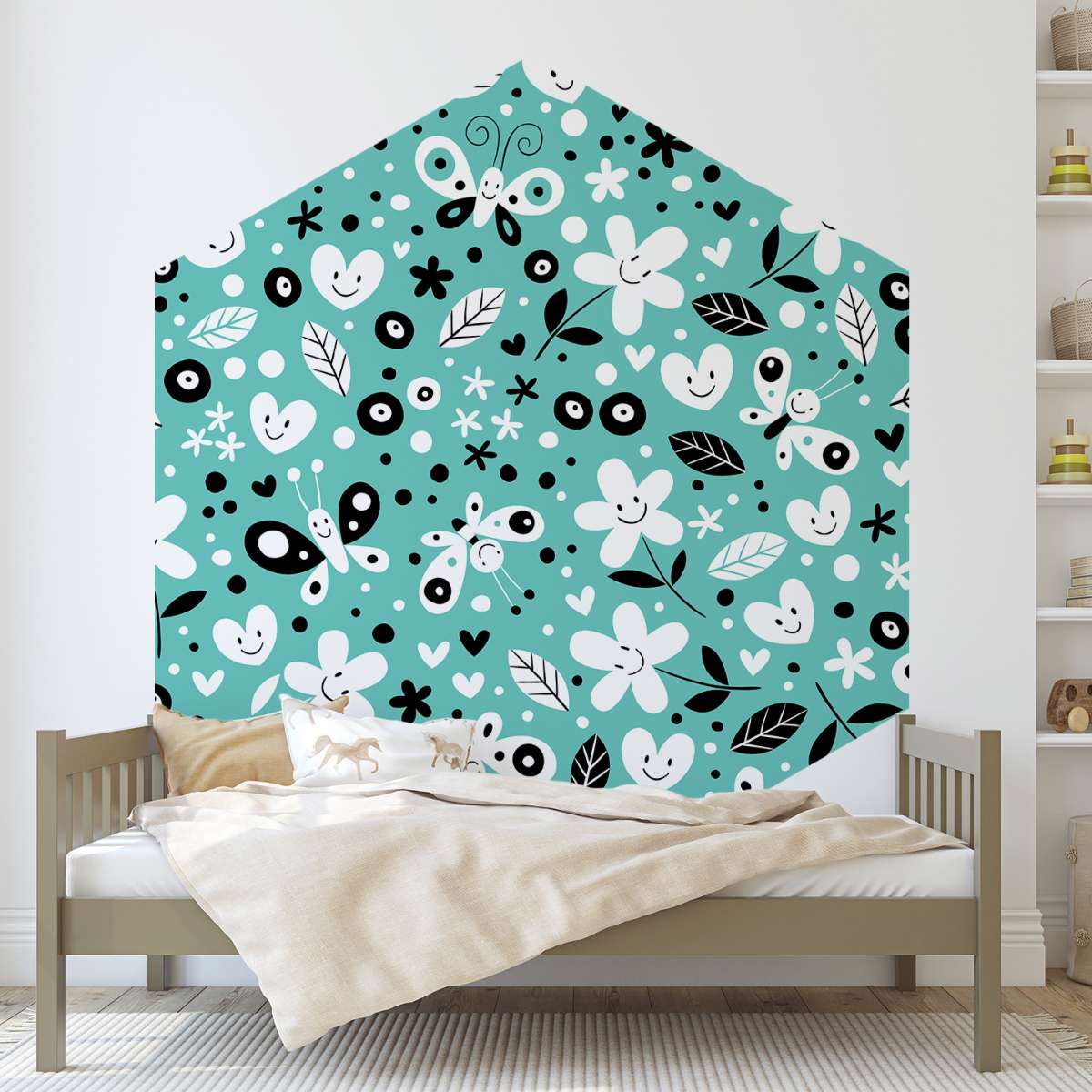Květiny, motýli a srdce - tyrkysový vzor