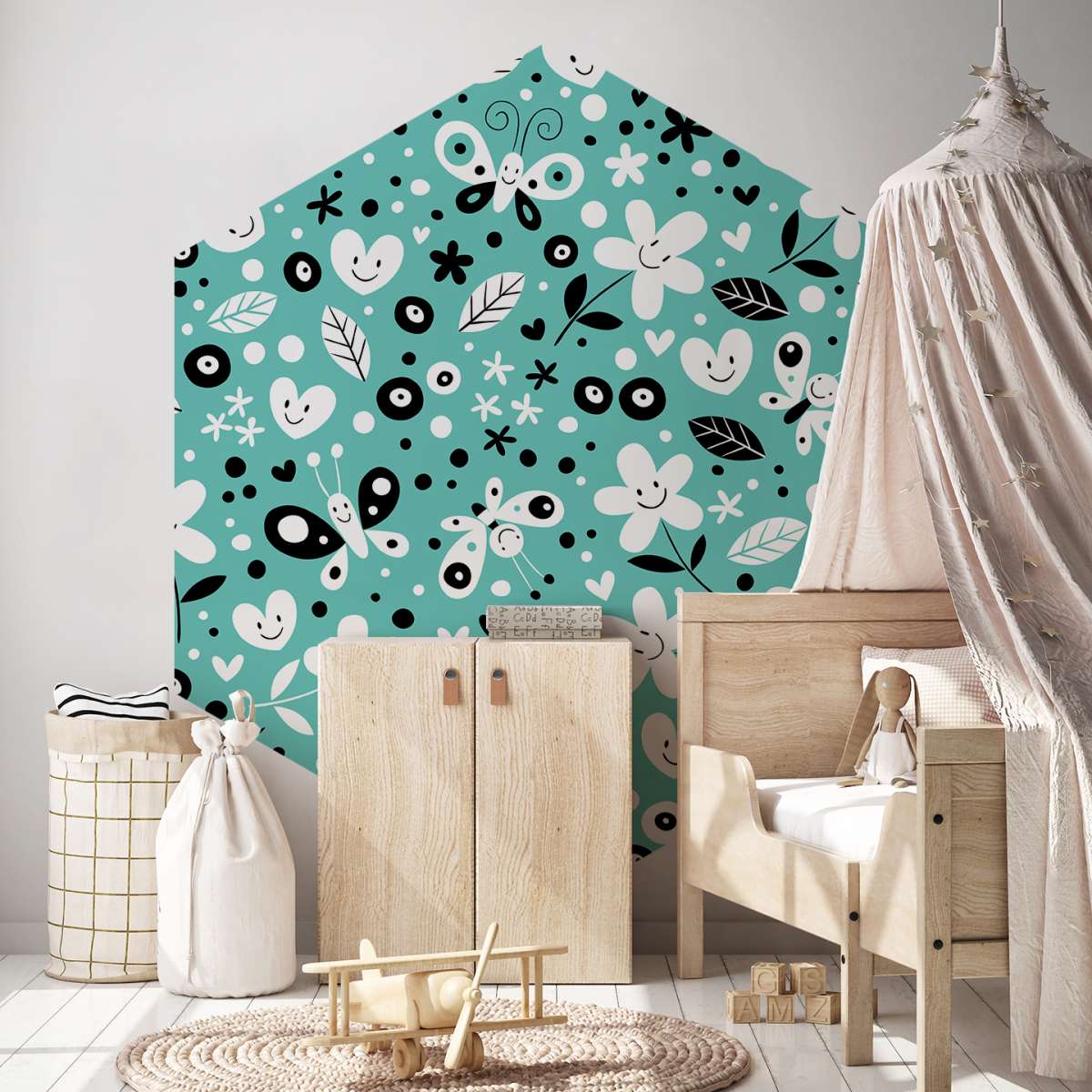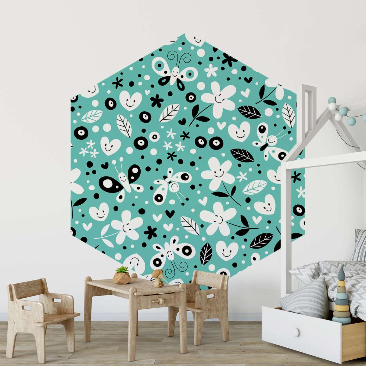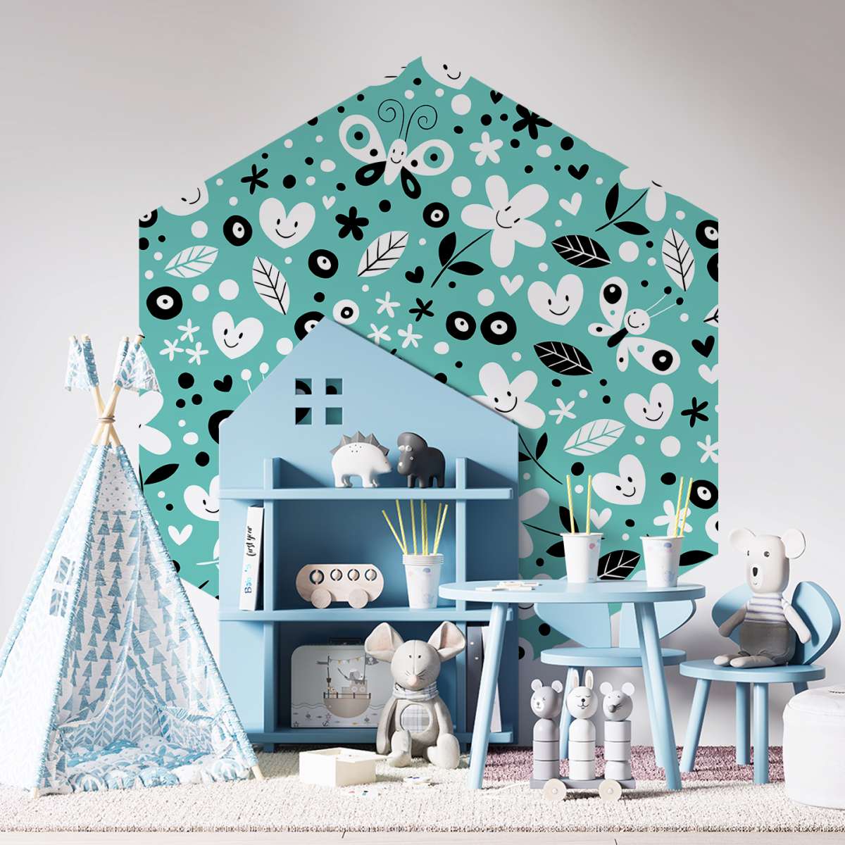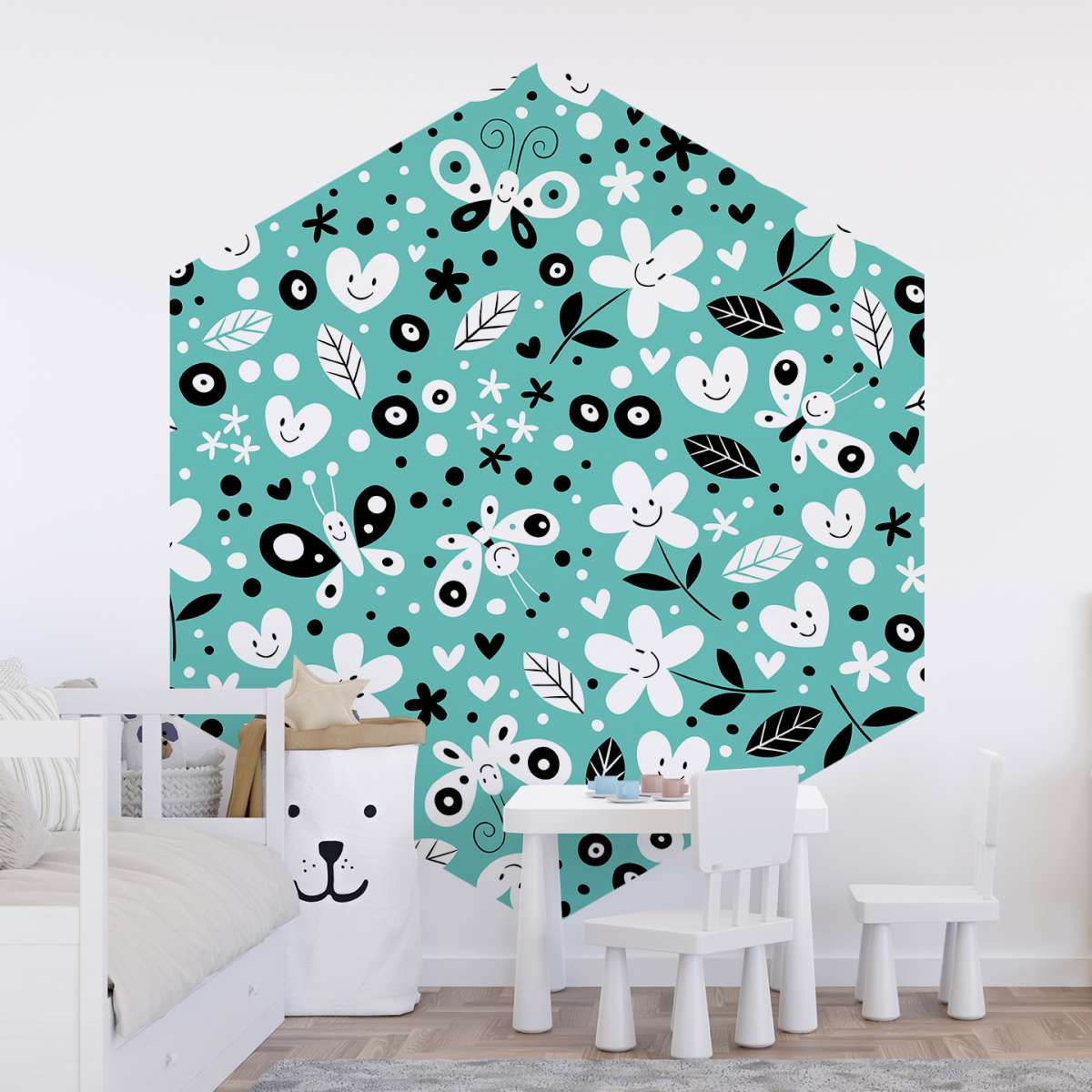 Květiny, motýli a srdce - tyrkysový vzor