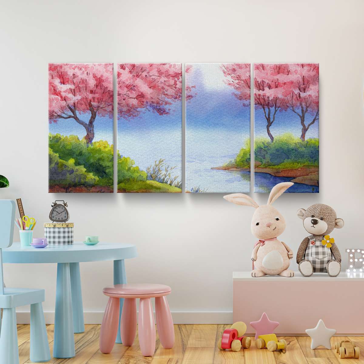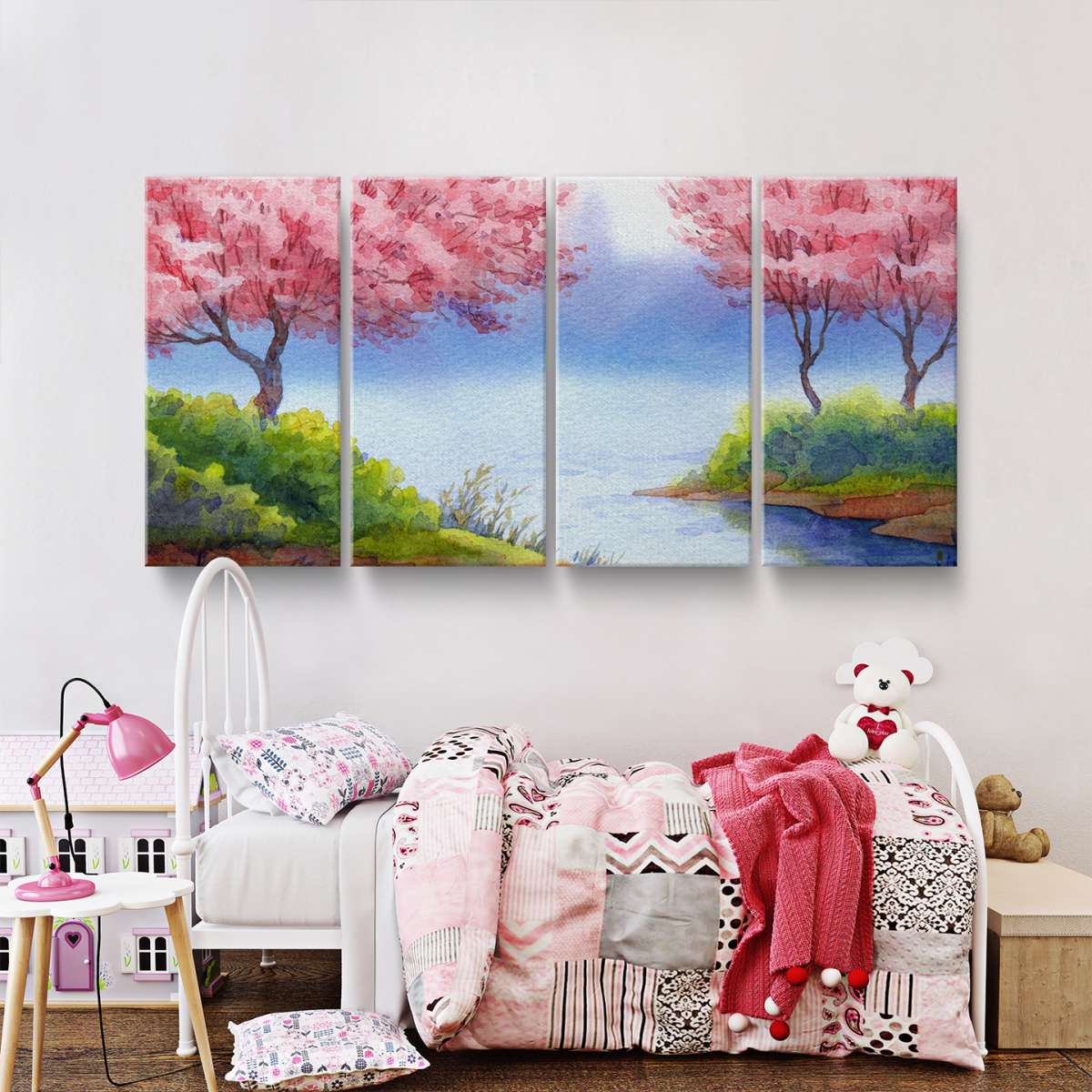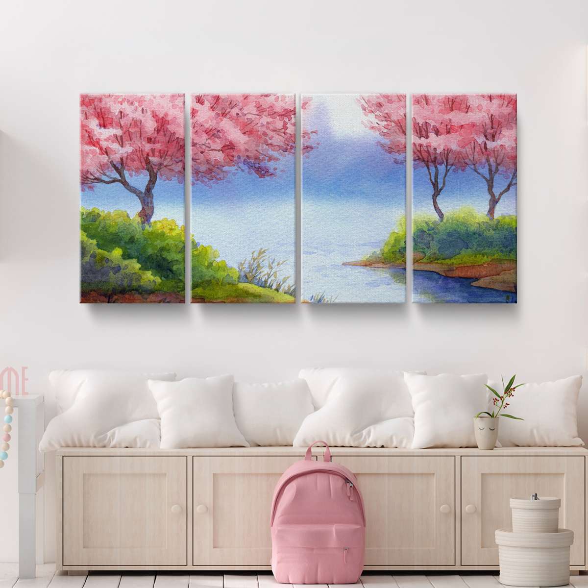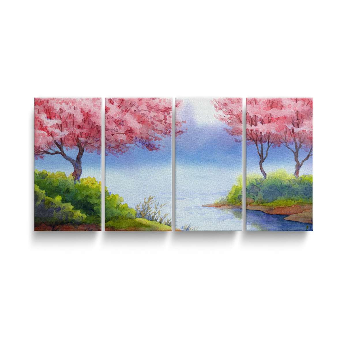 Kvetoucí stromy sakury nad jezerem - akvarel