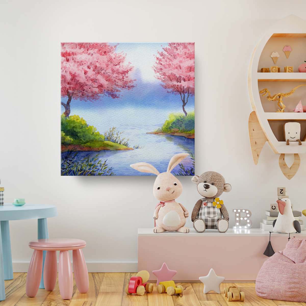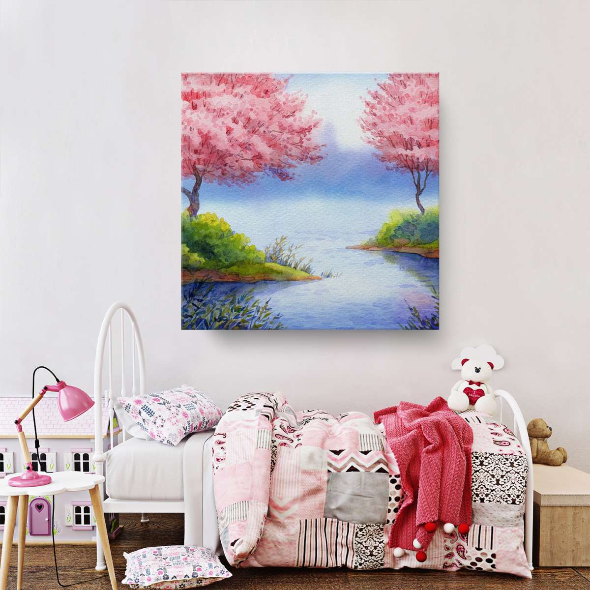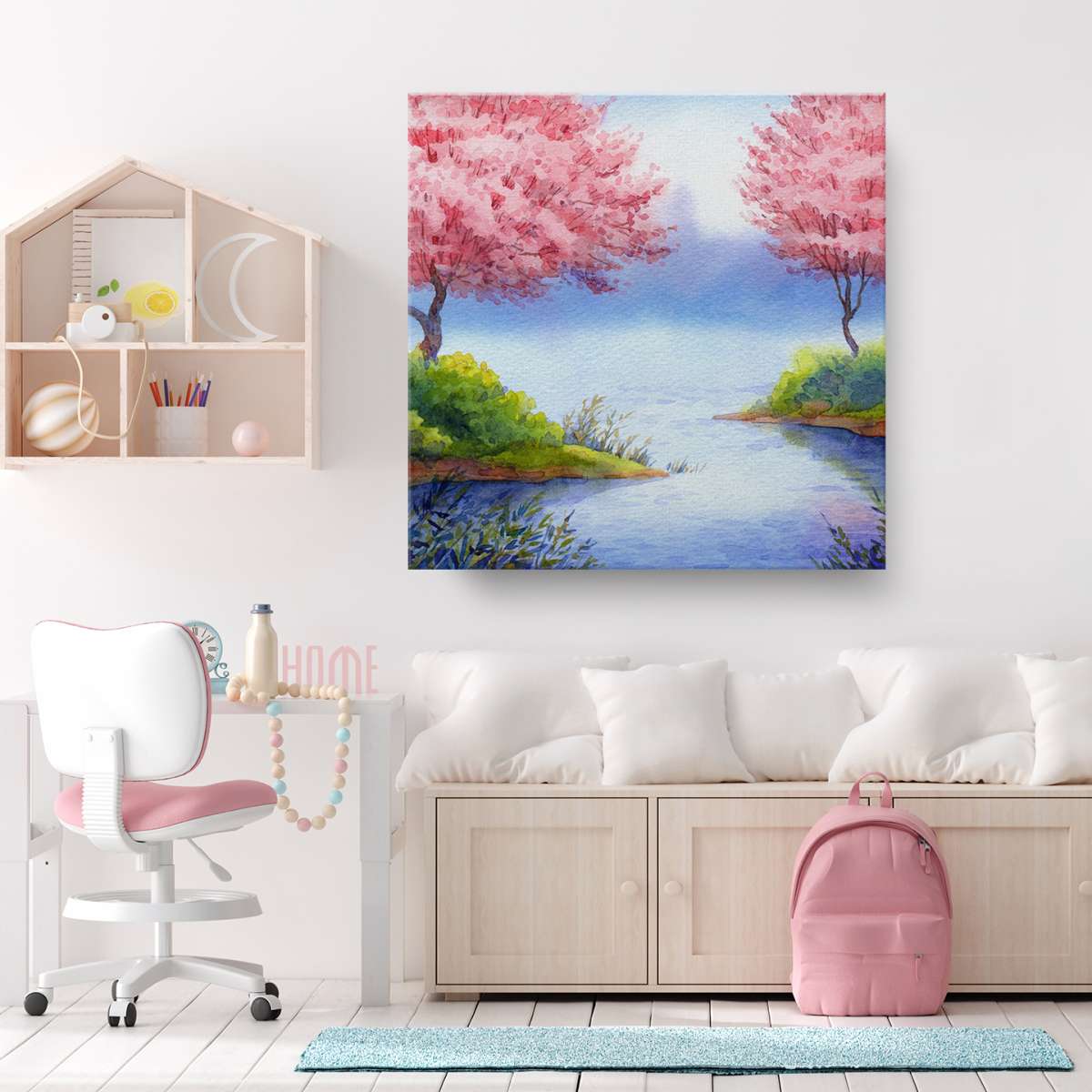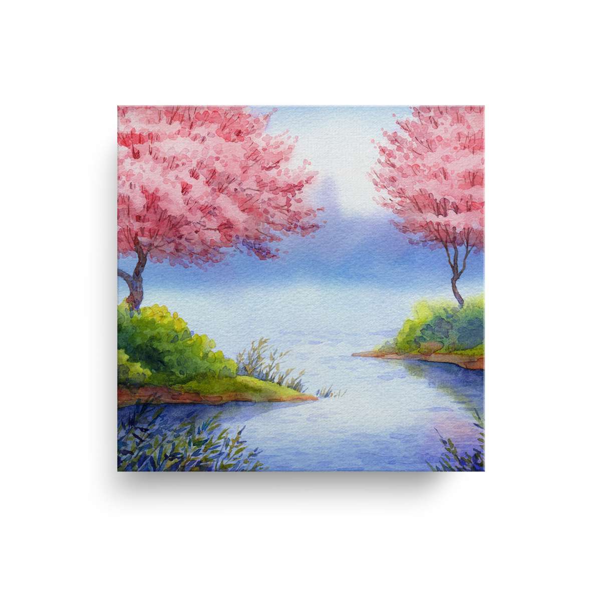 Kvetoucí stromy sakury nad jezerem - akvarel