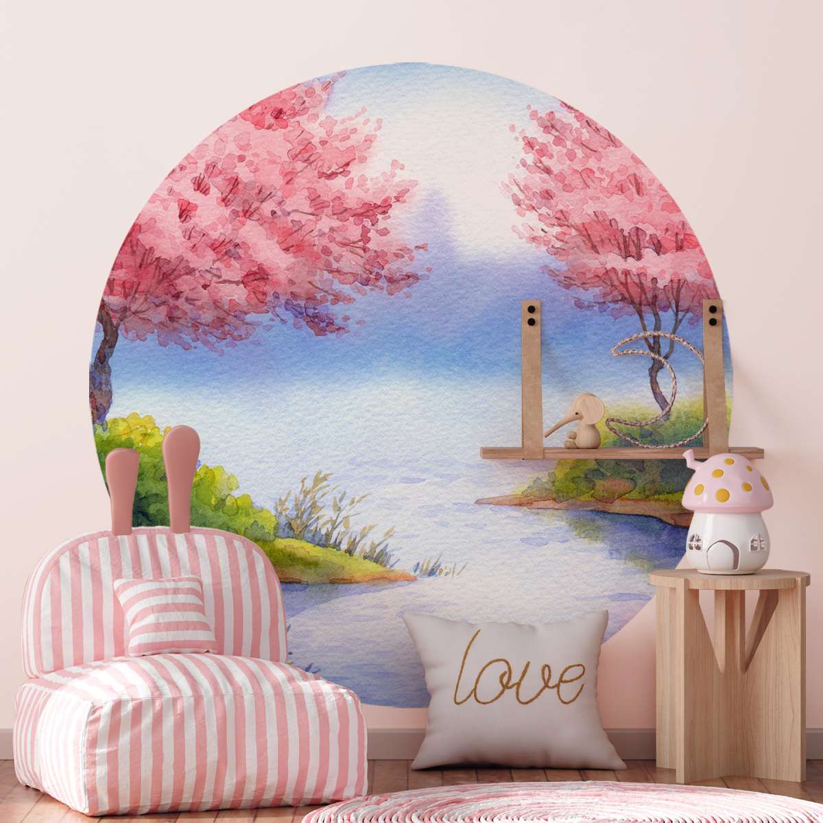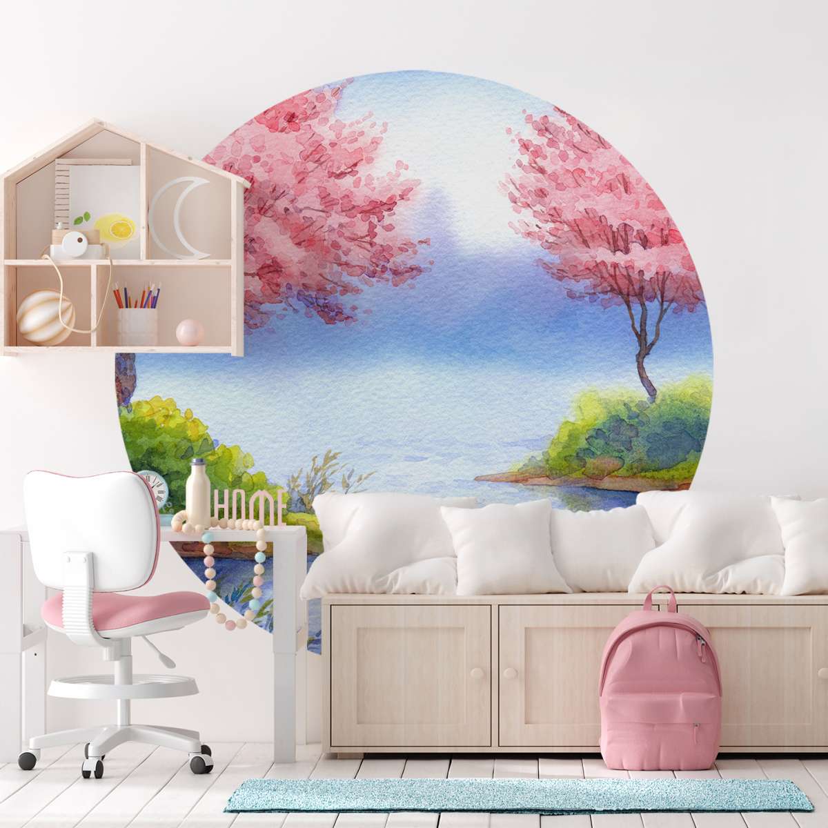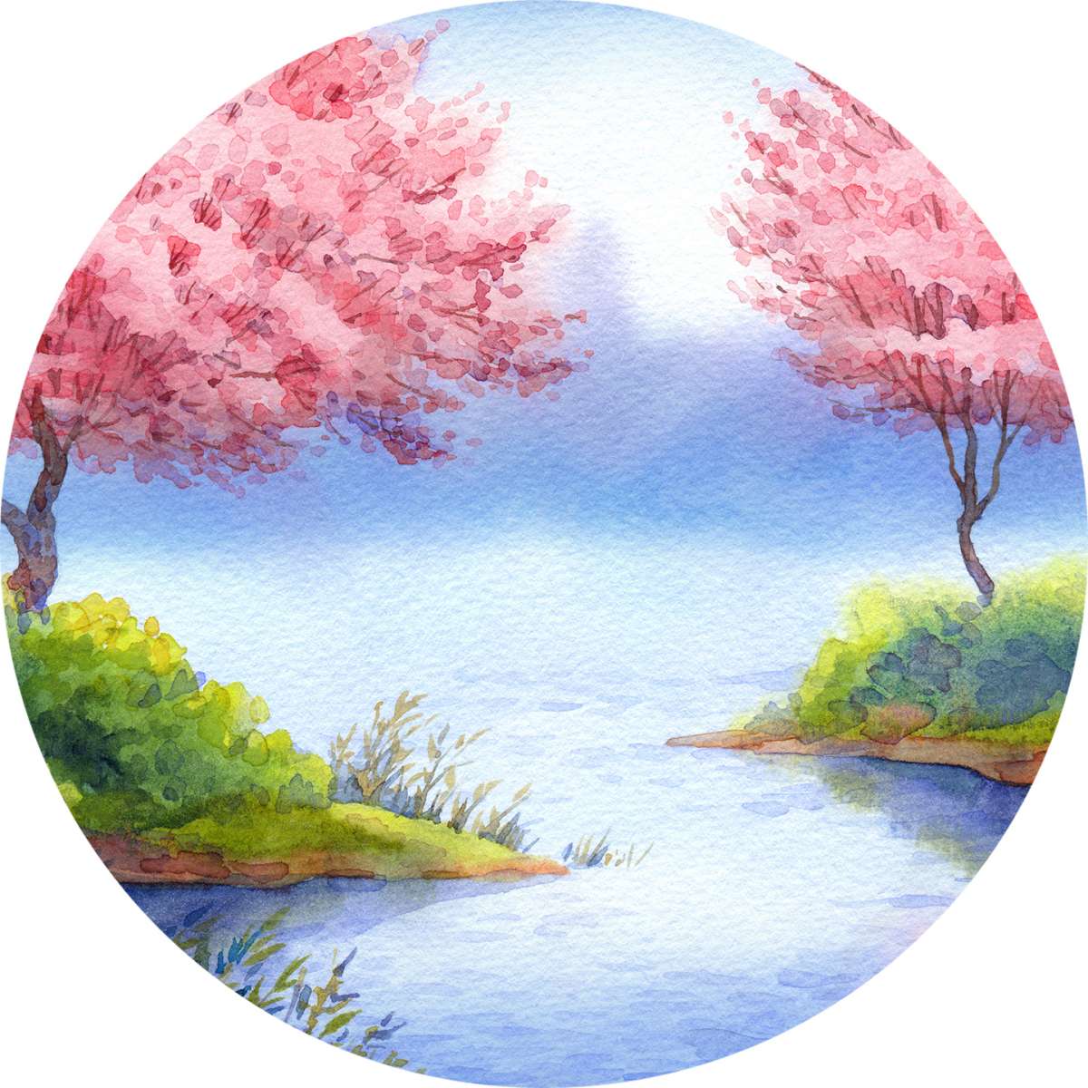 Kvetoucí stromy sakury nad jezerem - akvarel