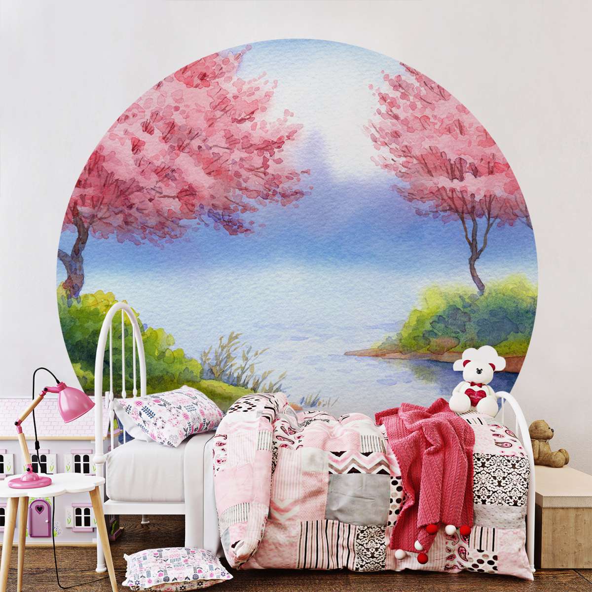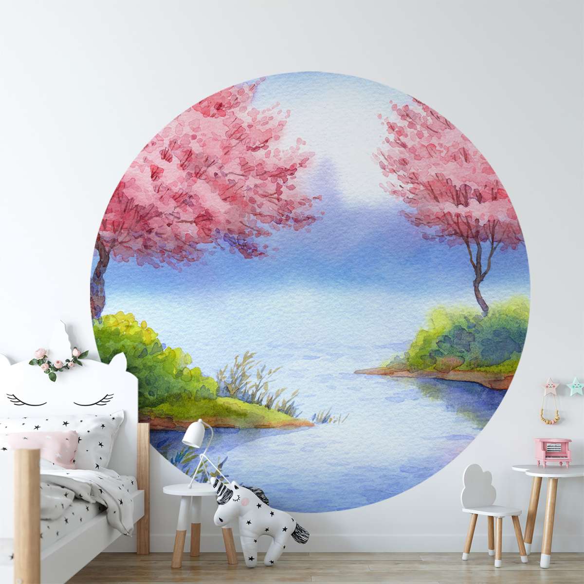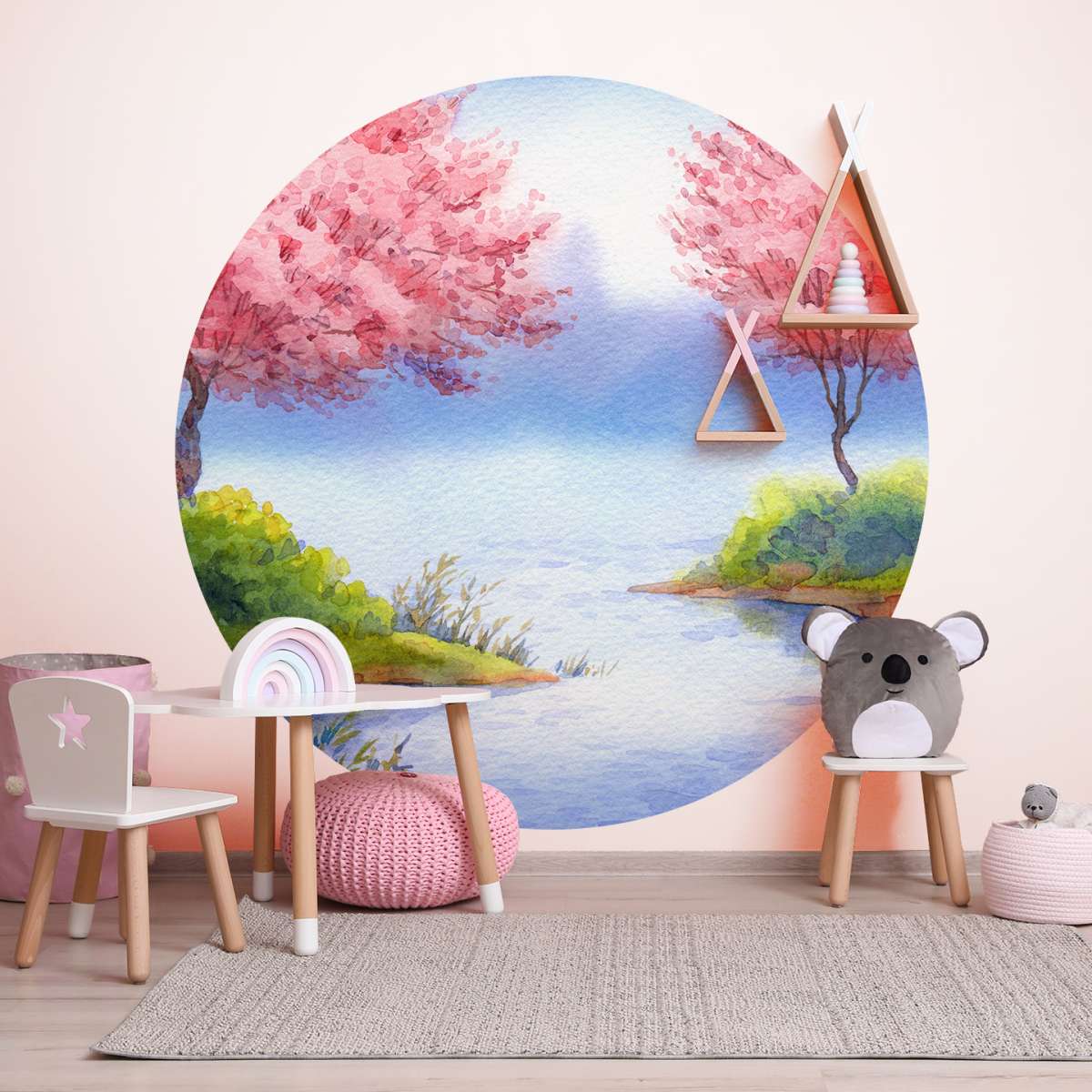 Kvetoucí stromy sakury nad jezerem - akvarel