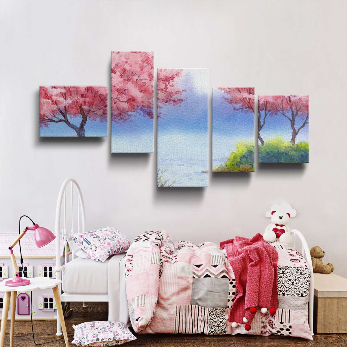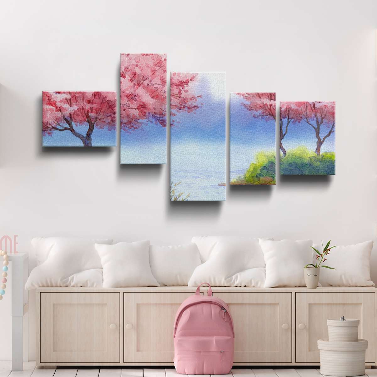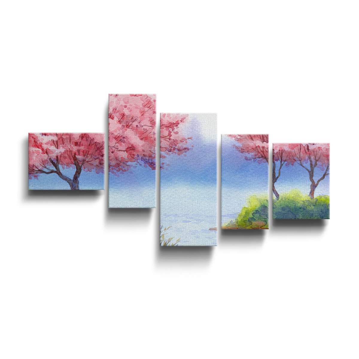 Kvetoucí stromy sakury nad jezerem - akvarel