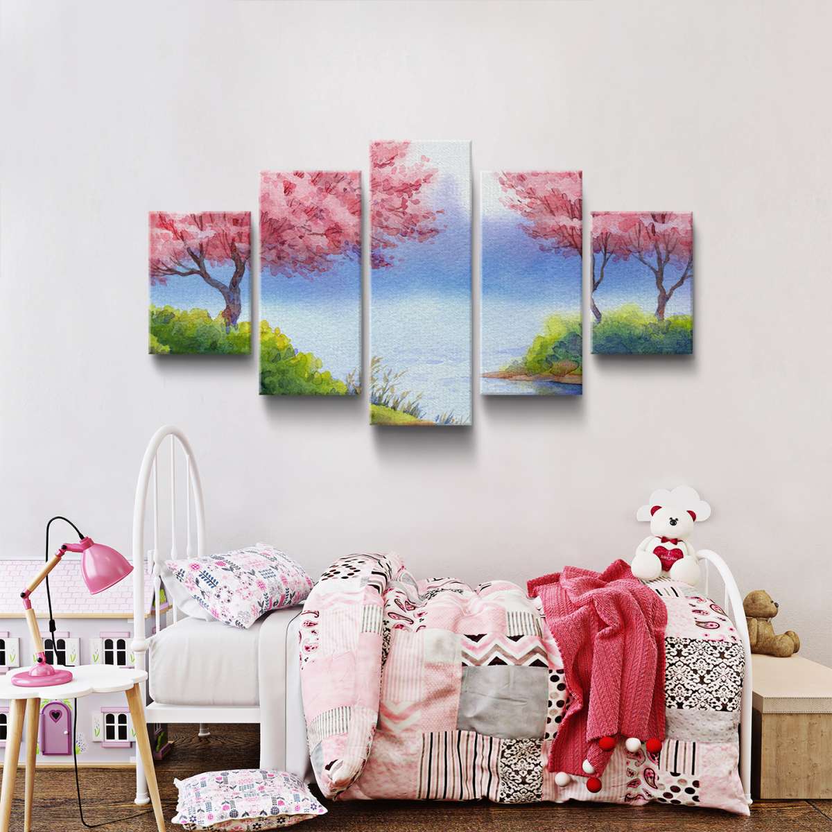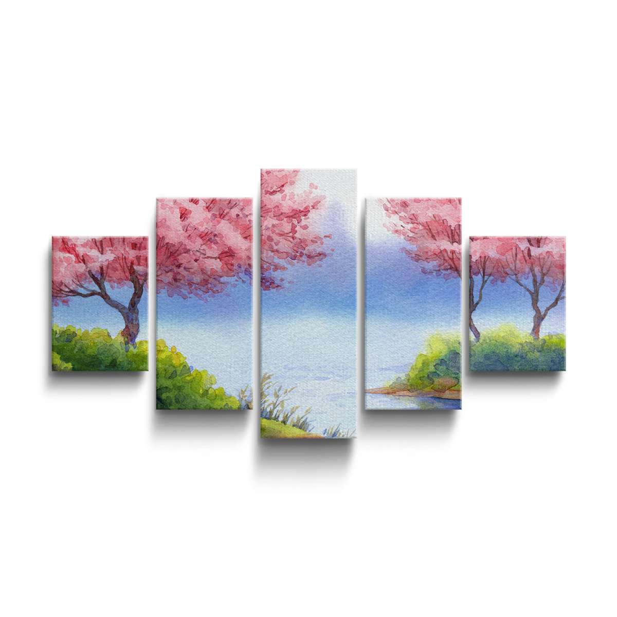 Kvetoucí stromy sakury nad jezerem - akvarel