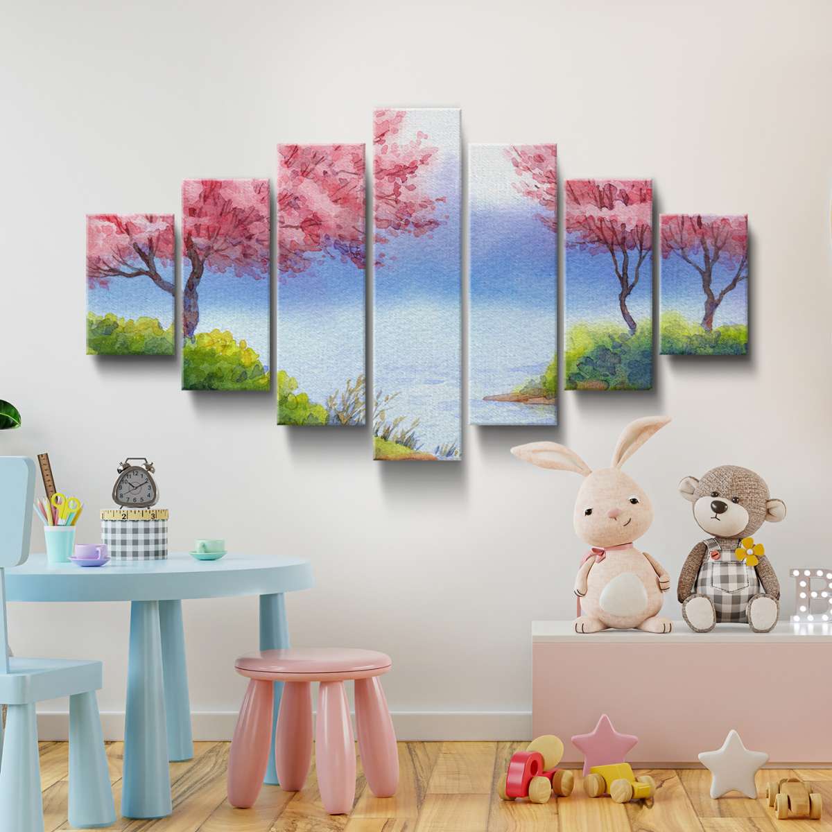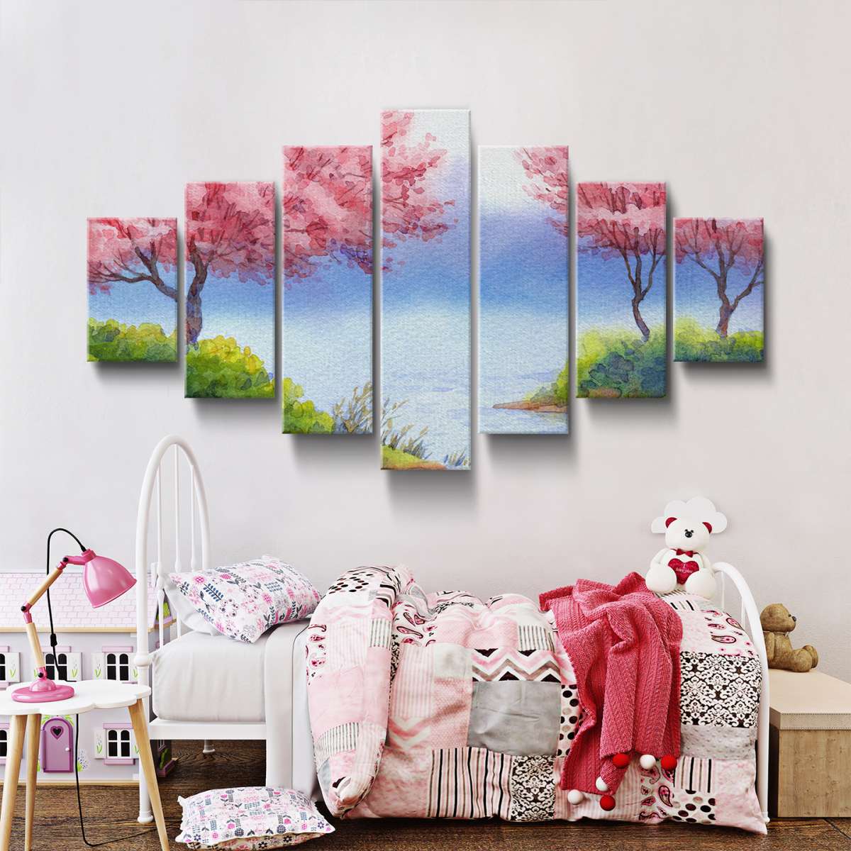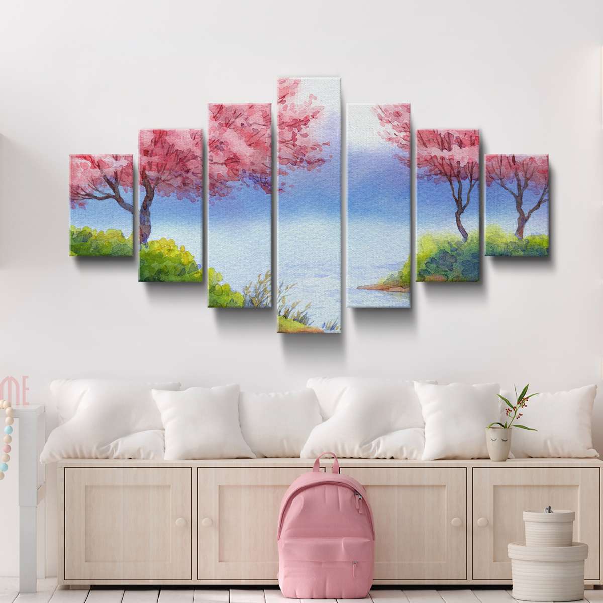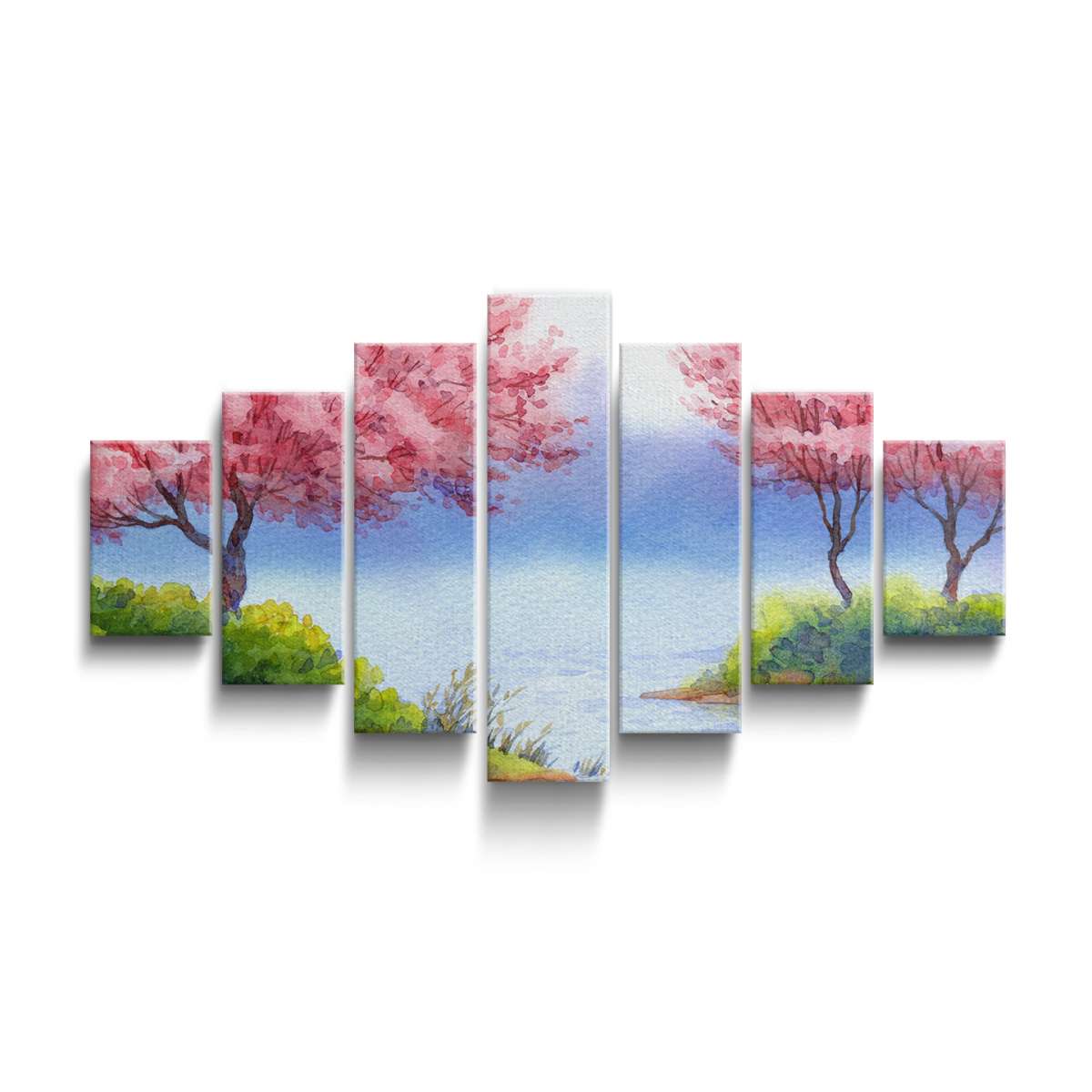 Kvetoucí stromy sakury nad jezerem - akvarel