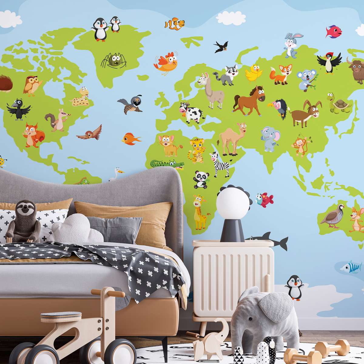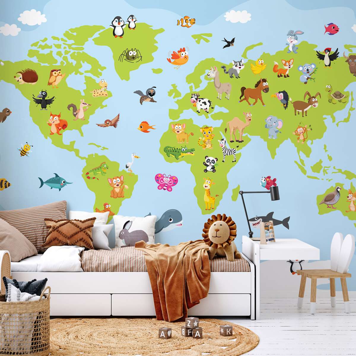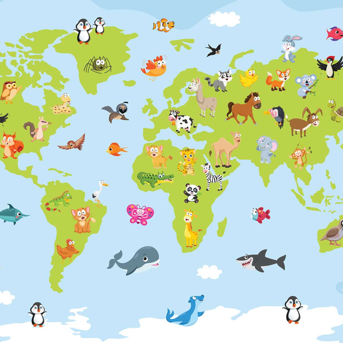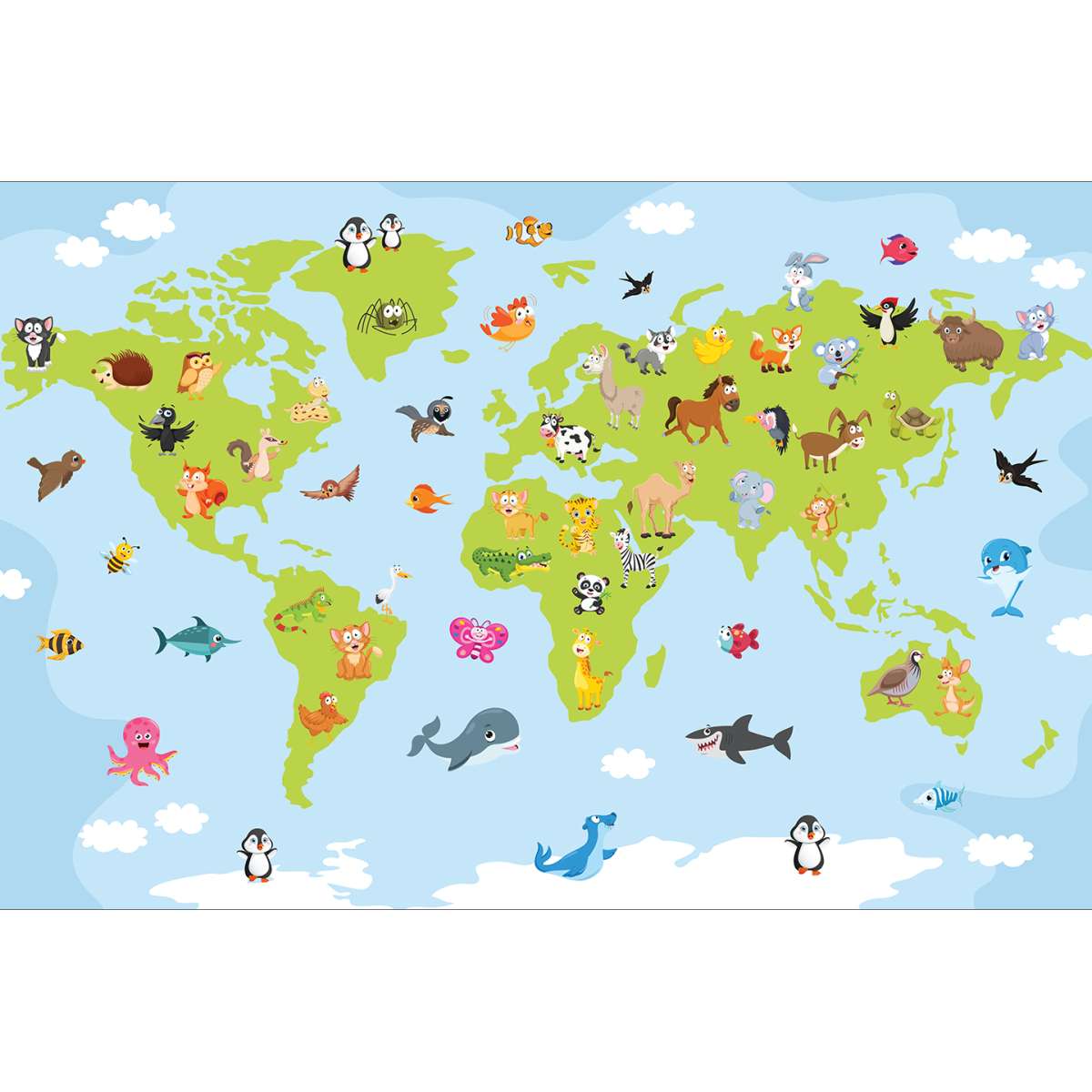 Mapa světa pro děti s kreslenými zvířátky - ilustrace