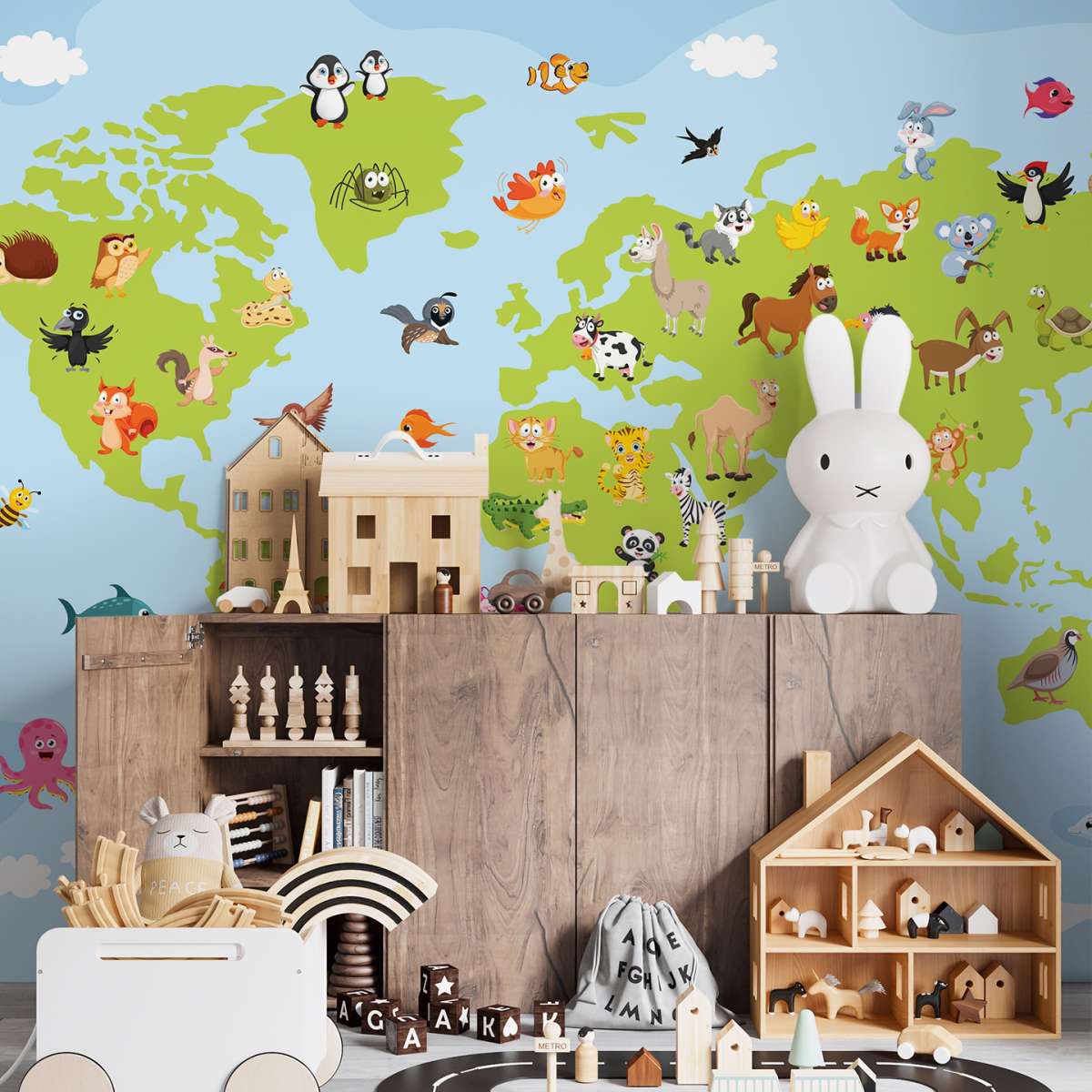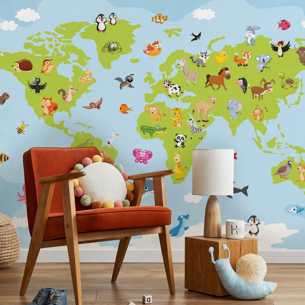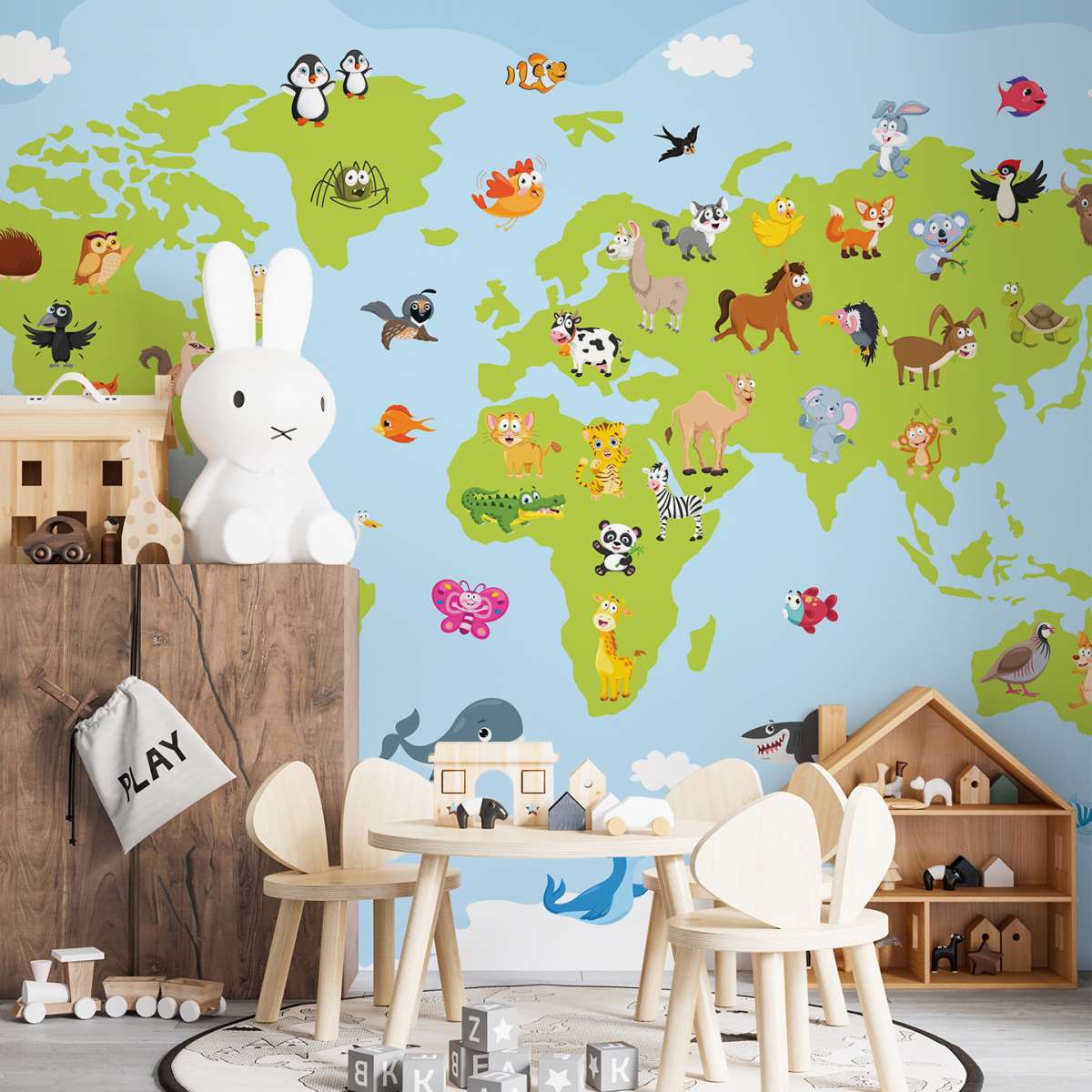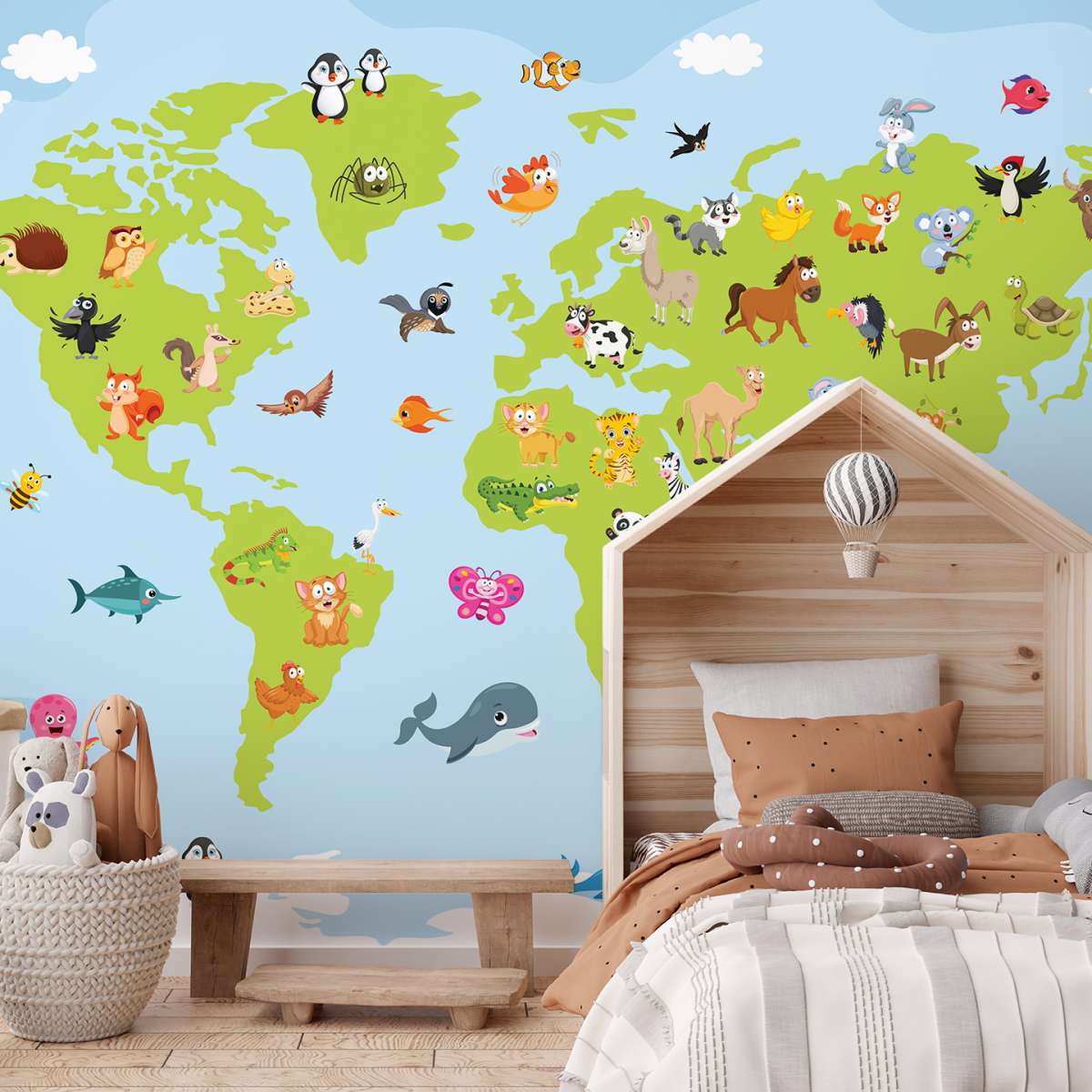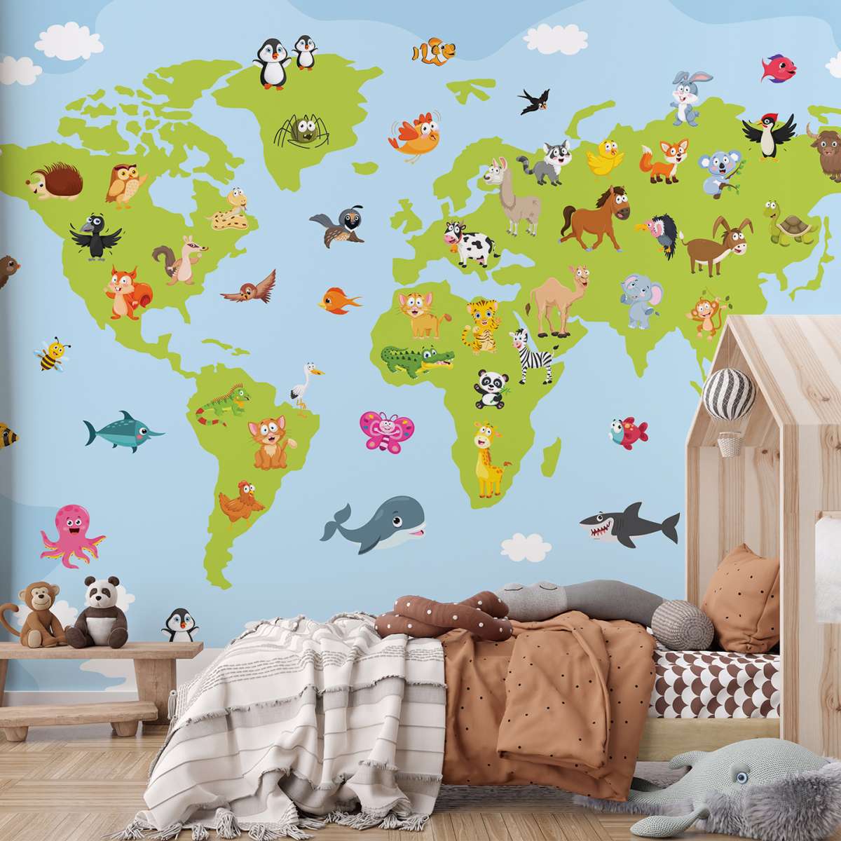 Mapa světa pro děti s kreslenými zvířátky - ilustrace