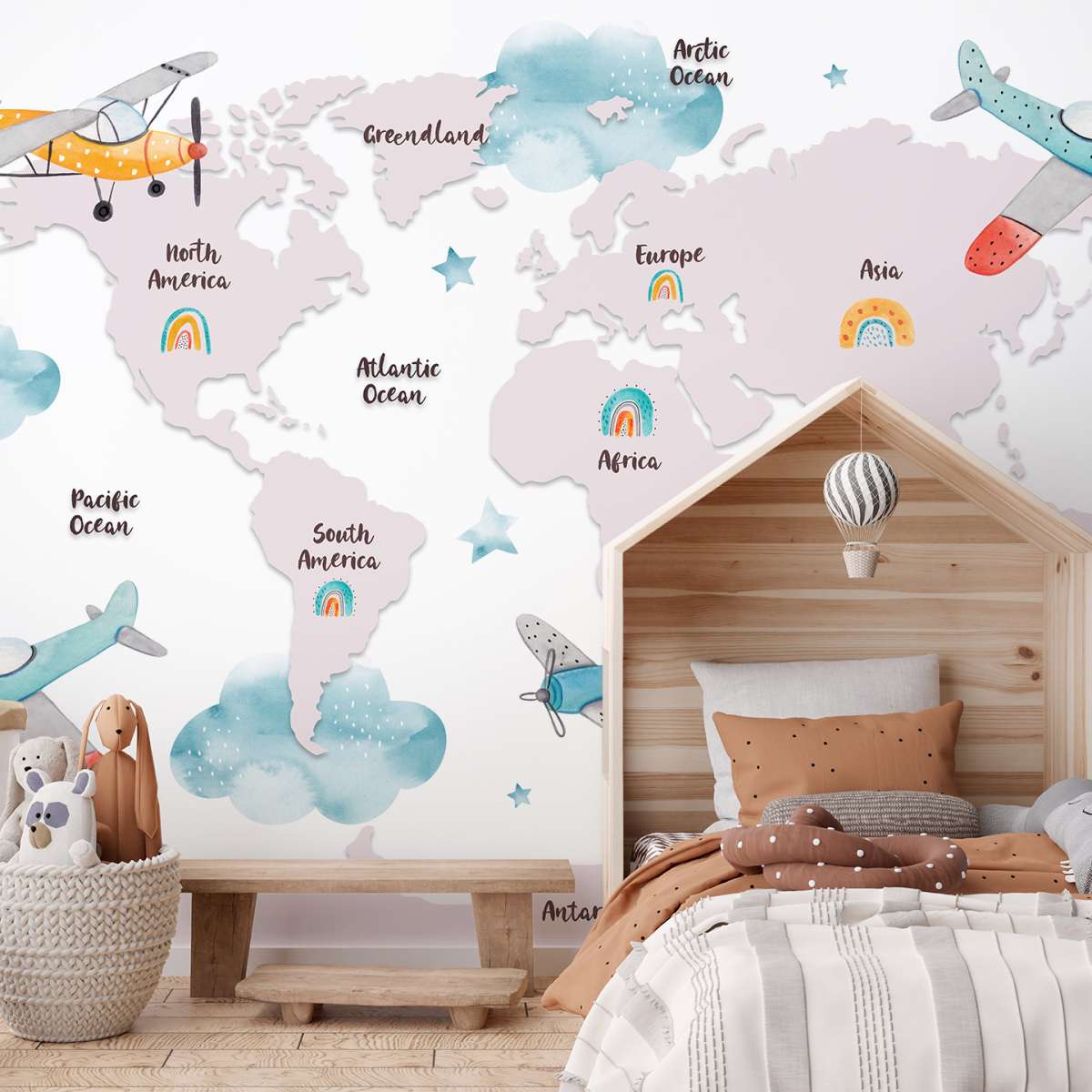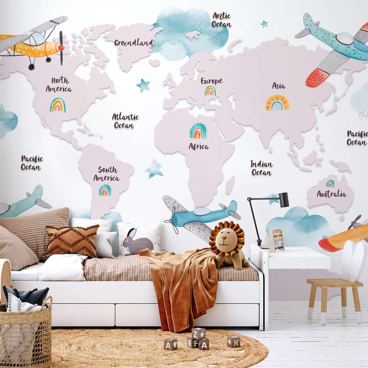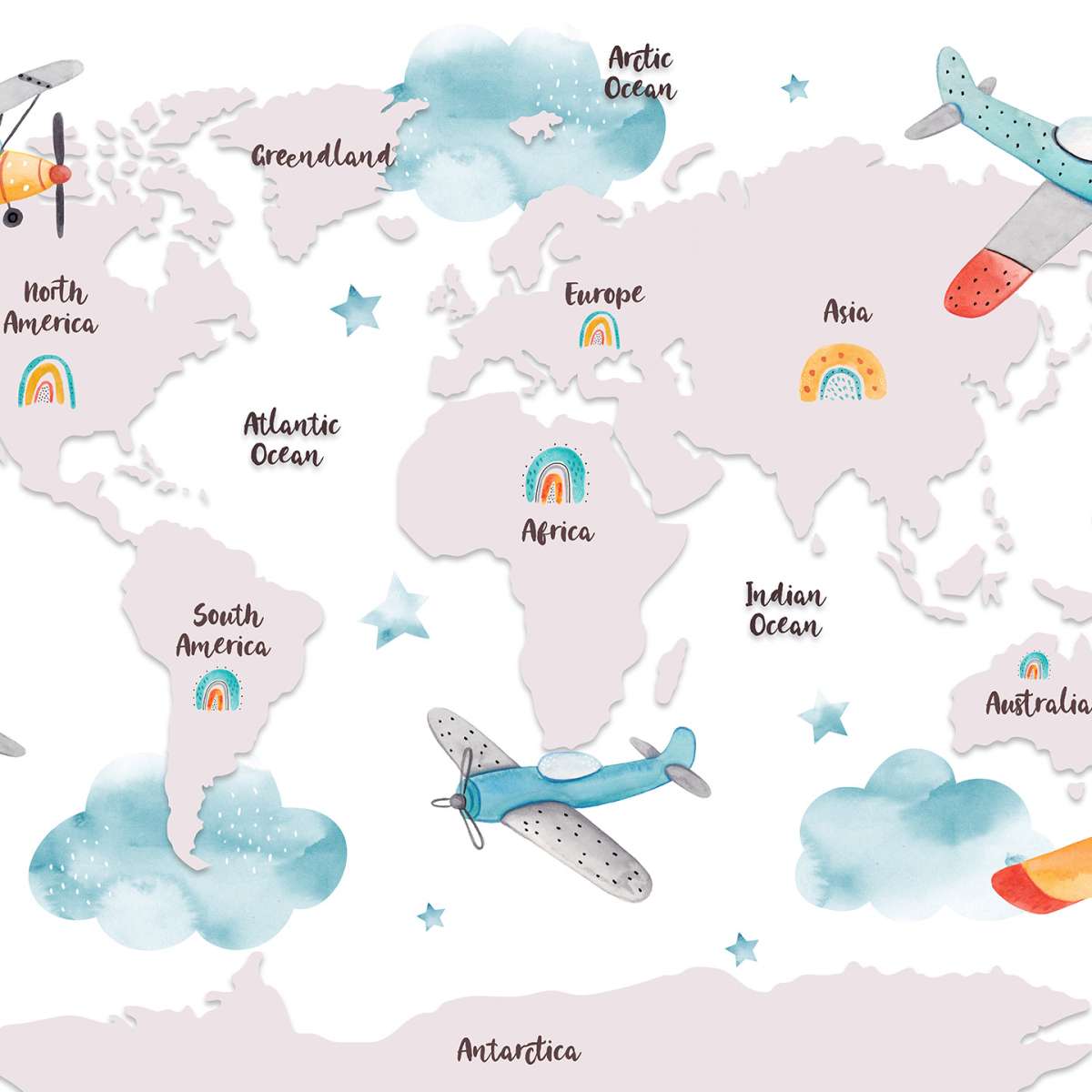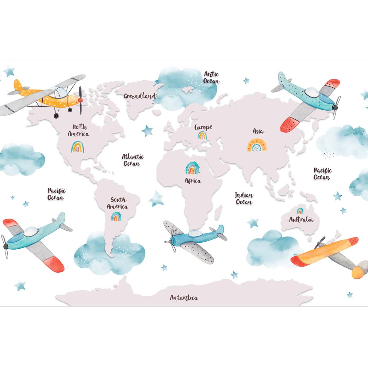 Mapa světa s názvy kontinentů, letadly a mraky - ilustrace