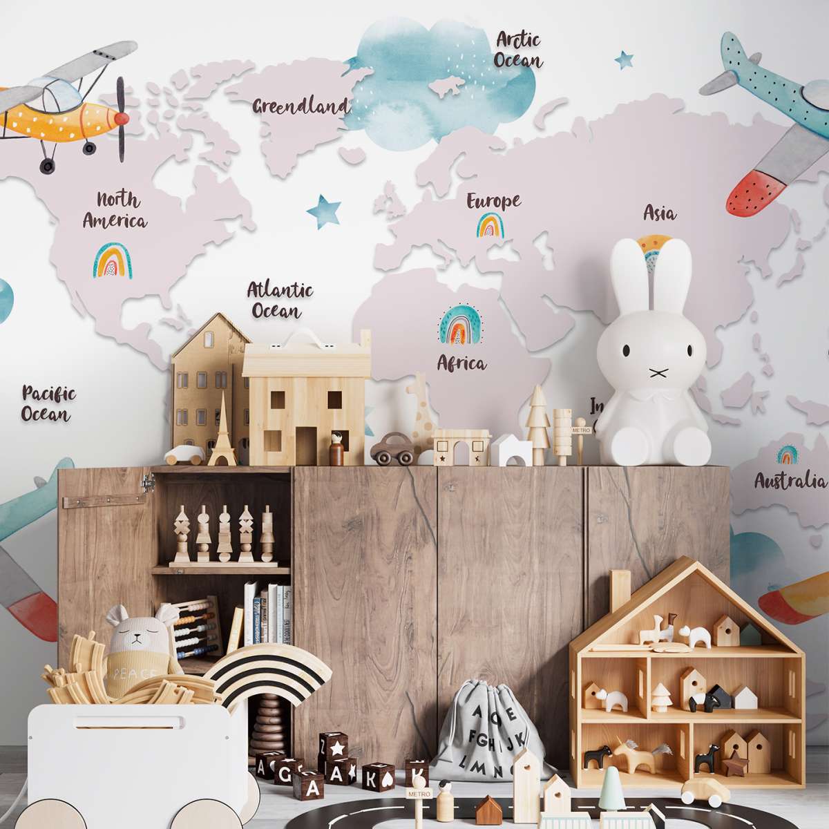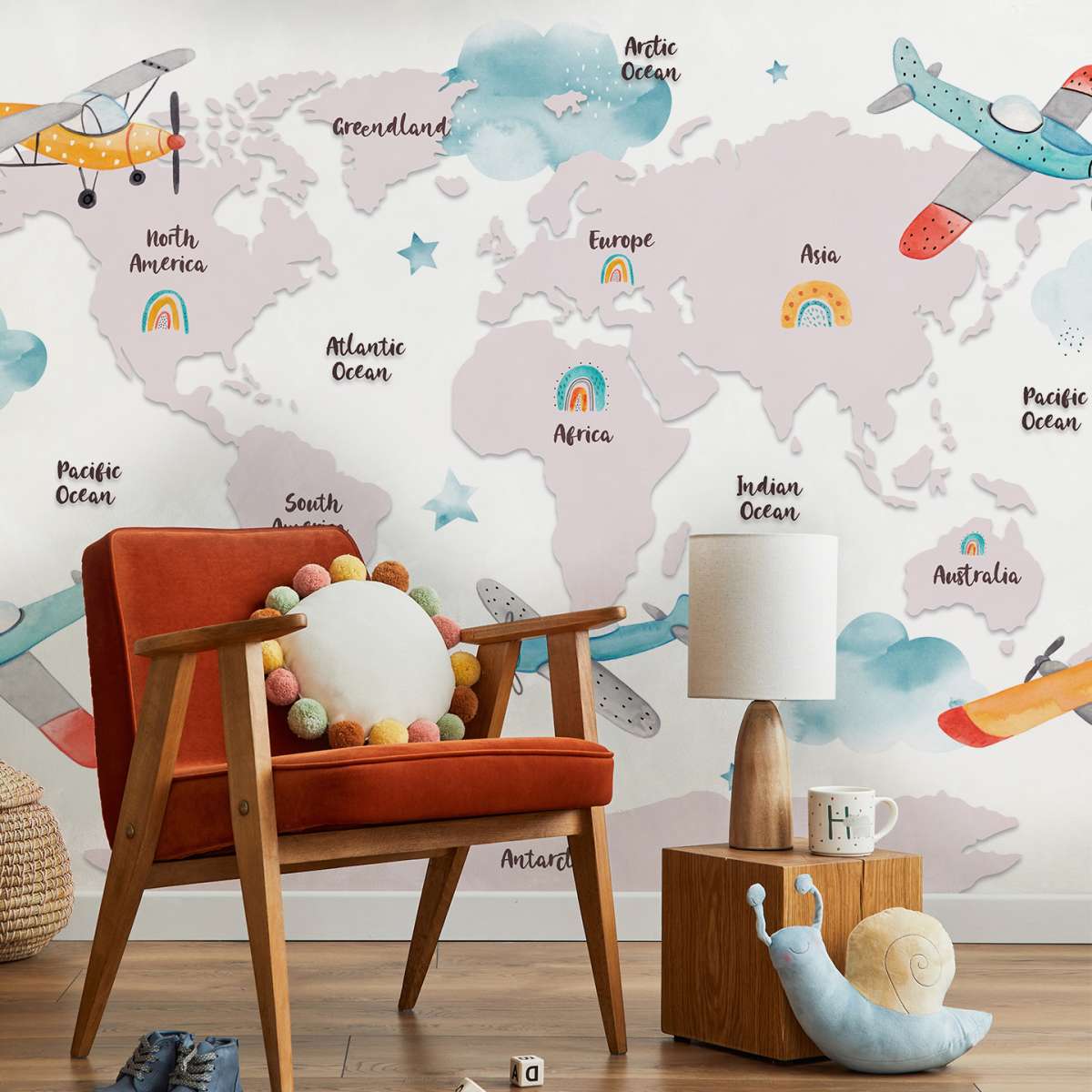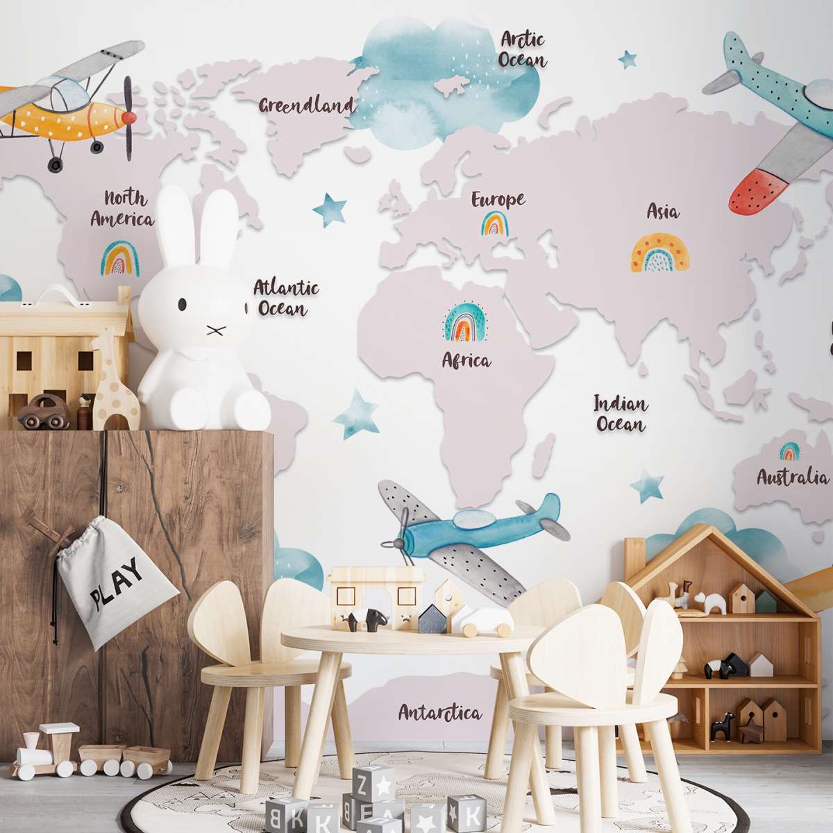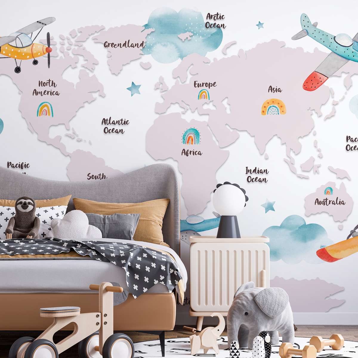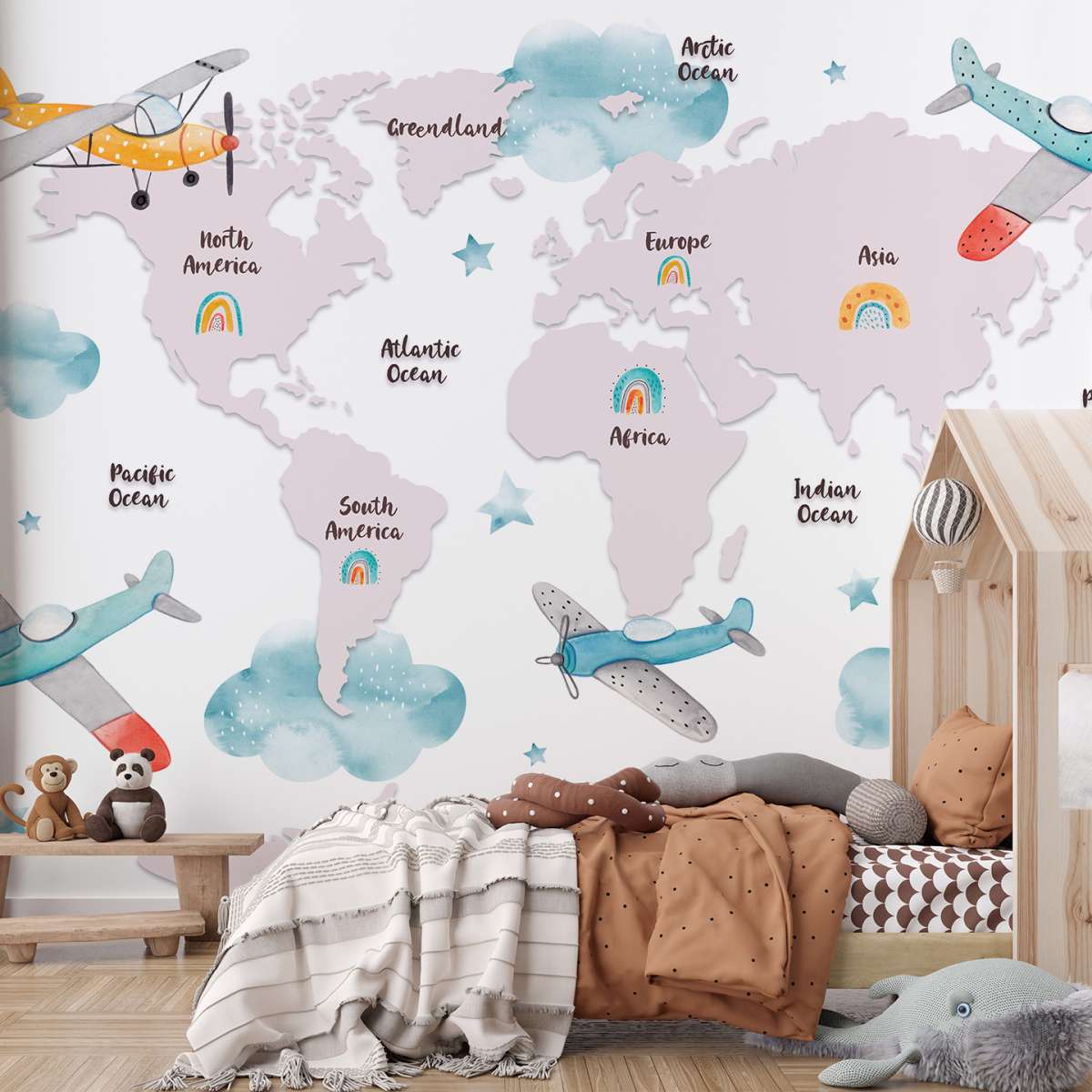 Mapa světa s názvy kontinentů, letadly a mraky - ilustrace
