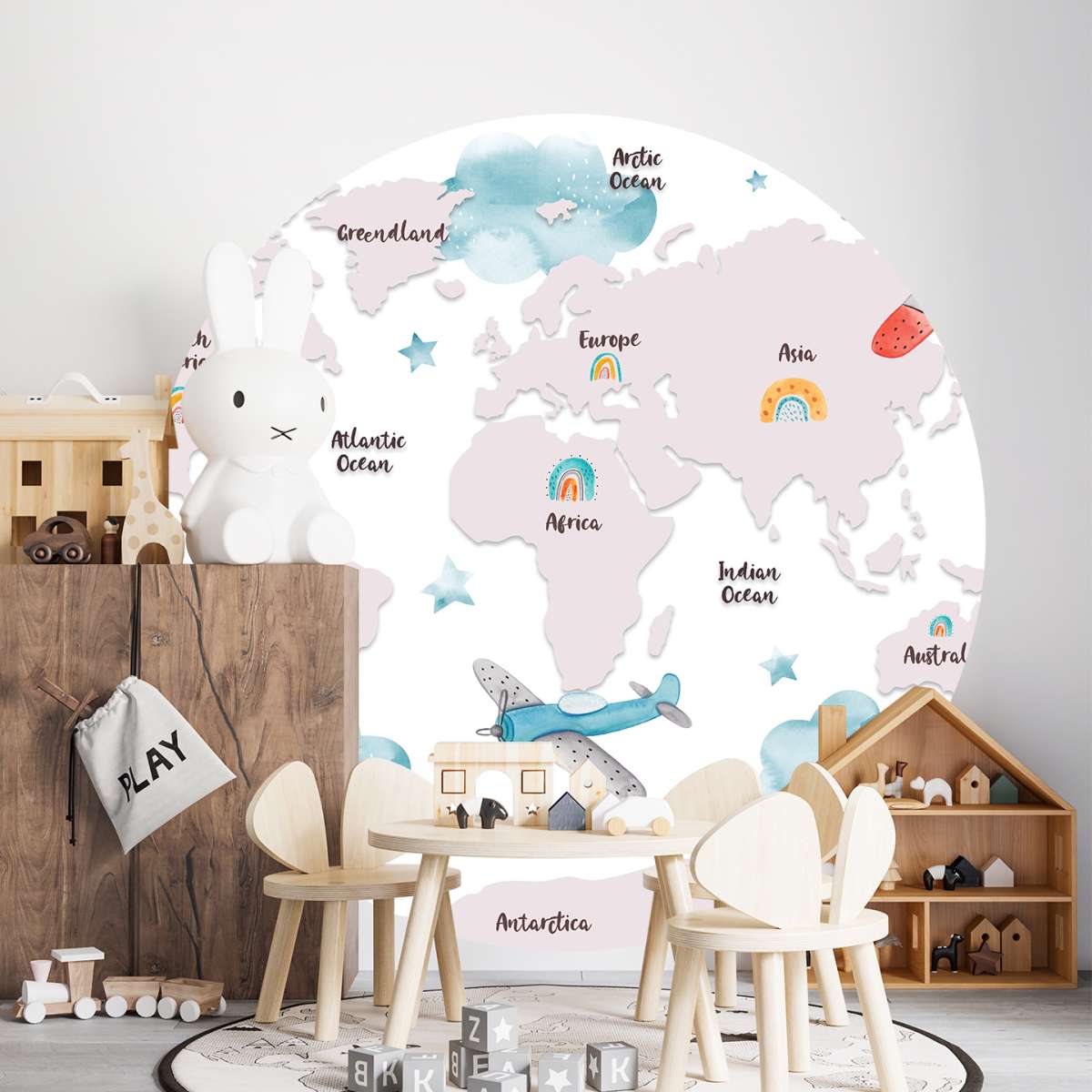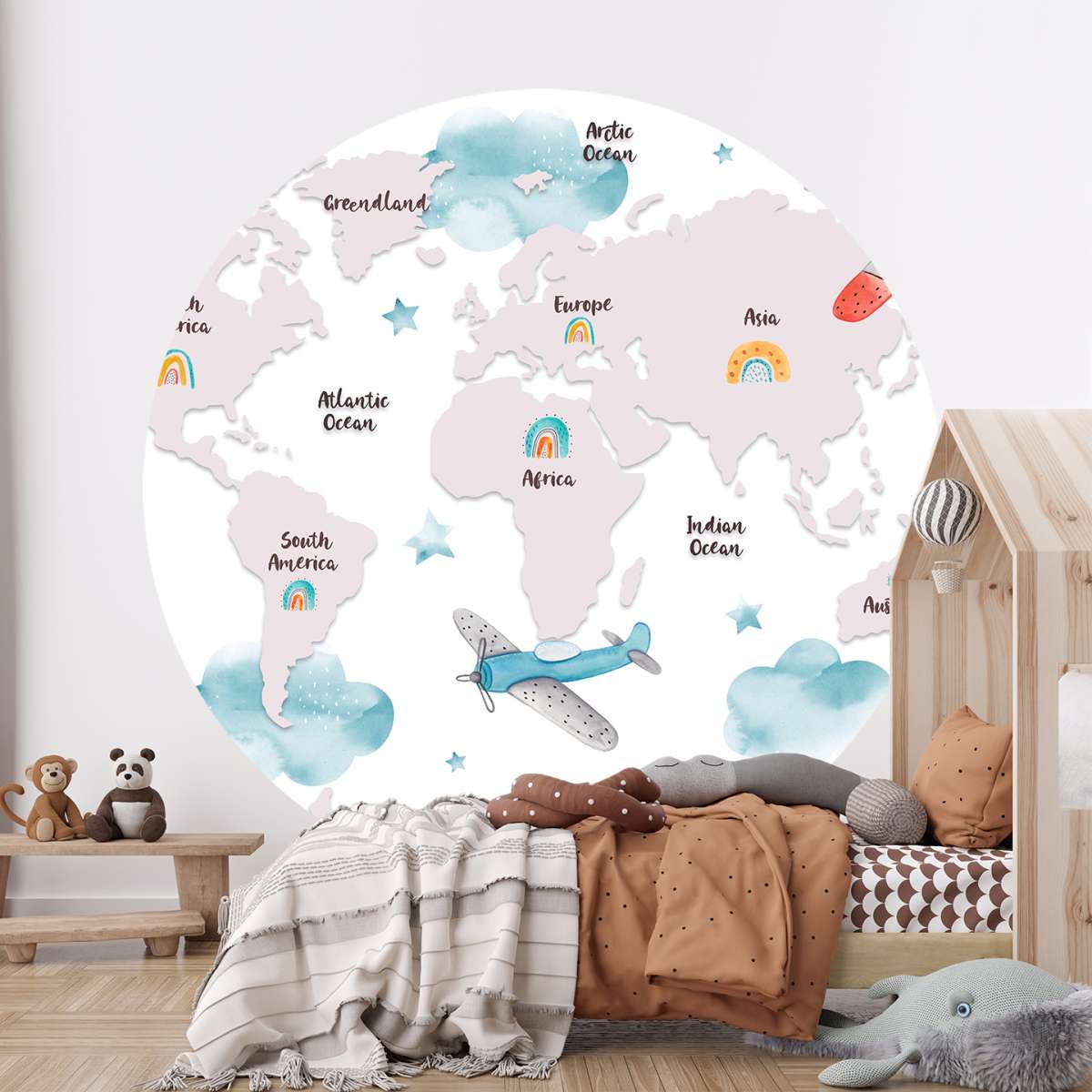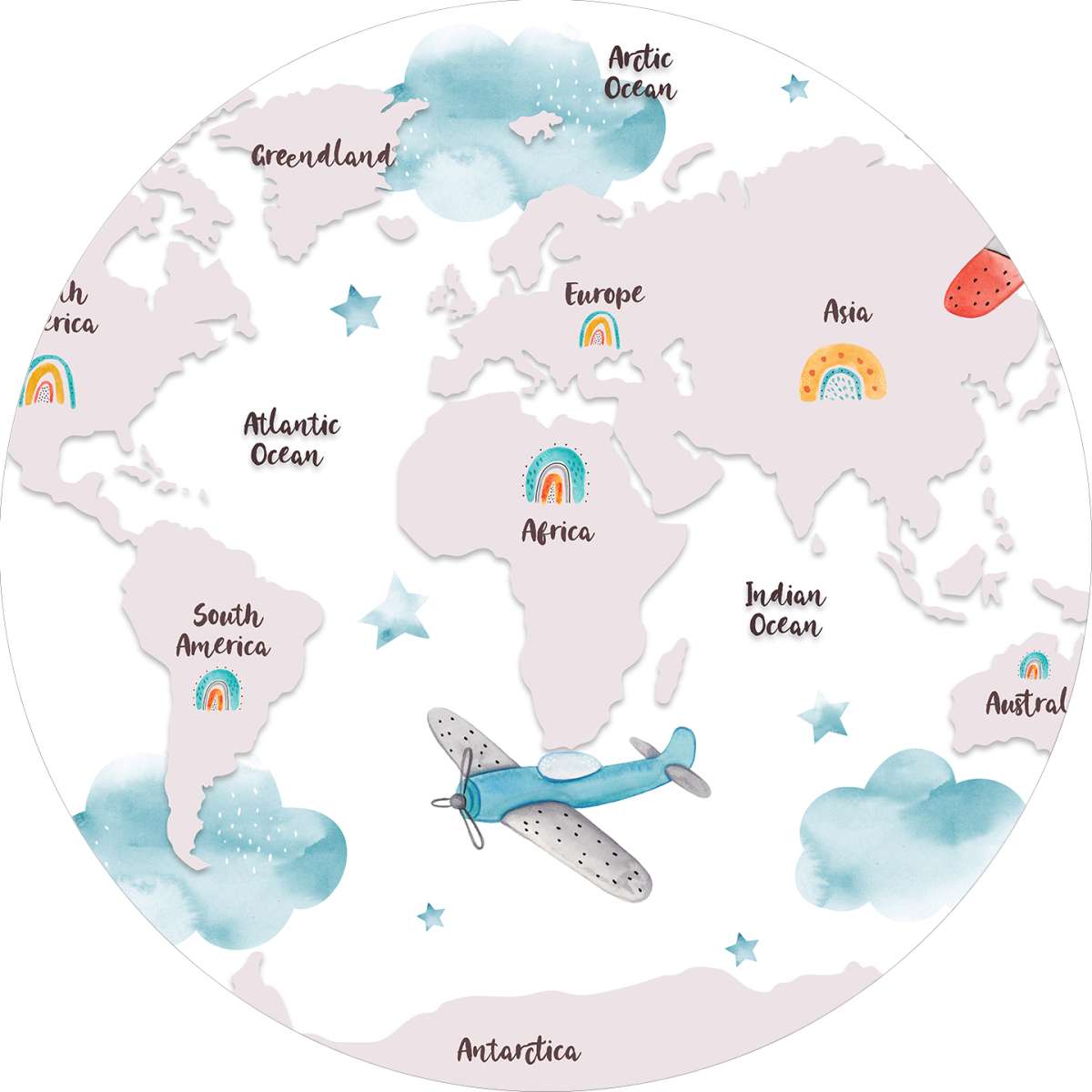Mapa světa s názvy kontinentů, letadly a mraky - ilustrace