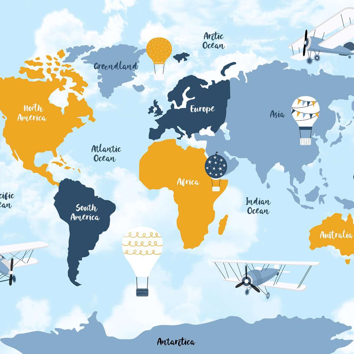 Modrá mapa světa s názvy kontinentů - ilustrace