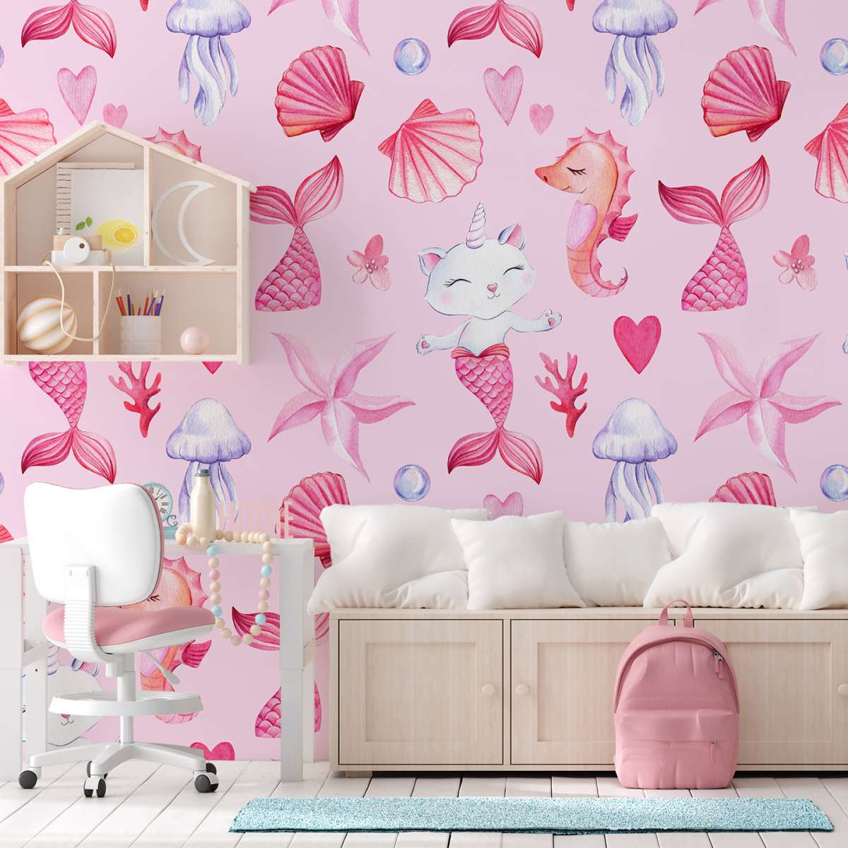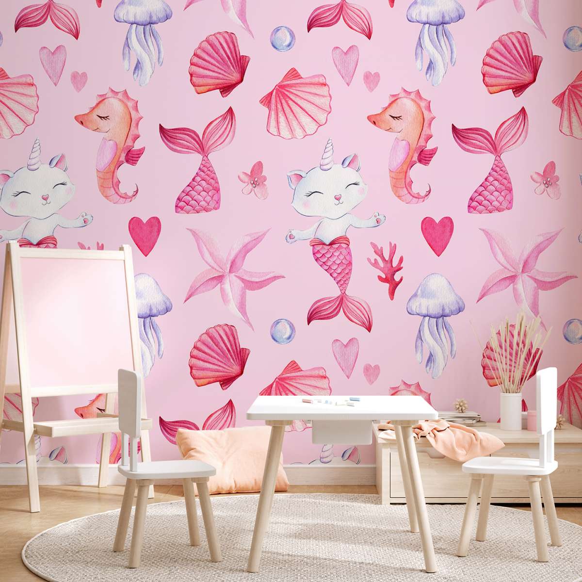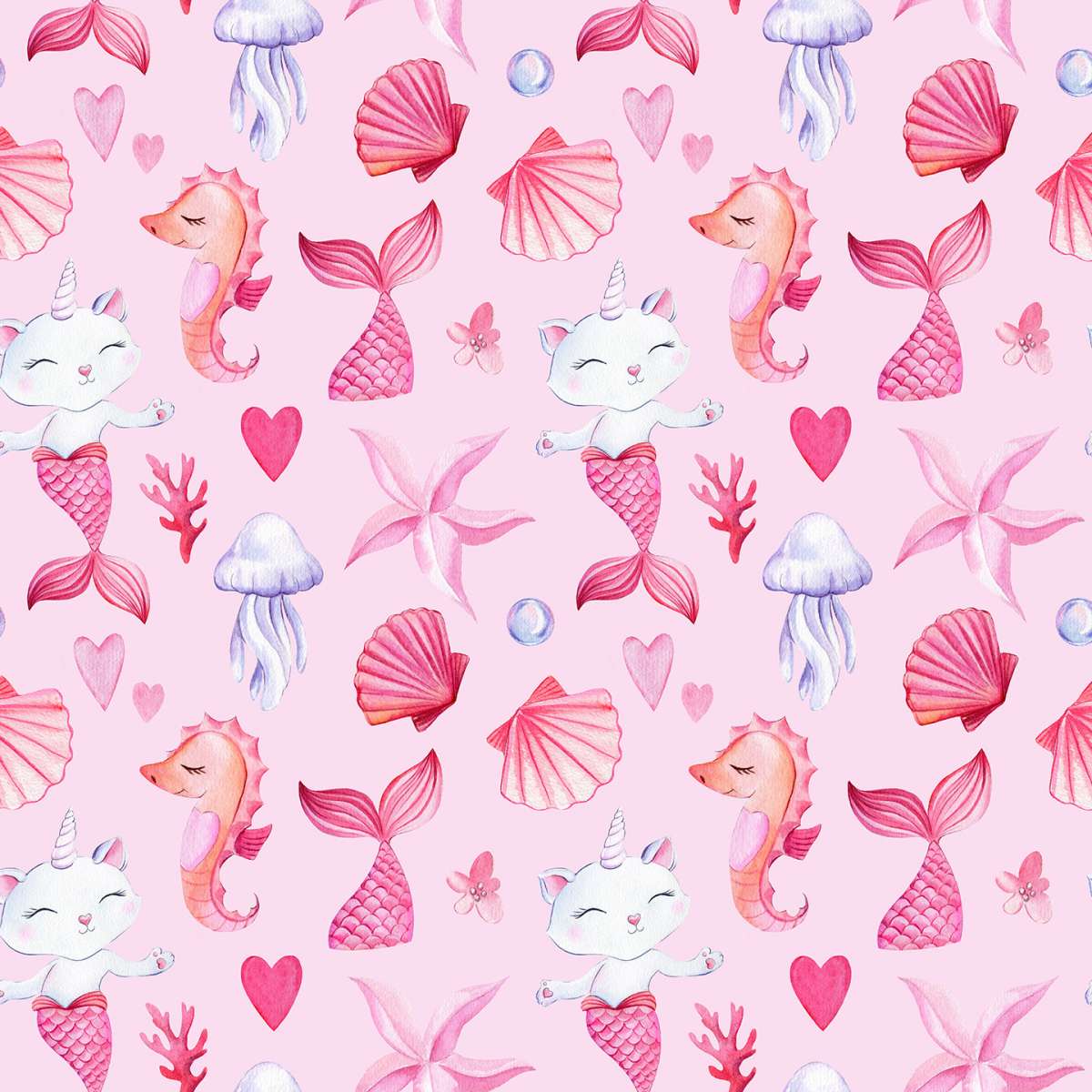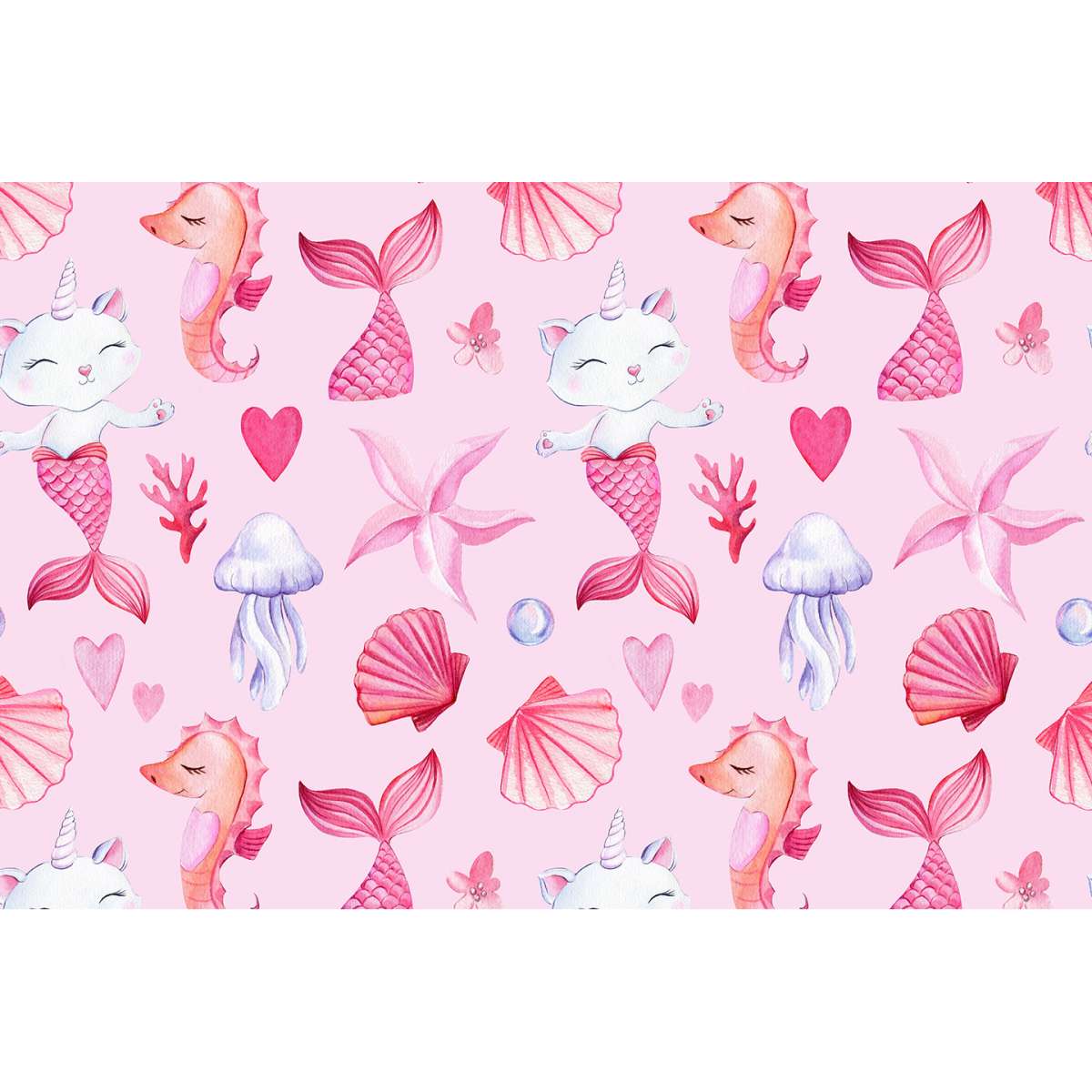 Mořská kočko-panna, růžový vzor - akvarel