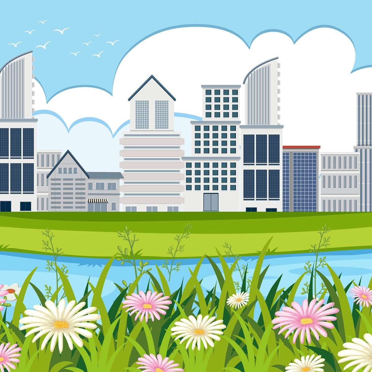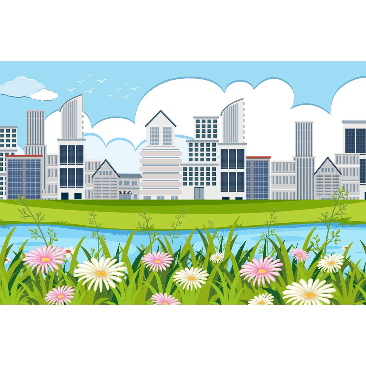 Panorama města, květiny u řeky - ilustrace