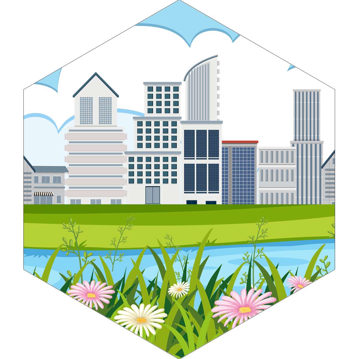 Panorama města, květiny u řeky - ilustrace