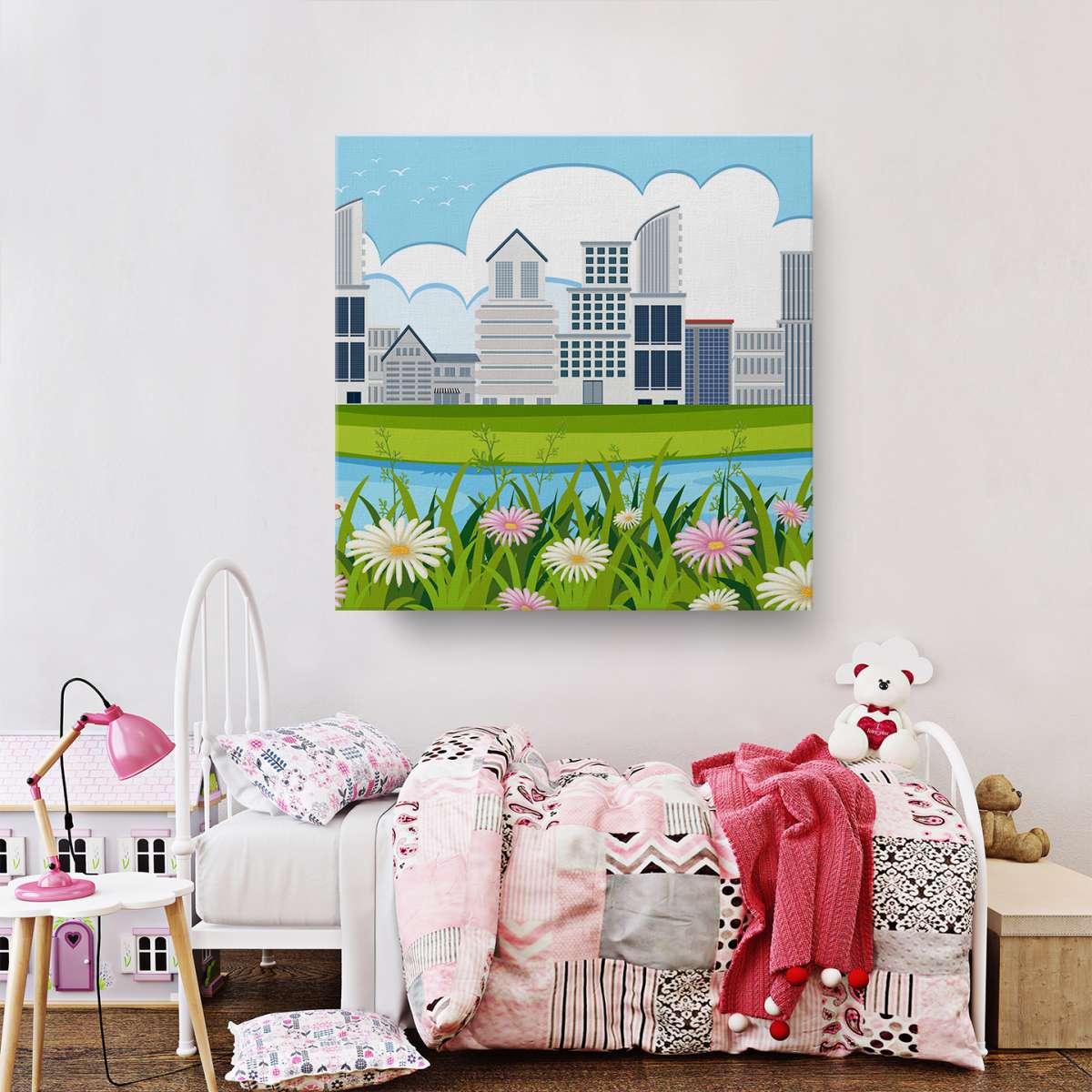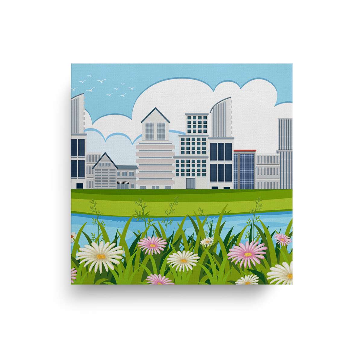 Panorama města, květiny u řeky - ilustrace