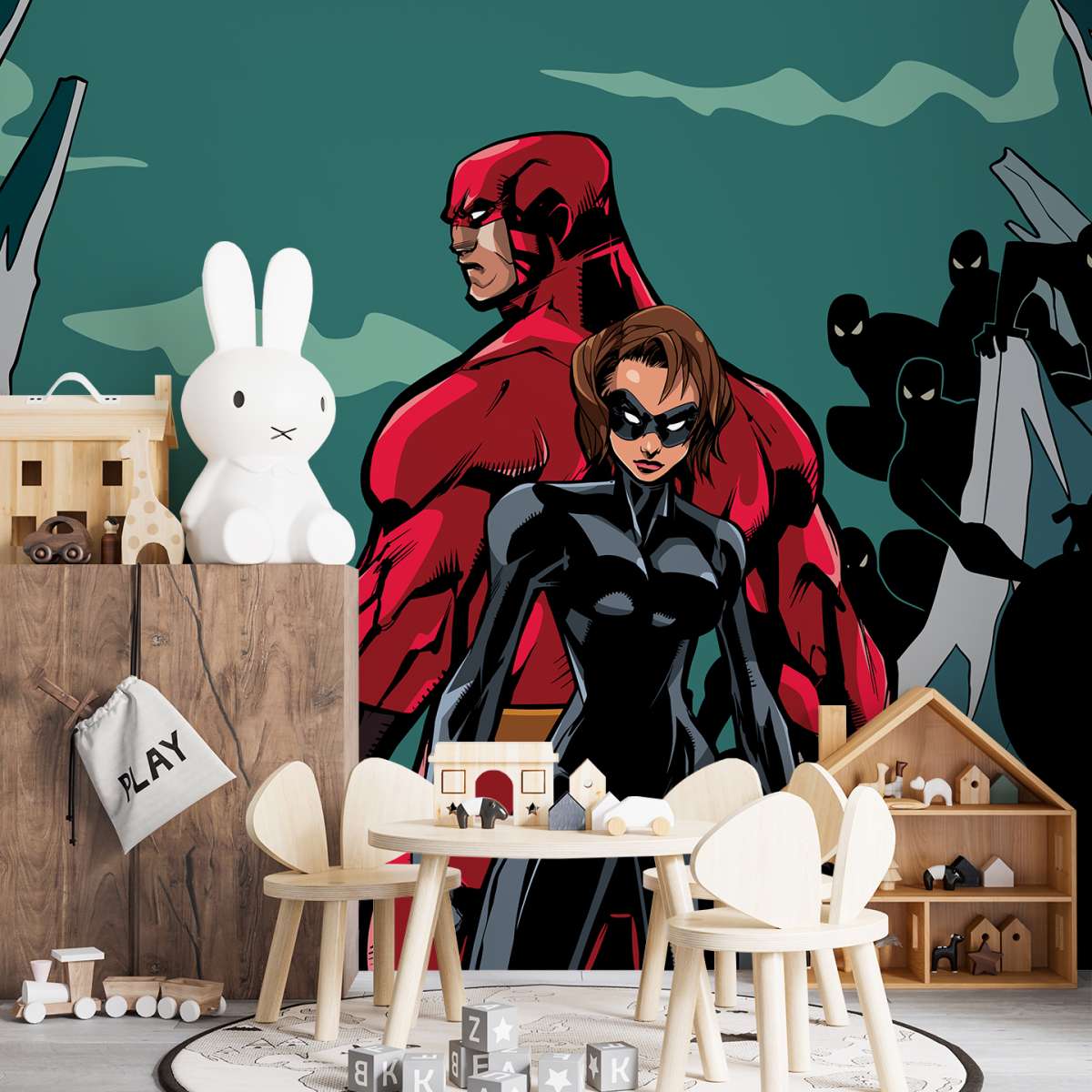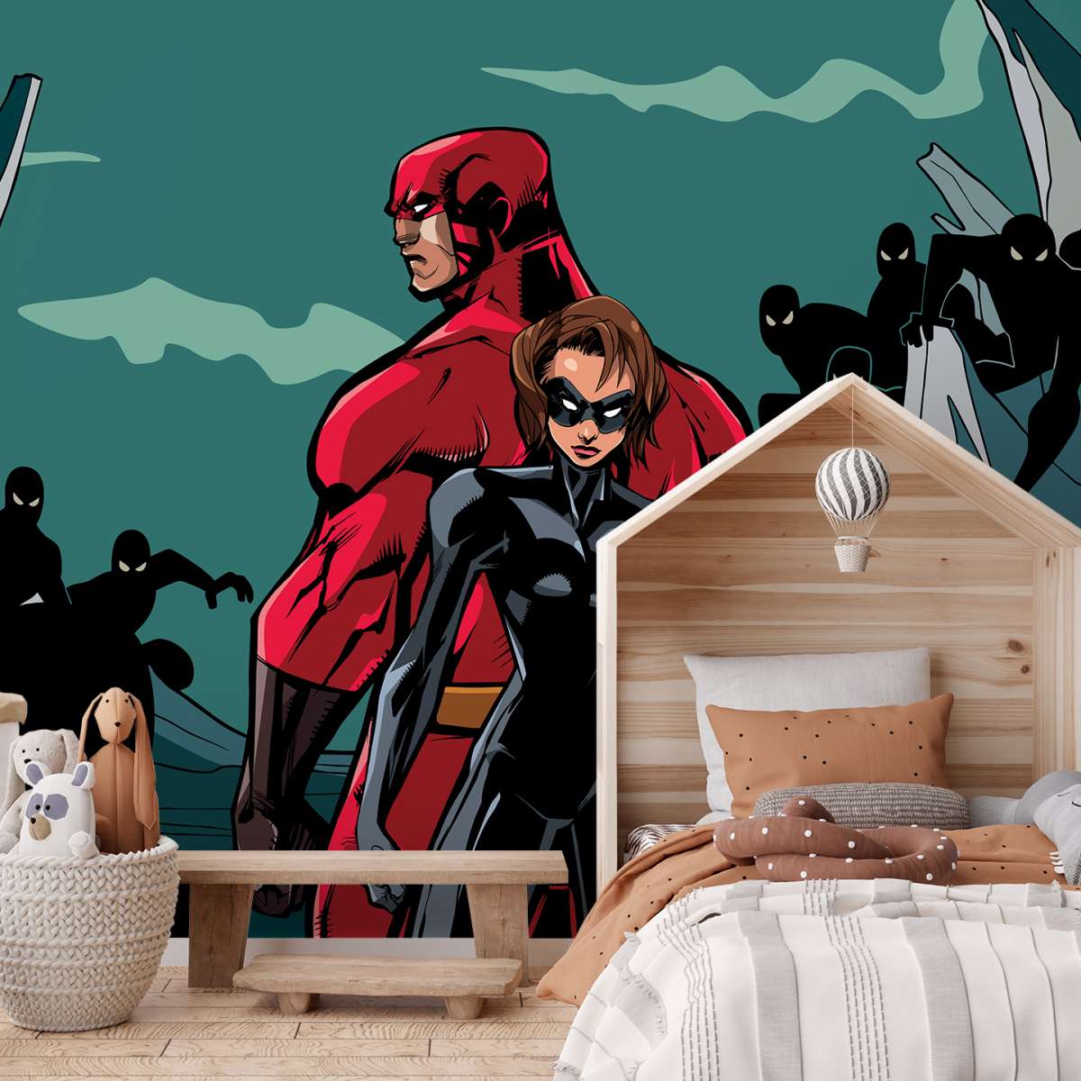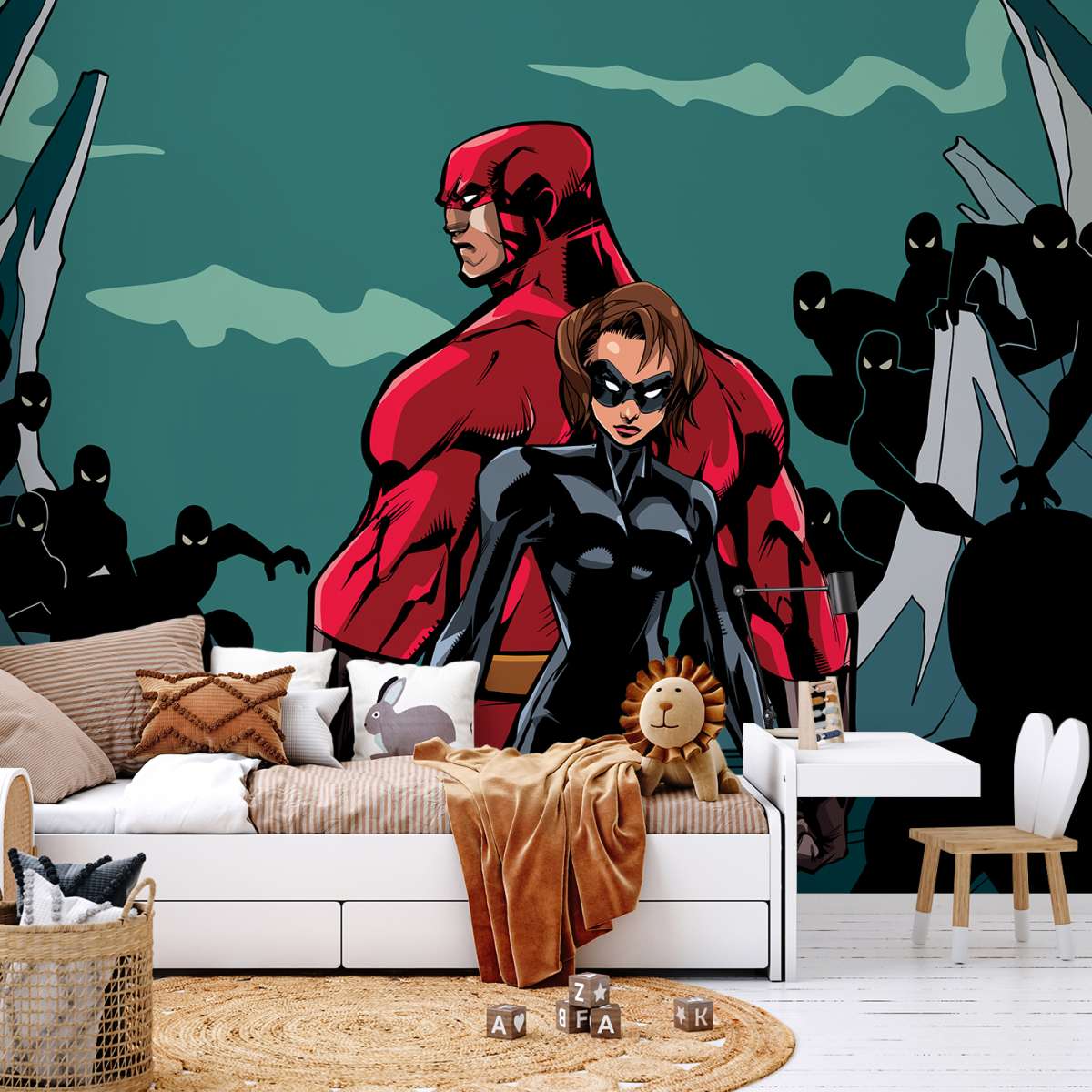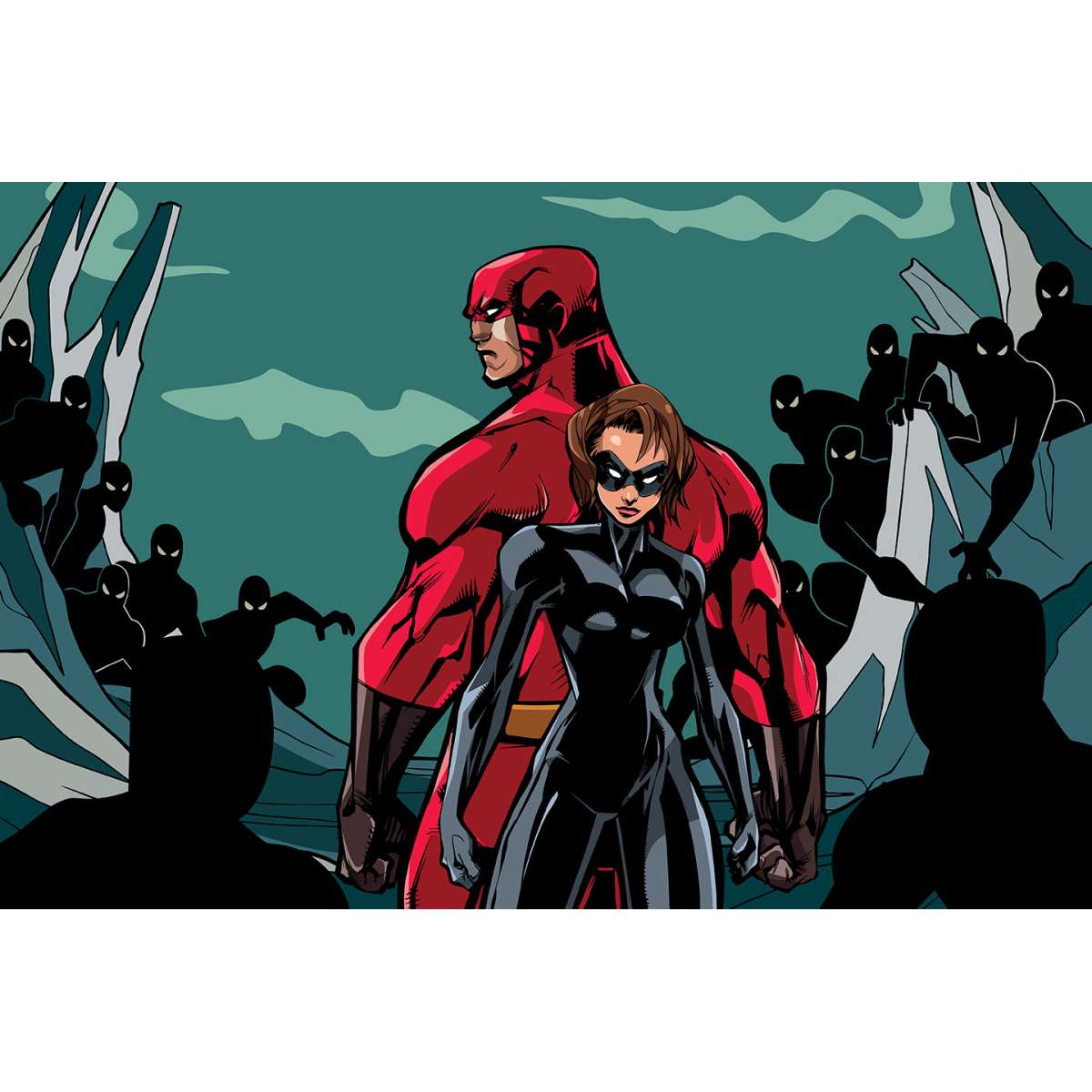 Pár superhrdinů bojující proti nepřátelům - ilustrace