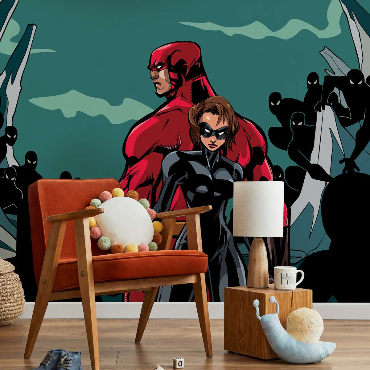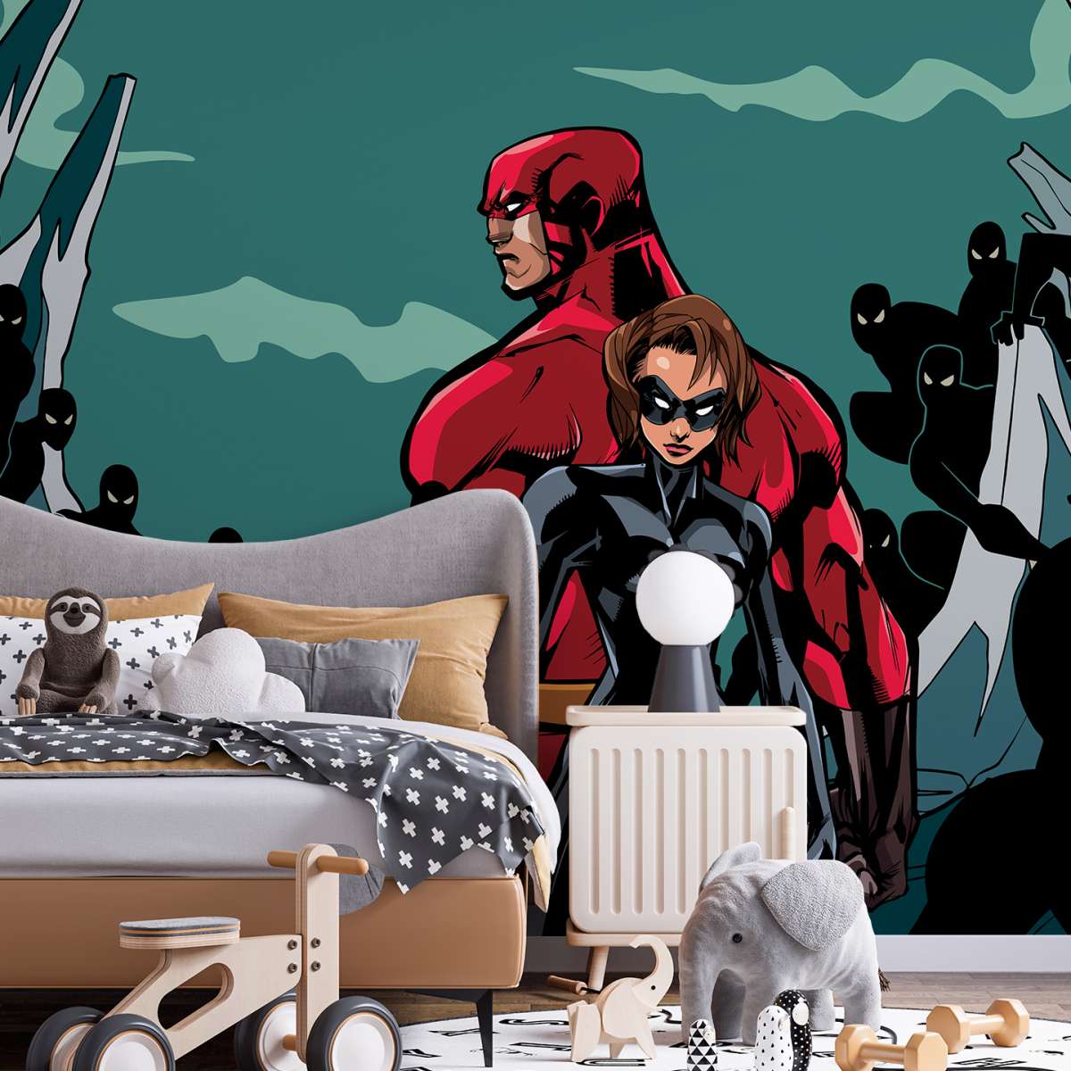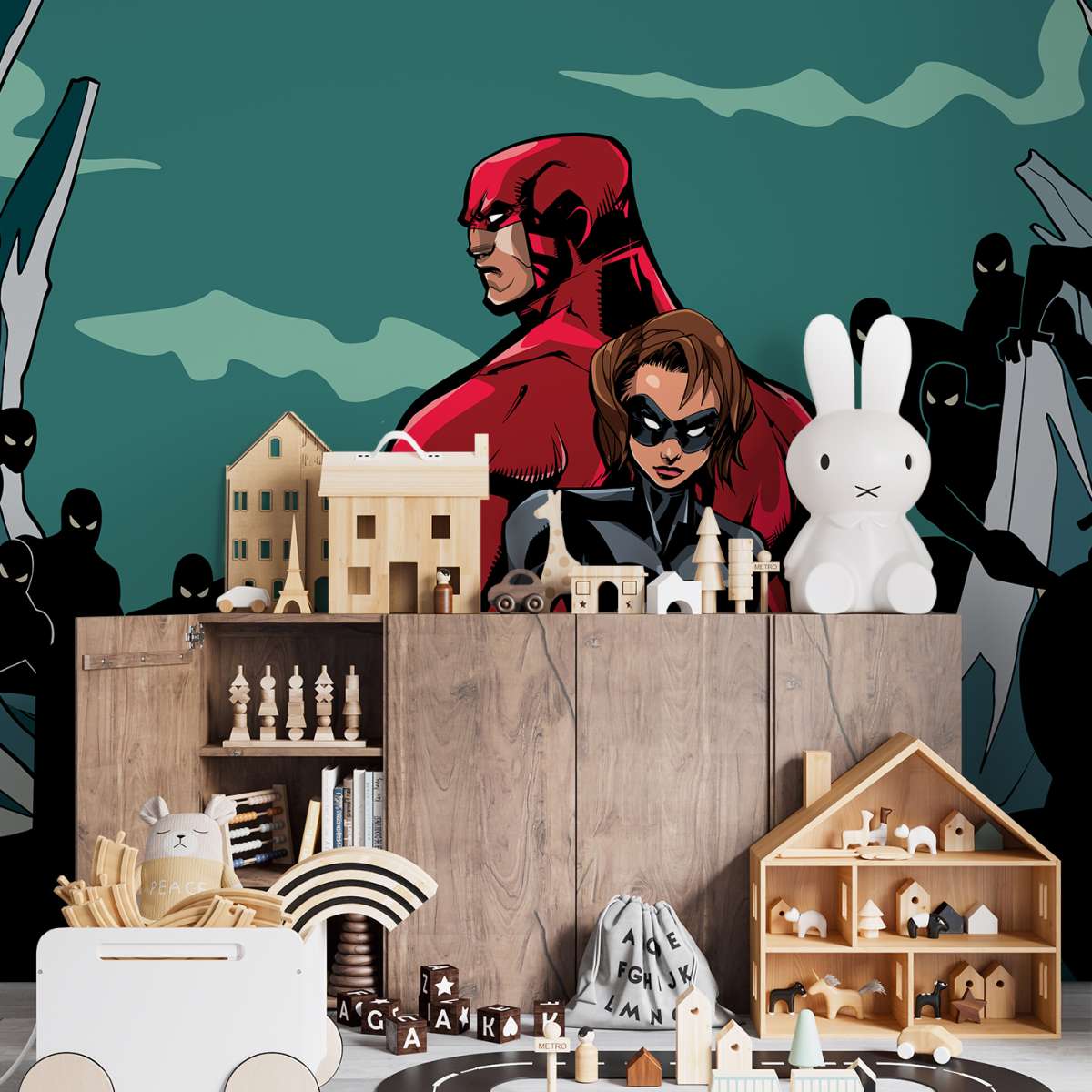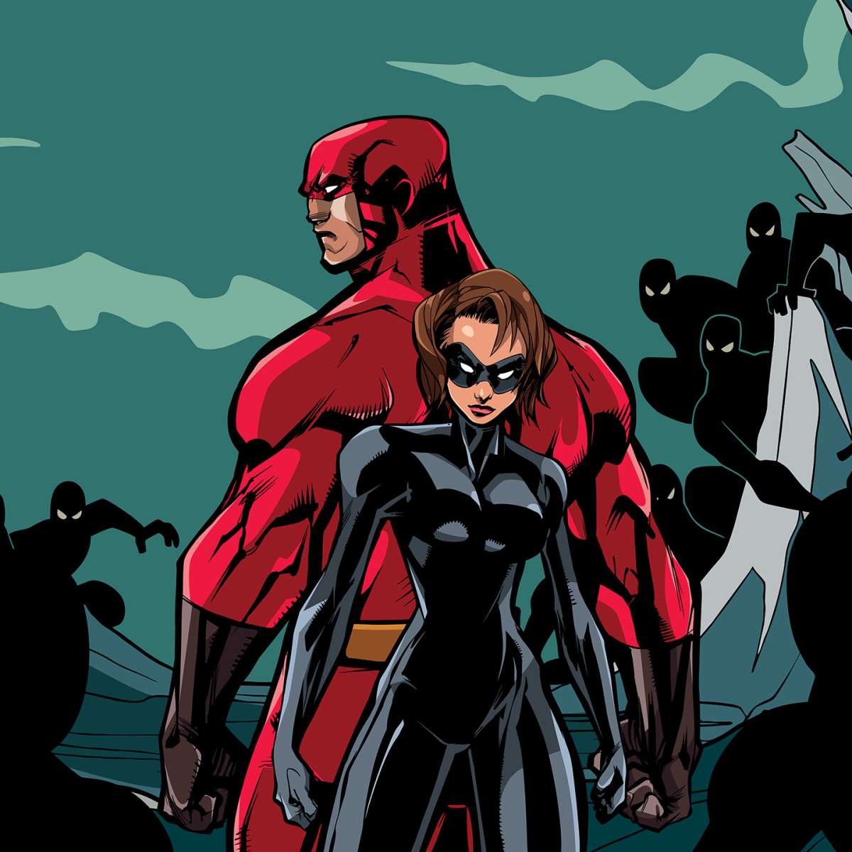 Pár superhrdinů bojující proti nepřátelům - ilustrace