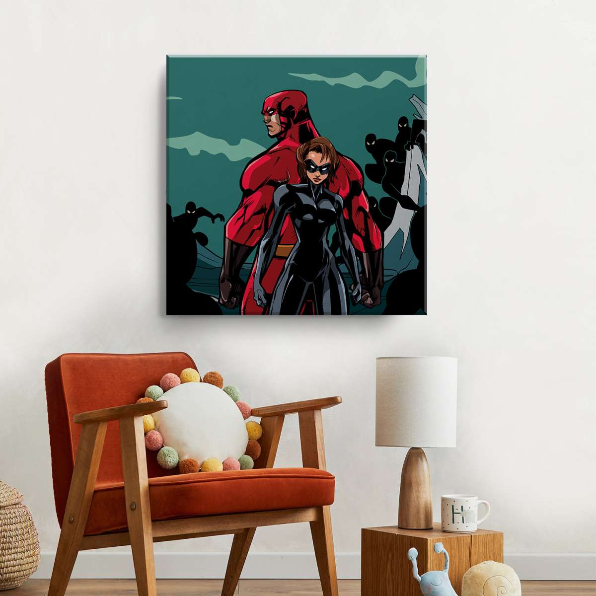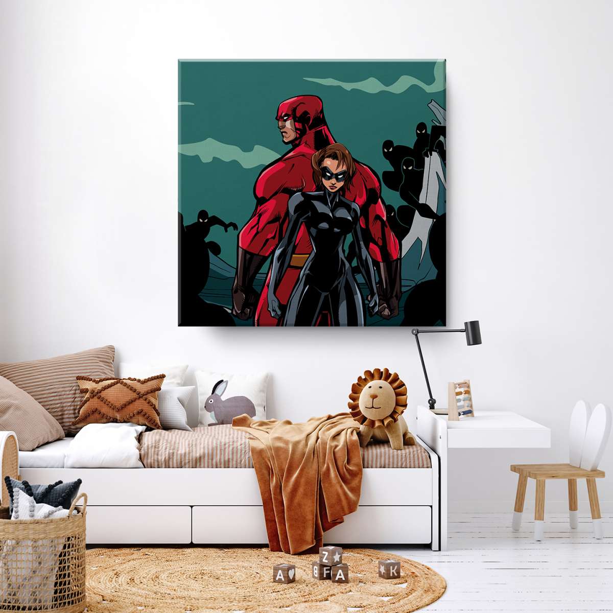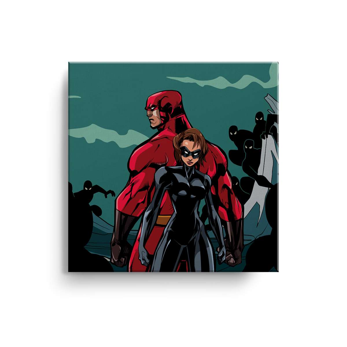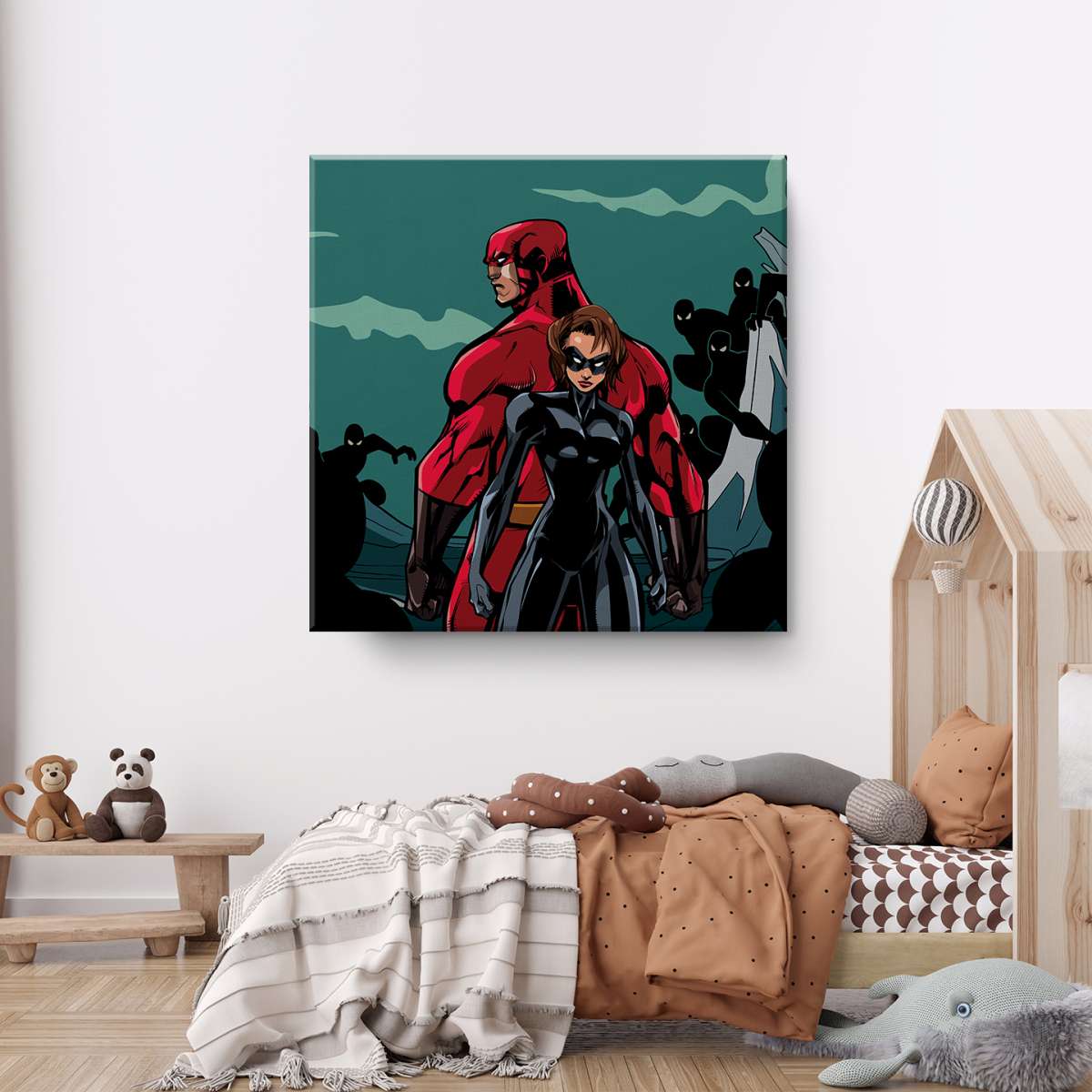 Pár superhrdinů bojující proti nepřátelům - ilustrace