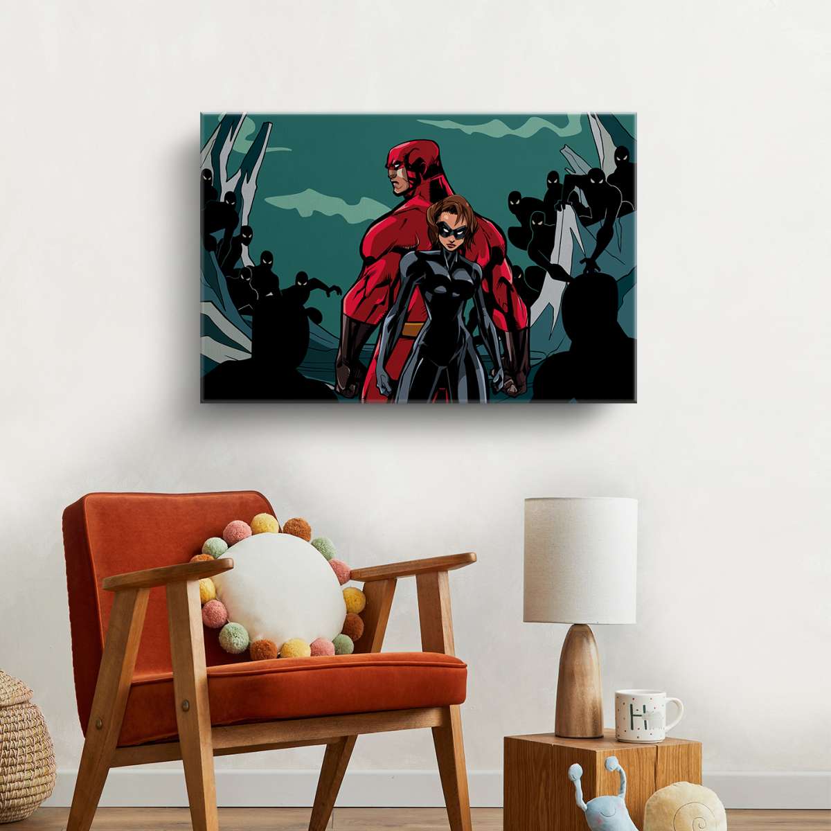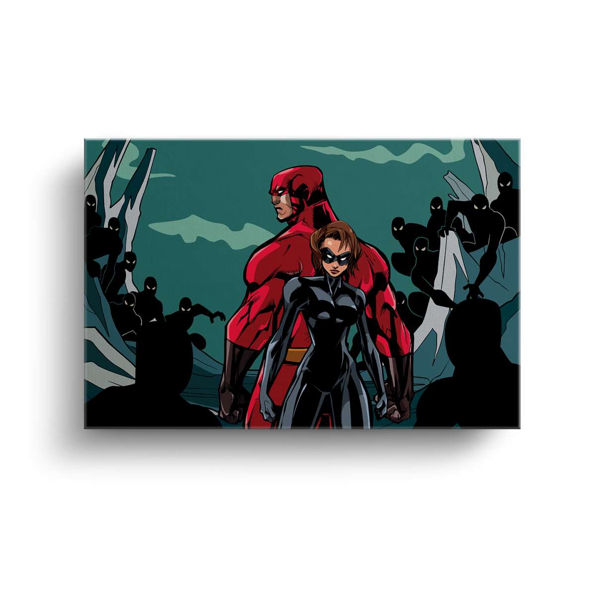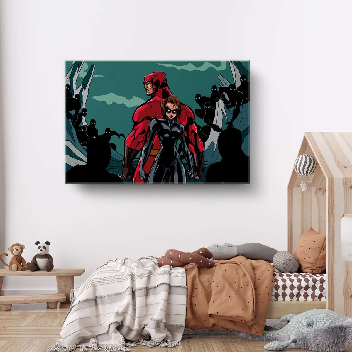 Pár superhrdinů bojující proti nepřátelům - ilustrace