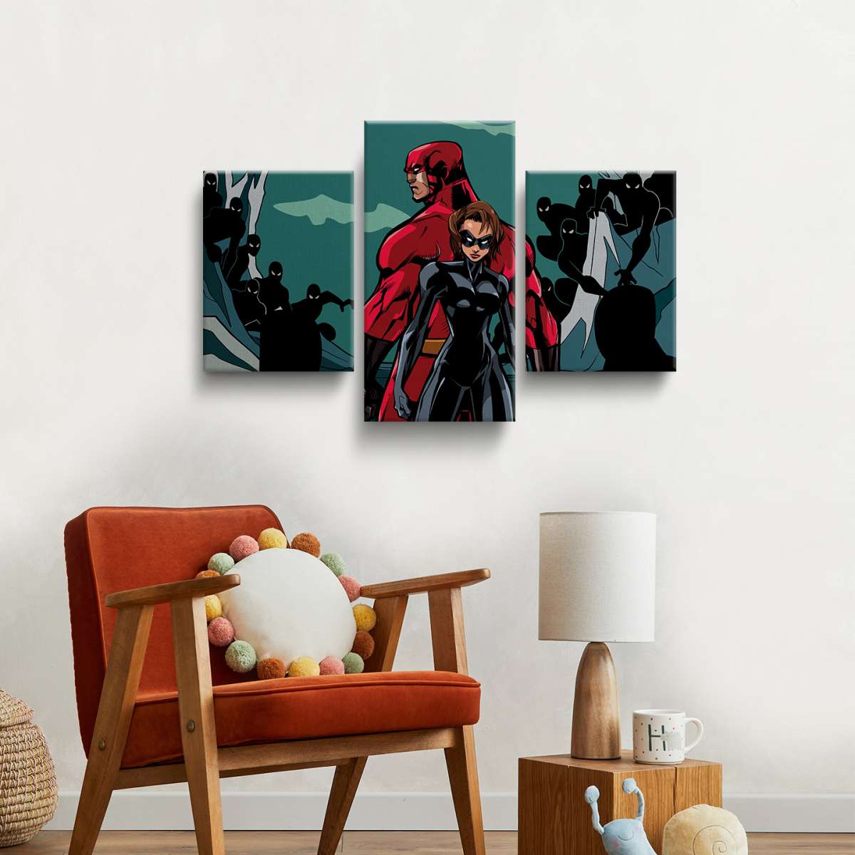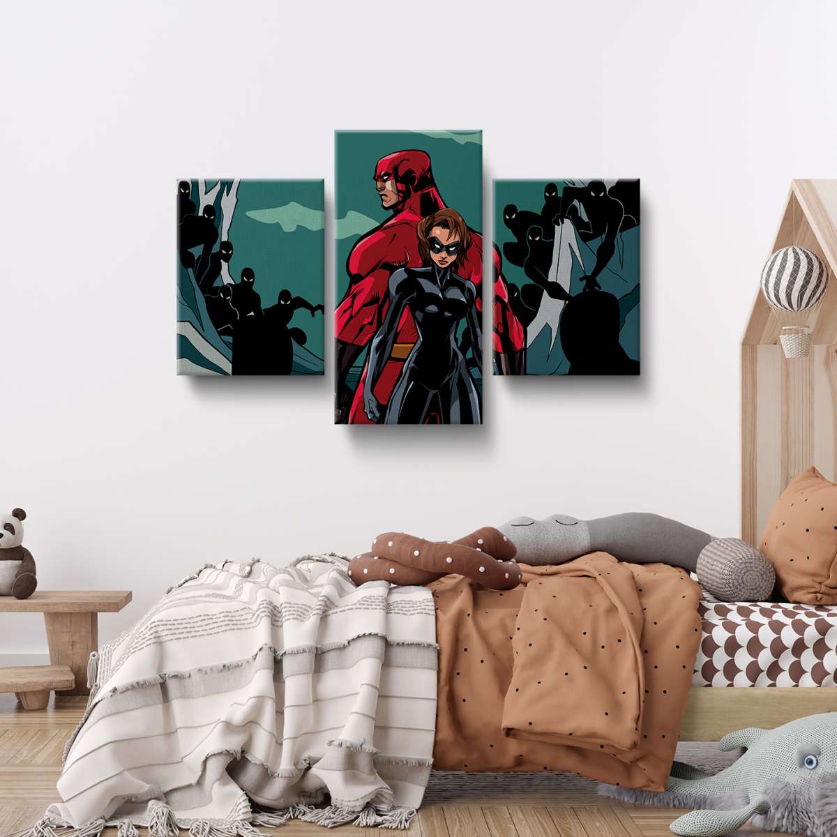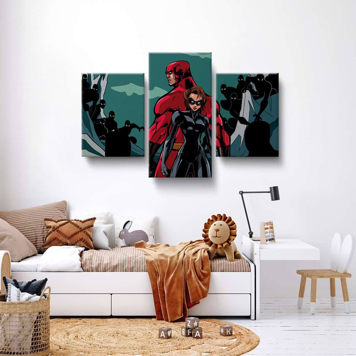 Pár superhrdinů bojující proti nepřátelům - ilustrace