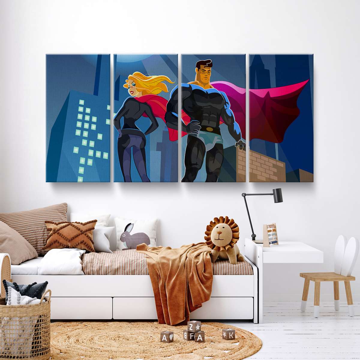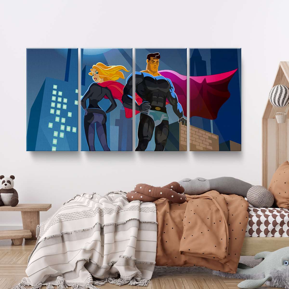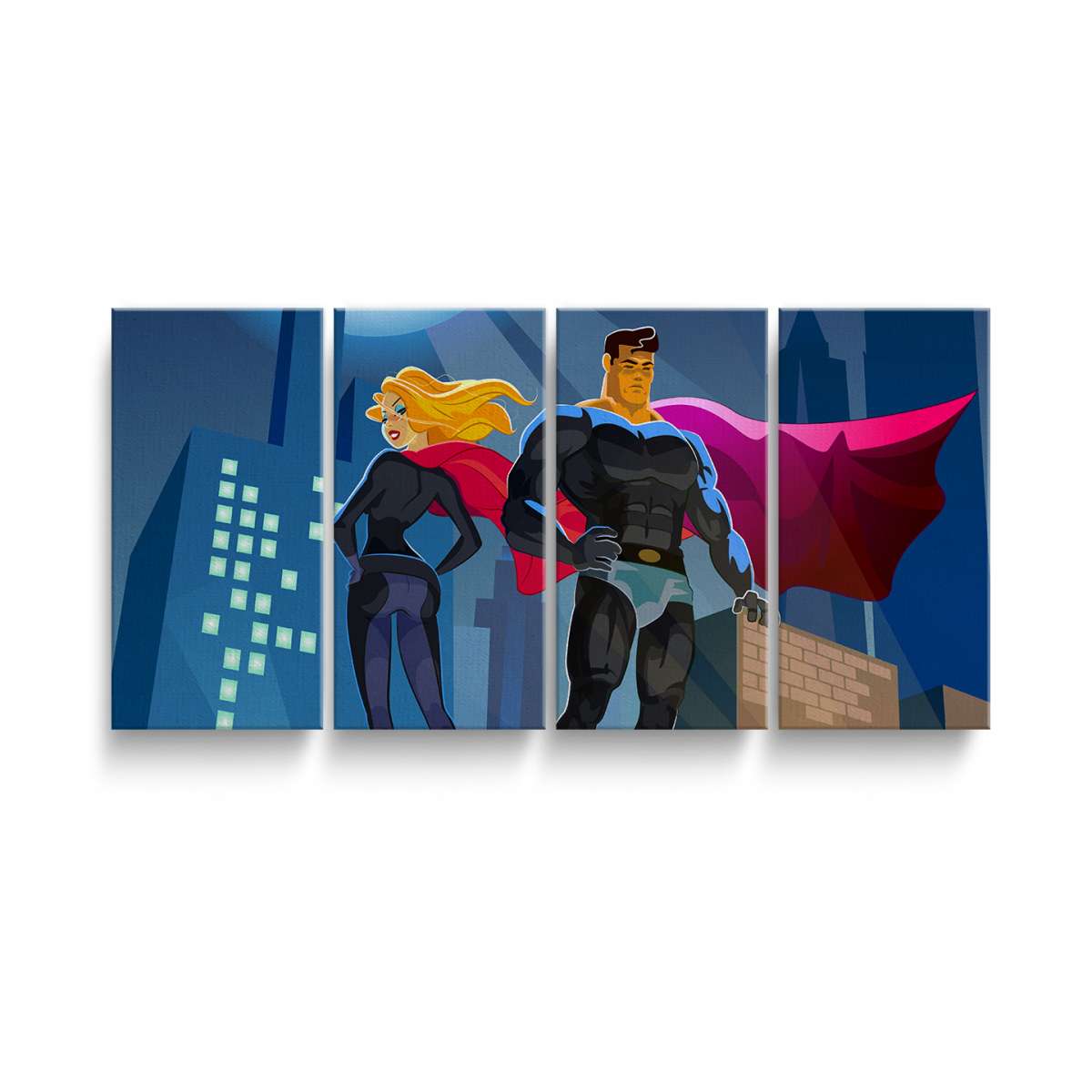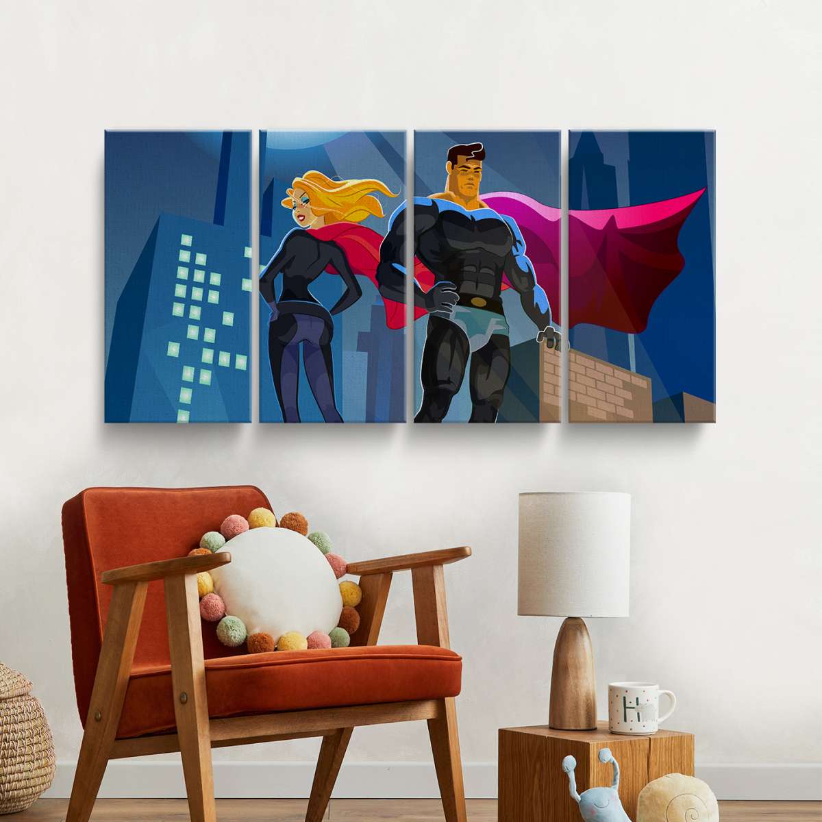 Pár superhrdinů na střeše mrakodrapu - ilustrace