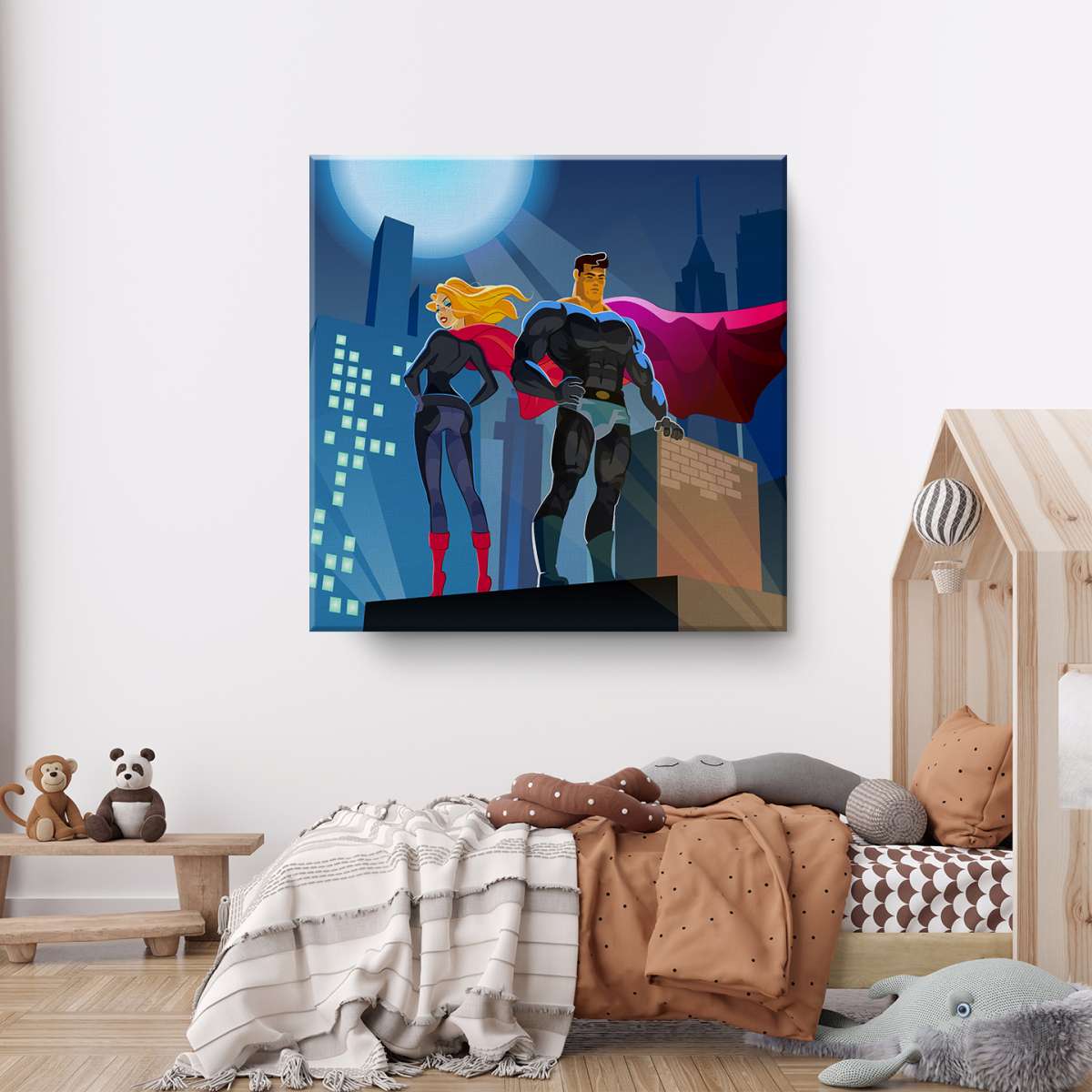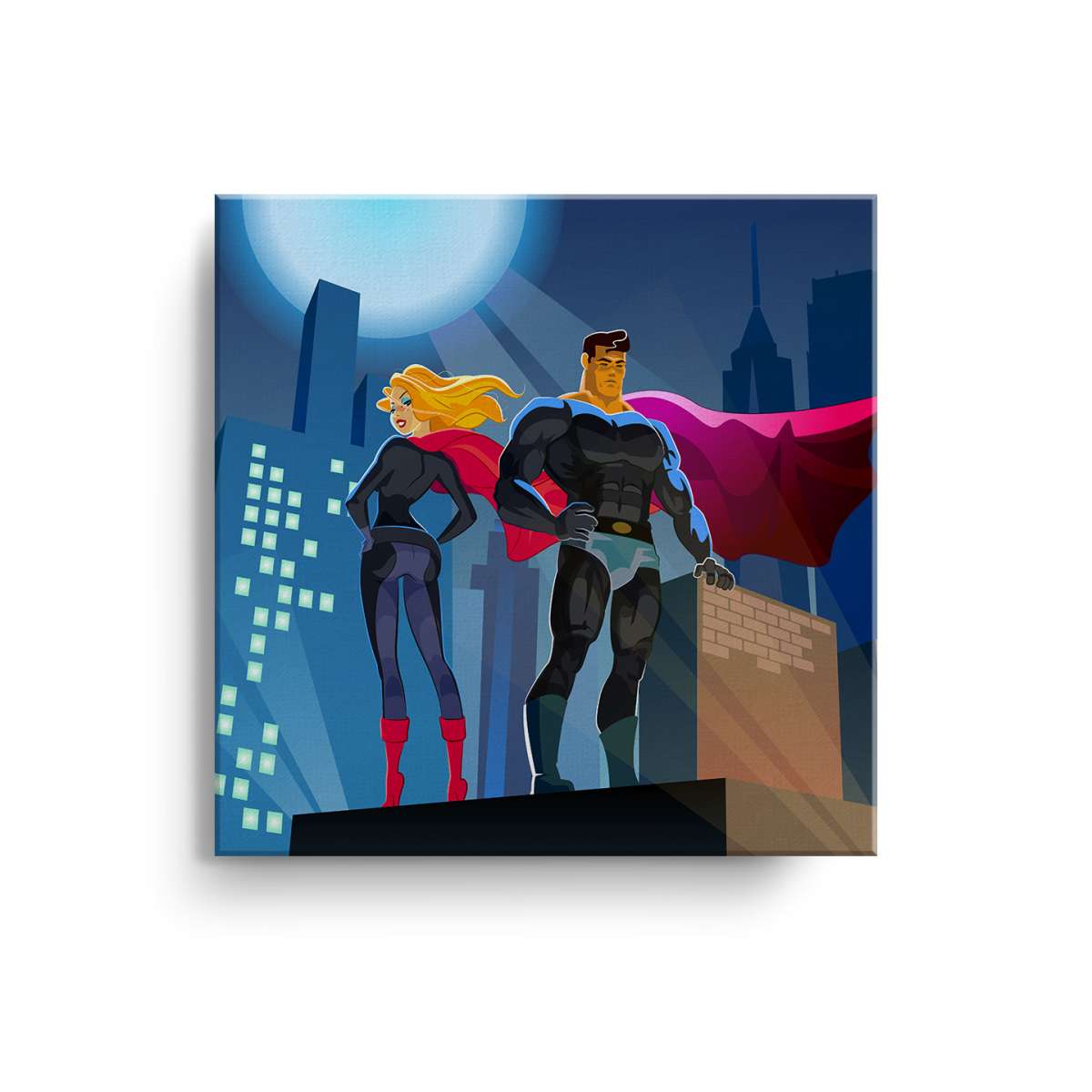 Pár superhrdinů na střeše mrakodrapu - ilustrace