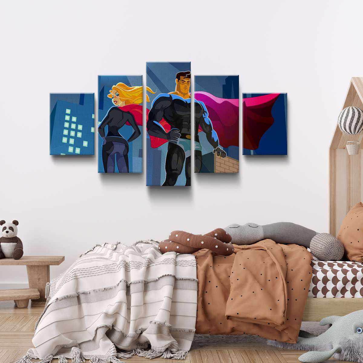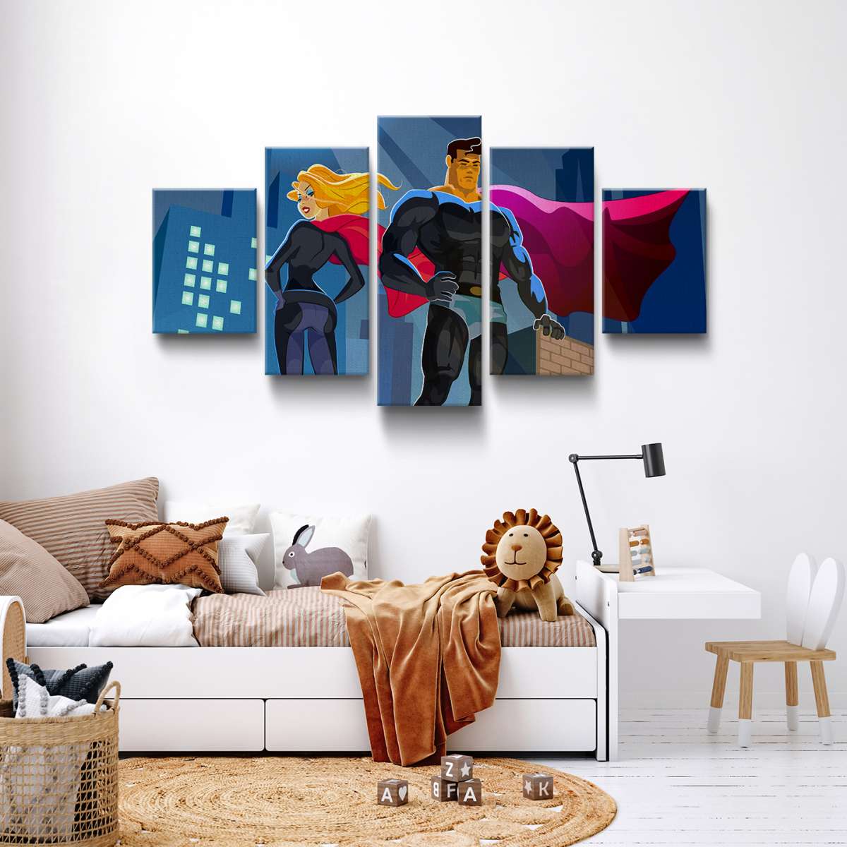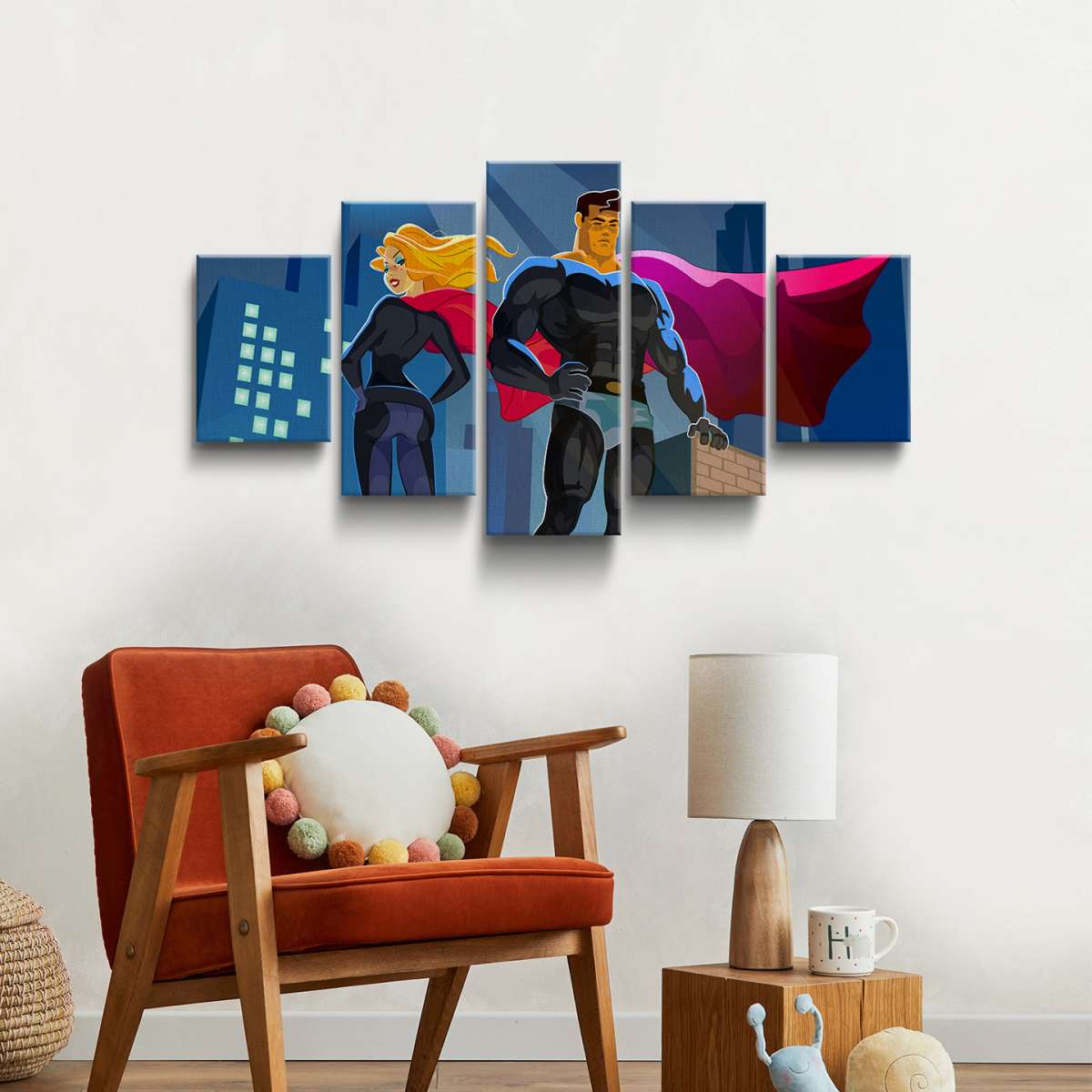 Pár superhrdinů na střeše mrakodrapu - ilustrace