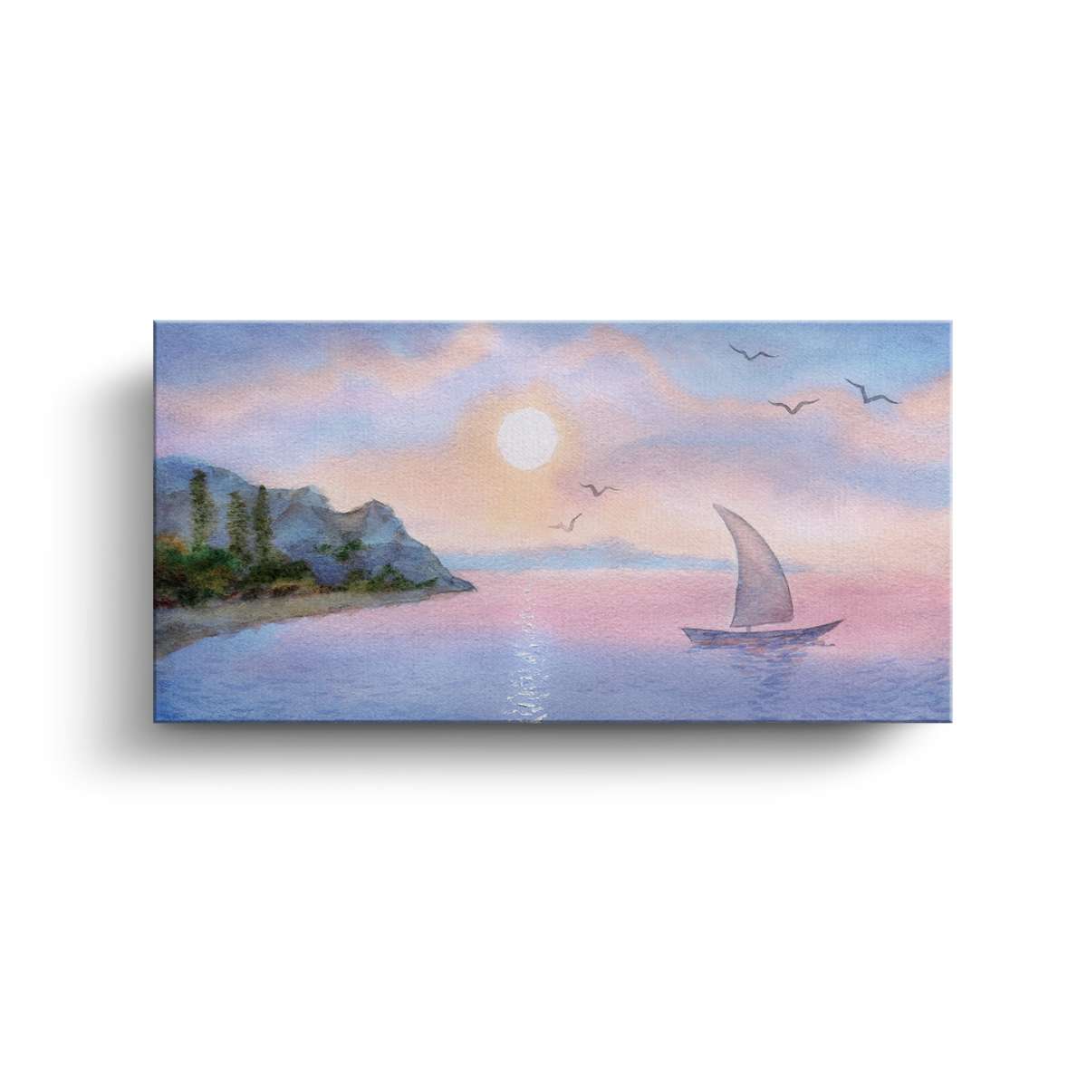 Plachetnice na moři při západu slunce - akvarel