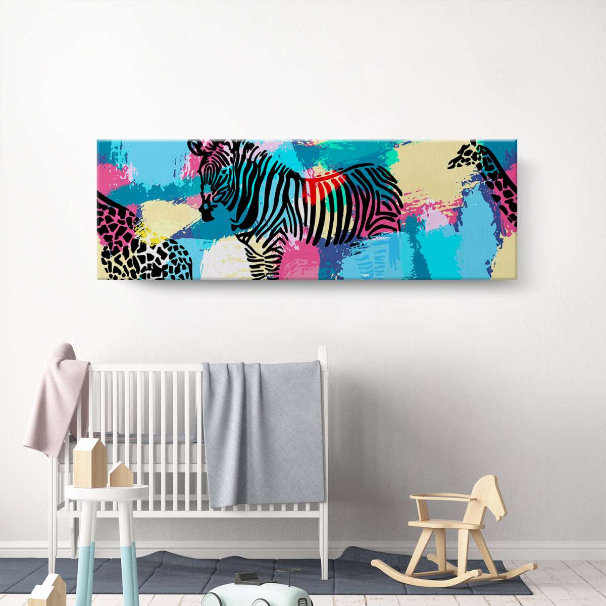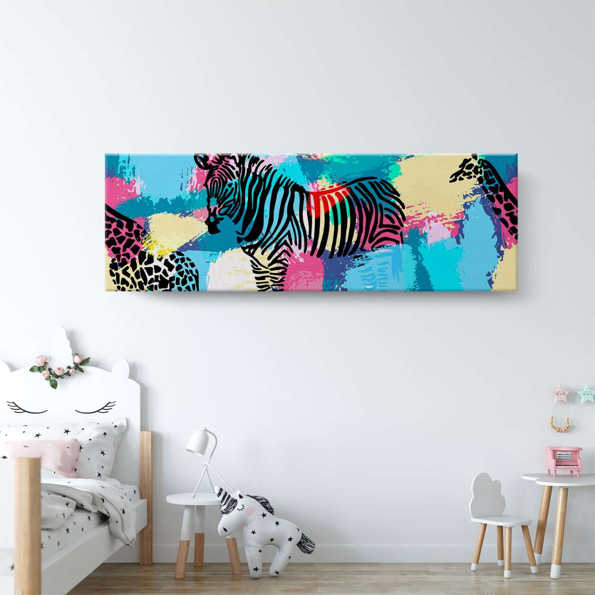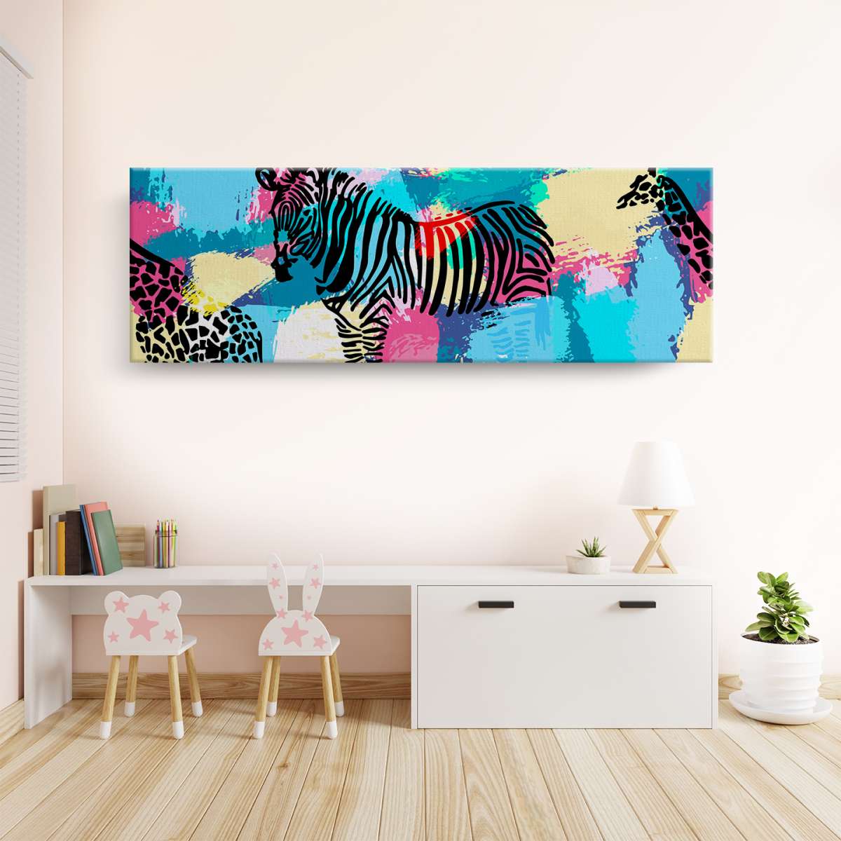 Zebry a žirafy na barevném pozadí - ilustrace