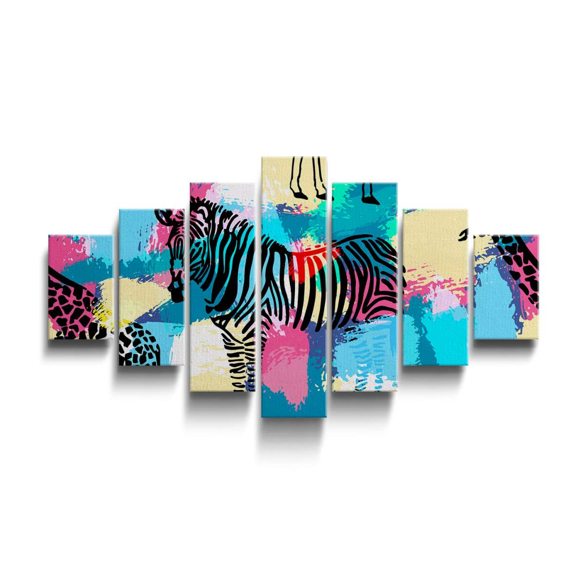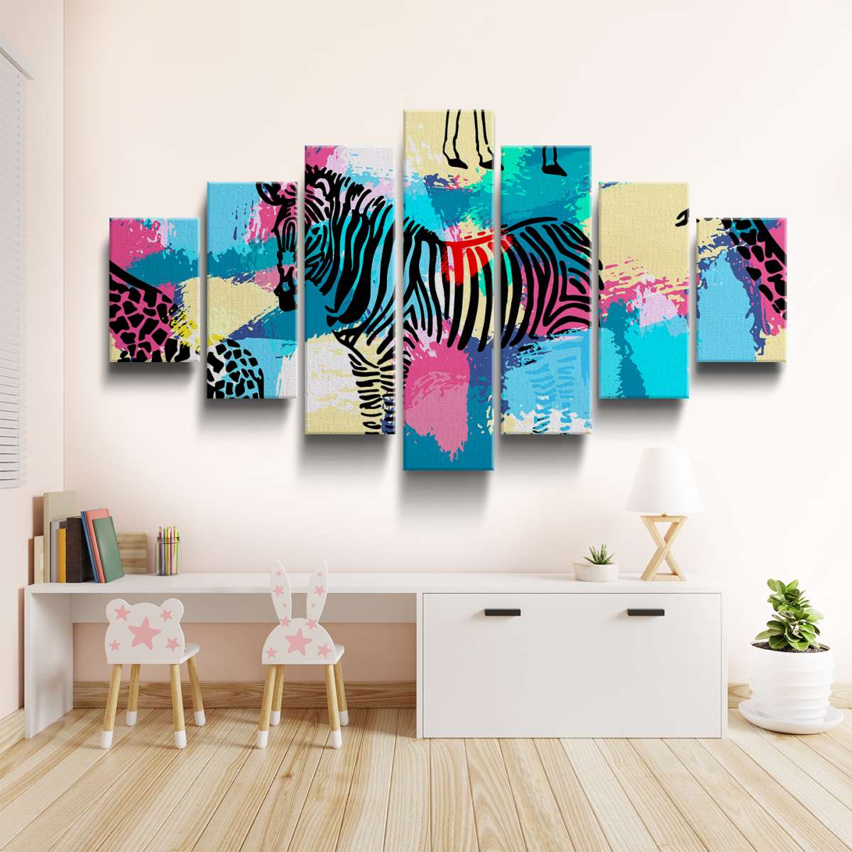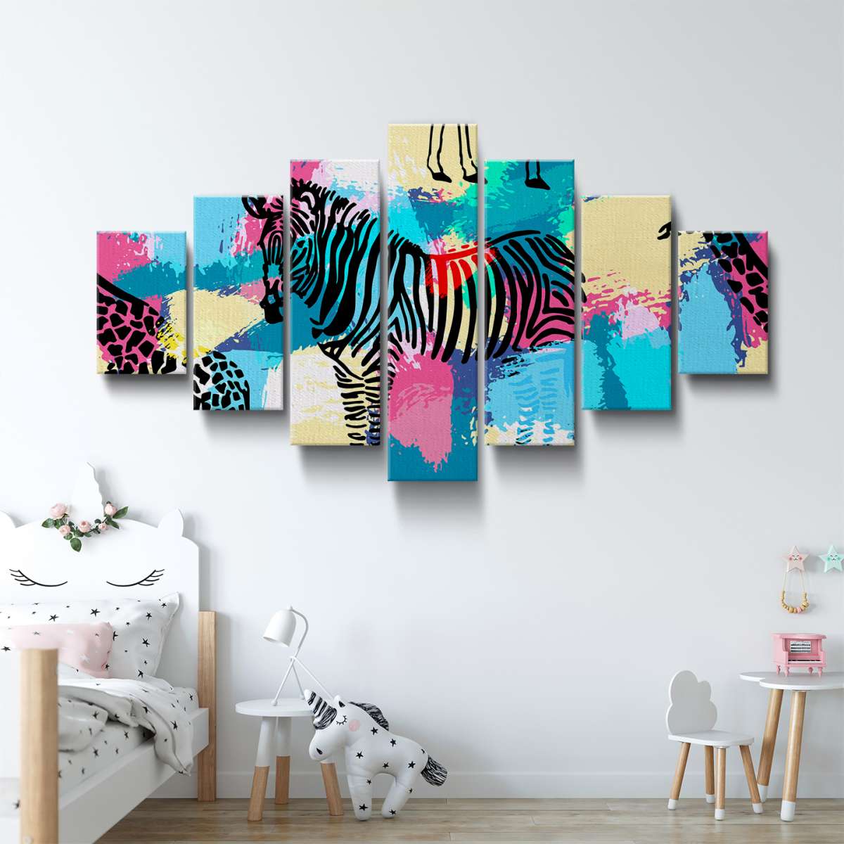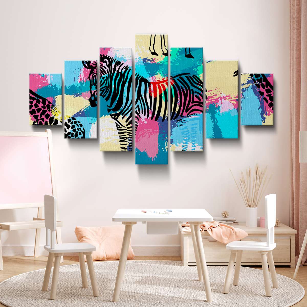 Zebry a žirafy na barevném pozadí - ilustrace