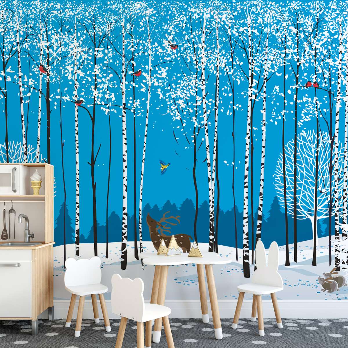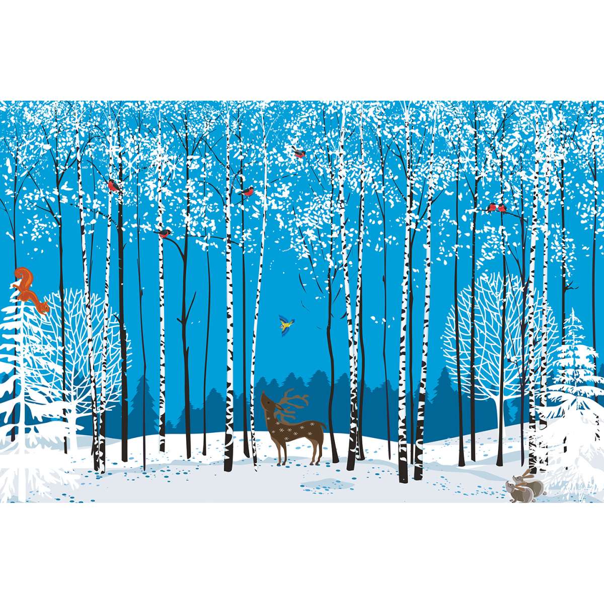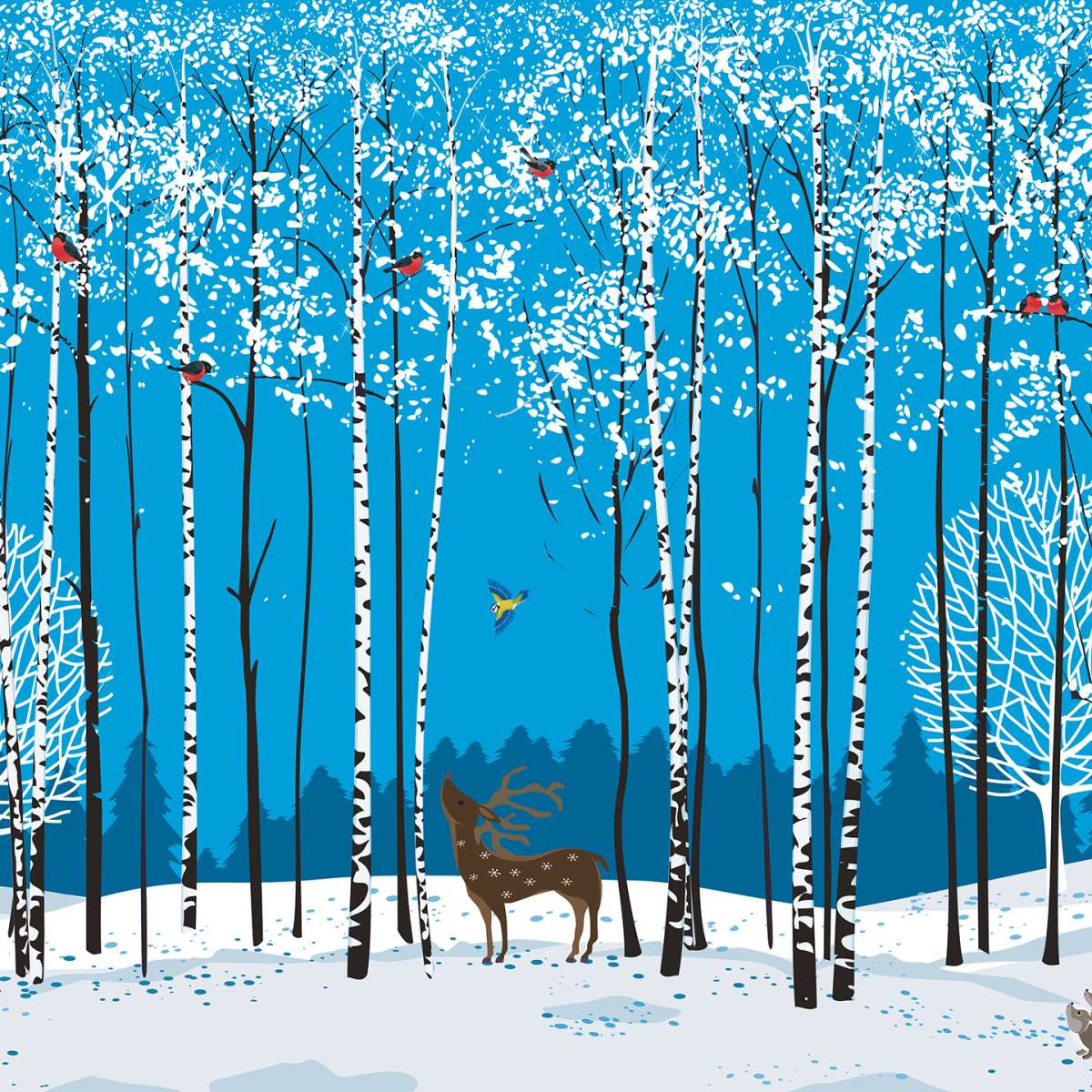 Zimní březový háj s jelenem - ilustrace